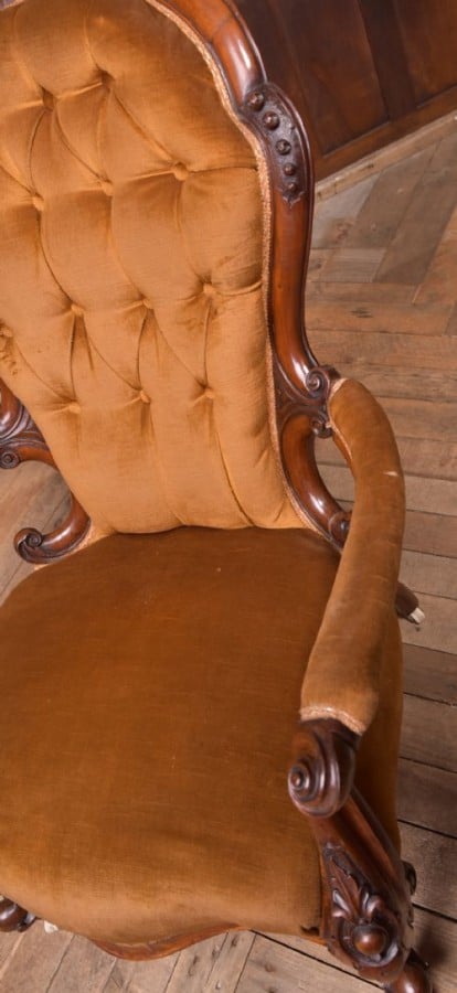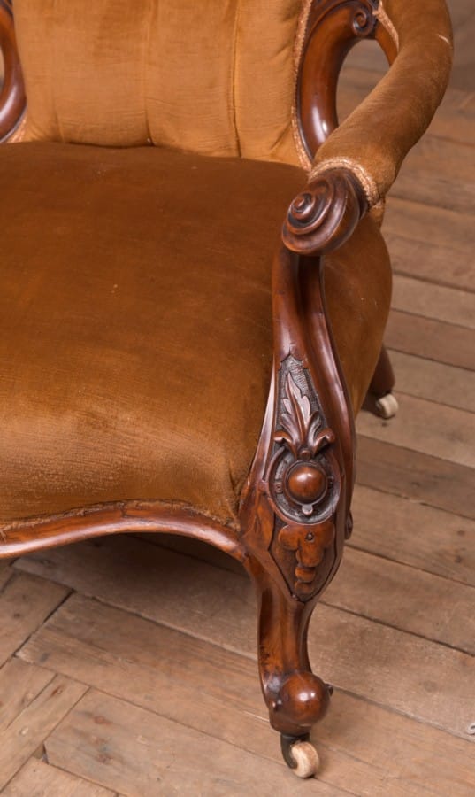 Fantastic button back parlour chair with solid walnut frame from the fabulous Victorian era. The frame is structurally in solid condition with wonderful crisp carved scrolls. Upholstered in a gold velour fabric which does show some marks however there is no rips and no buttons missing. There is some braiding missing but that could be replaced maybe with a contrasting colour to make the gold pop. Supported by beautifully carved legs at the front and splay legs at the back, terminating with white China castors. The depth of the seat and shaped back adds not only to the comfort but support as you relax. A very stylish chair that will look amazing in the right location.