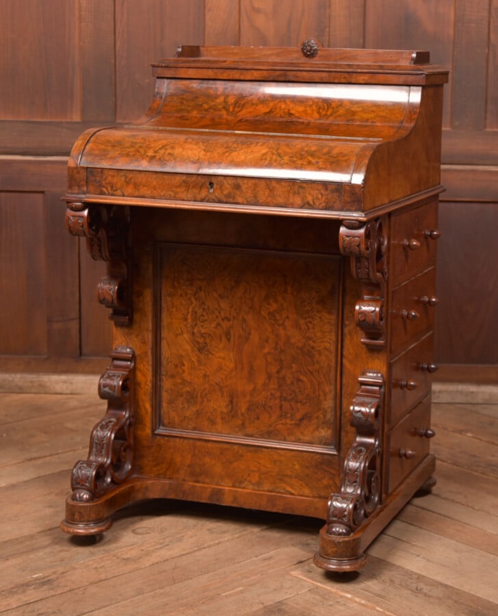 Outstanding Victorian pop up piano top davenport made from solid walnut with stunning burr walnut veneers. It’s pop up top interior is made of satin wood and compartmentalized to accommodate paper and envelopes. The piano shaped top lifts to reveal an interior consisting of the original green leather adjustable angled writing surface, 2 small satin wood drawers which conceal a hidden release mechanism for the pop up top, an ebonised pen tray and compartment for two ink pot. To the right there are a bank of four dovetailed graduated drawers, to the left matching dummy drawers all with original turned handles. Panelled and veneered to the back means it can be free standing in the room. In excellent condition with wonderful colouring and amazing patination ready to be put straight into home / office.