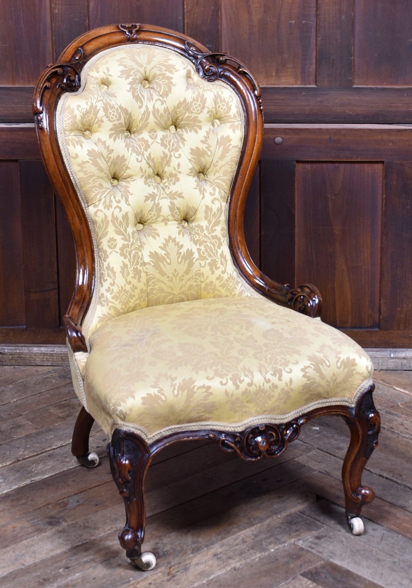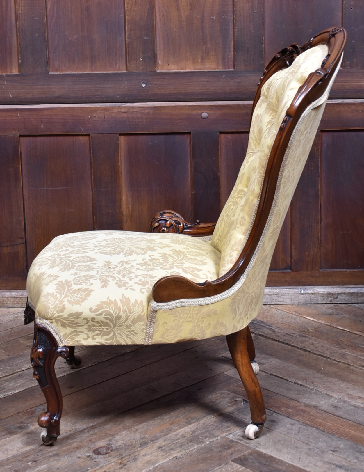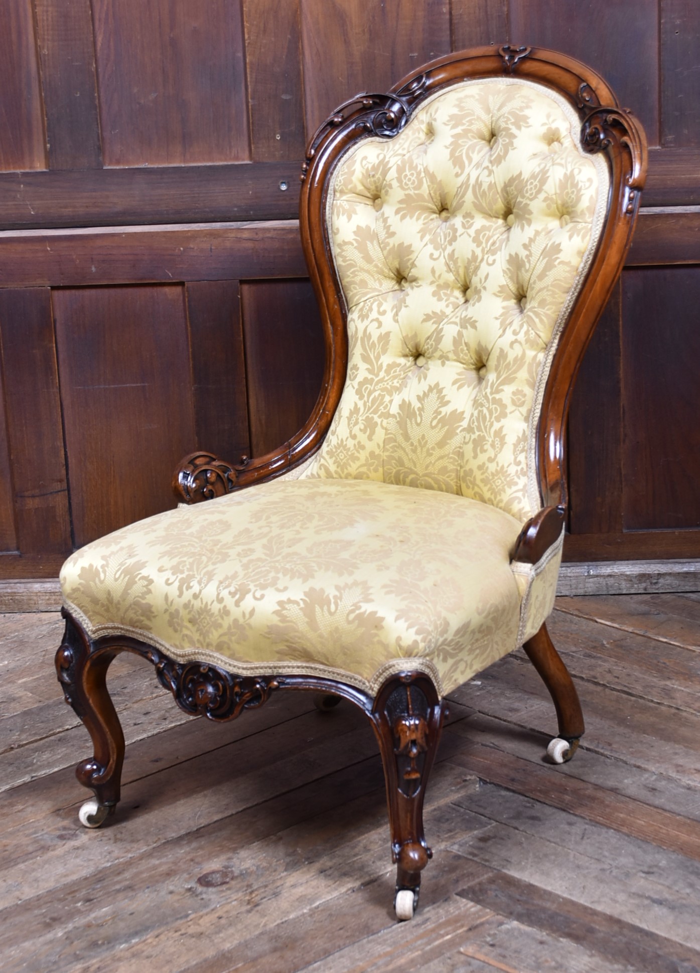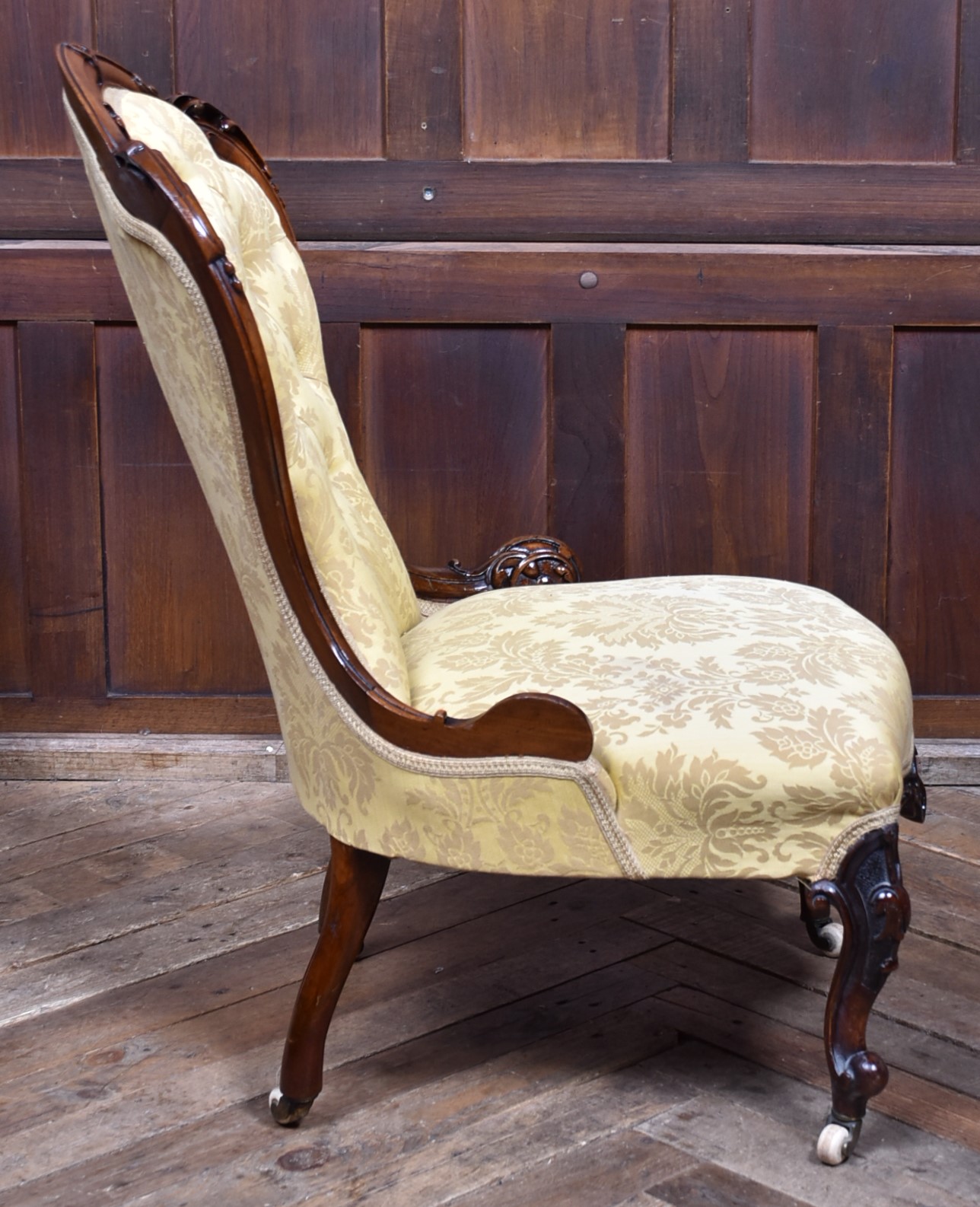 A graceful Victorian walnut spoon-back nursing chair with elegant proportions and richly carved detail. The seat and back are upholstered in a clean patterned damask that pairs beautifully with the warmth of the timber. The walnut frame is finely carved and reassuringly solid, with no creaks or movement. Retaining its original casters for easy positioning, it is a charming and inviting piece that brings a gentle note of Victorian elegance to any interior.
