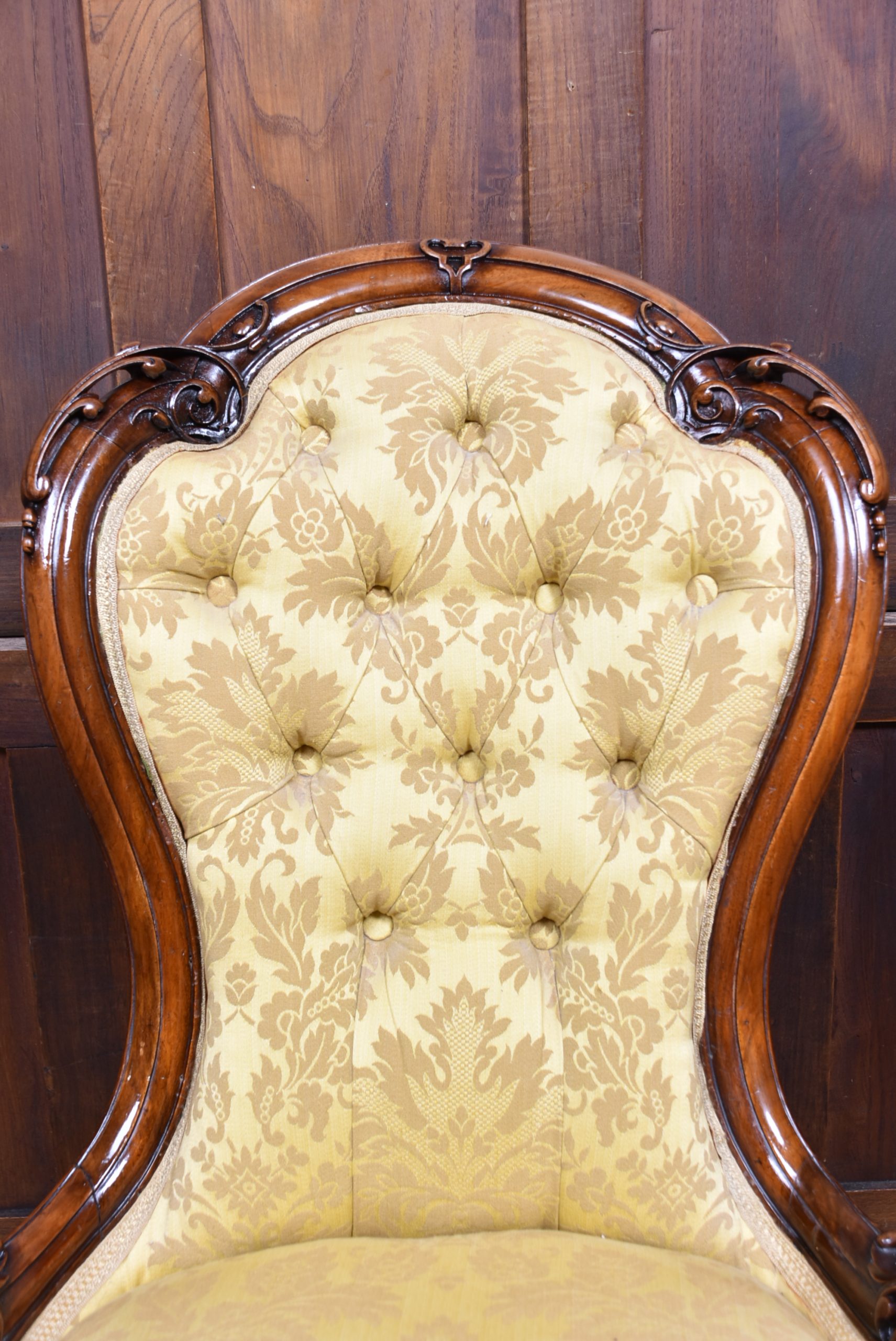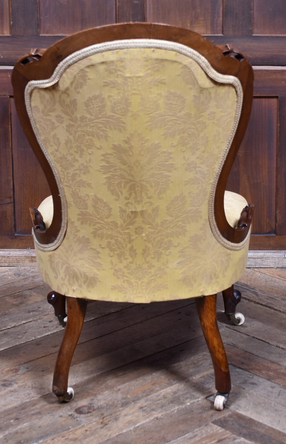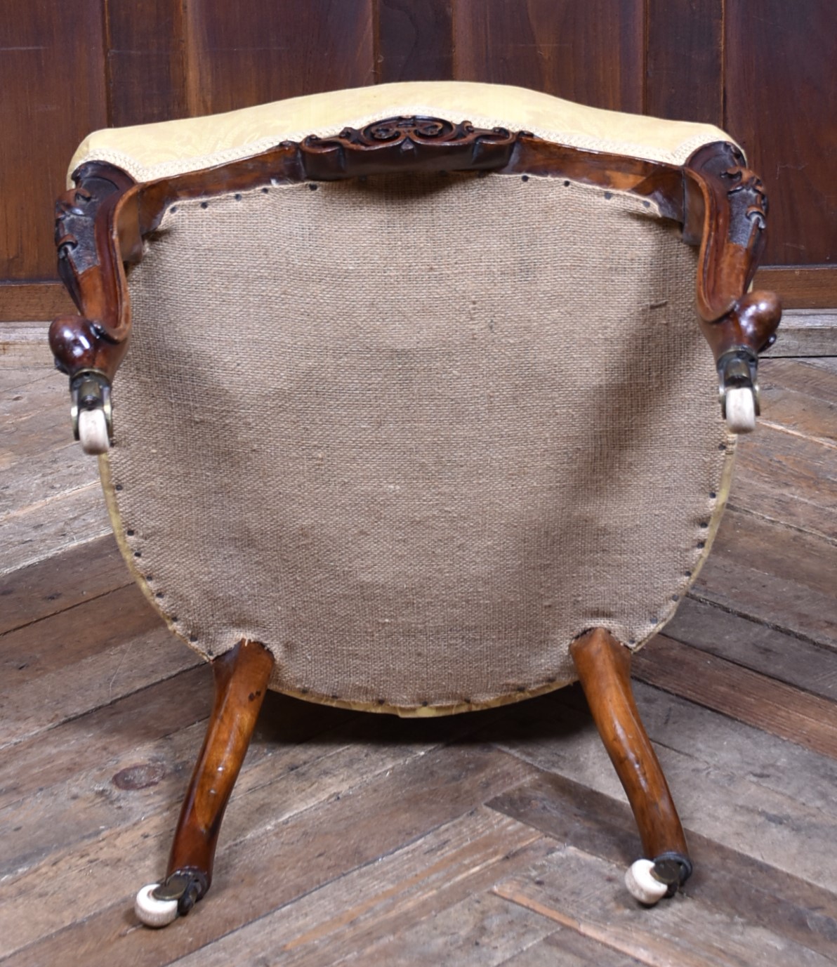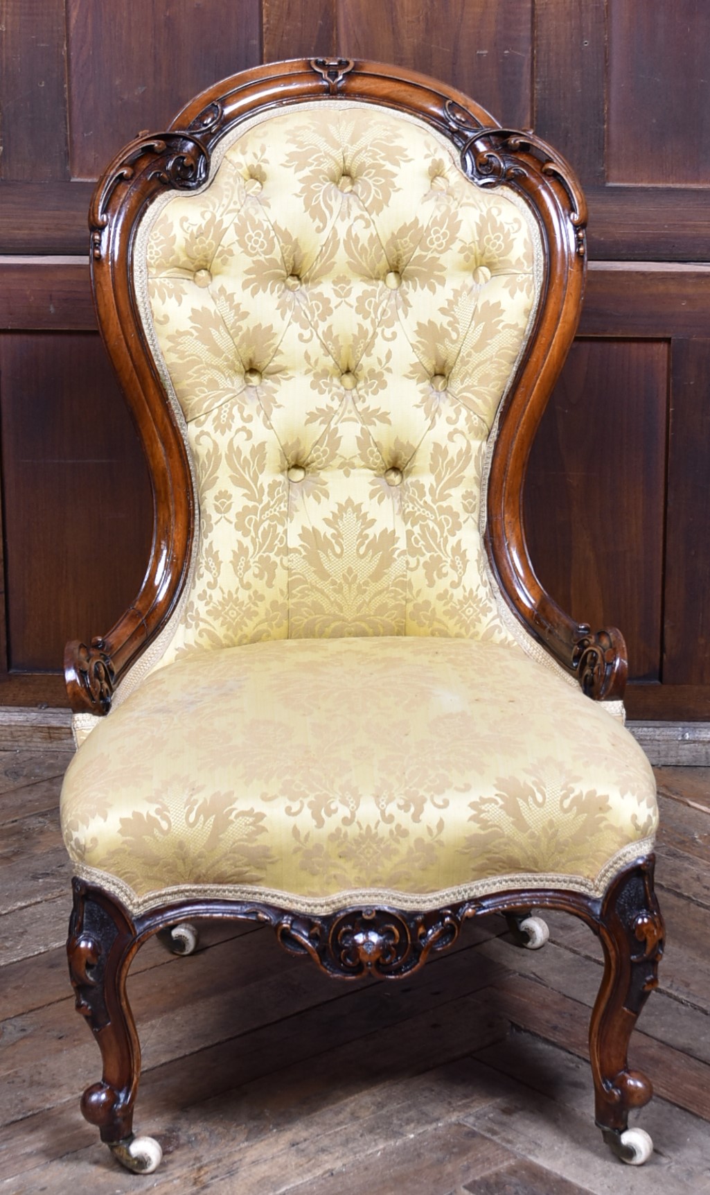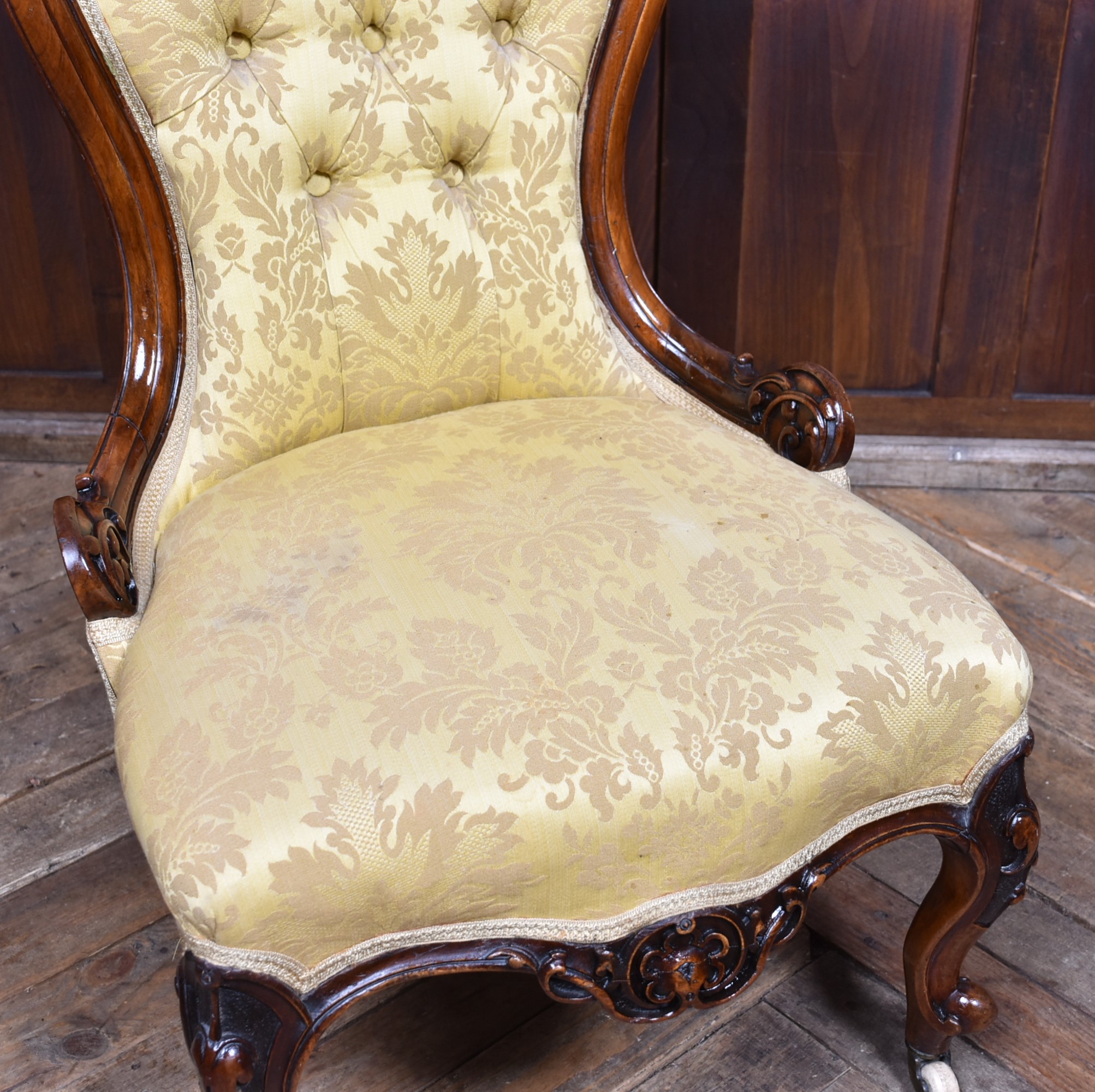 A graceful Victorian walnut spoon-back nursing chair with elegant proportions and richly carved detail. The seat and back are upholstered in a clean patterned damask that pairs beautifully with the warmth of the timber. The walnut frame is finely carved and reassuringly solid, with no creaks or movement. Retaining its original casters for easy positioning, it is a charming and inviting piece that brings a gentle note of Victorian elegance to any interior.