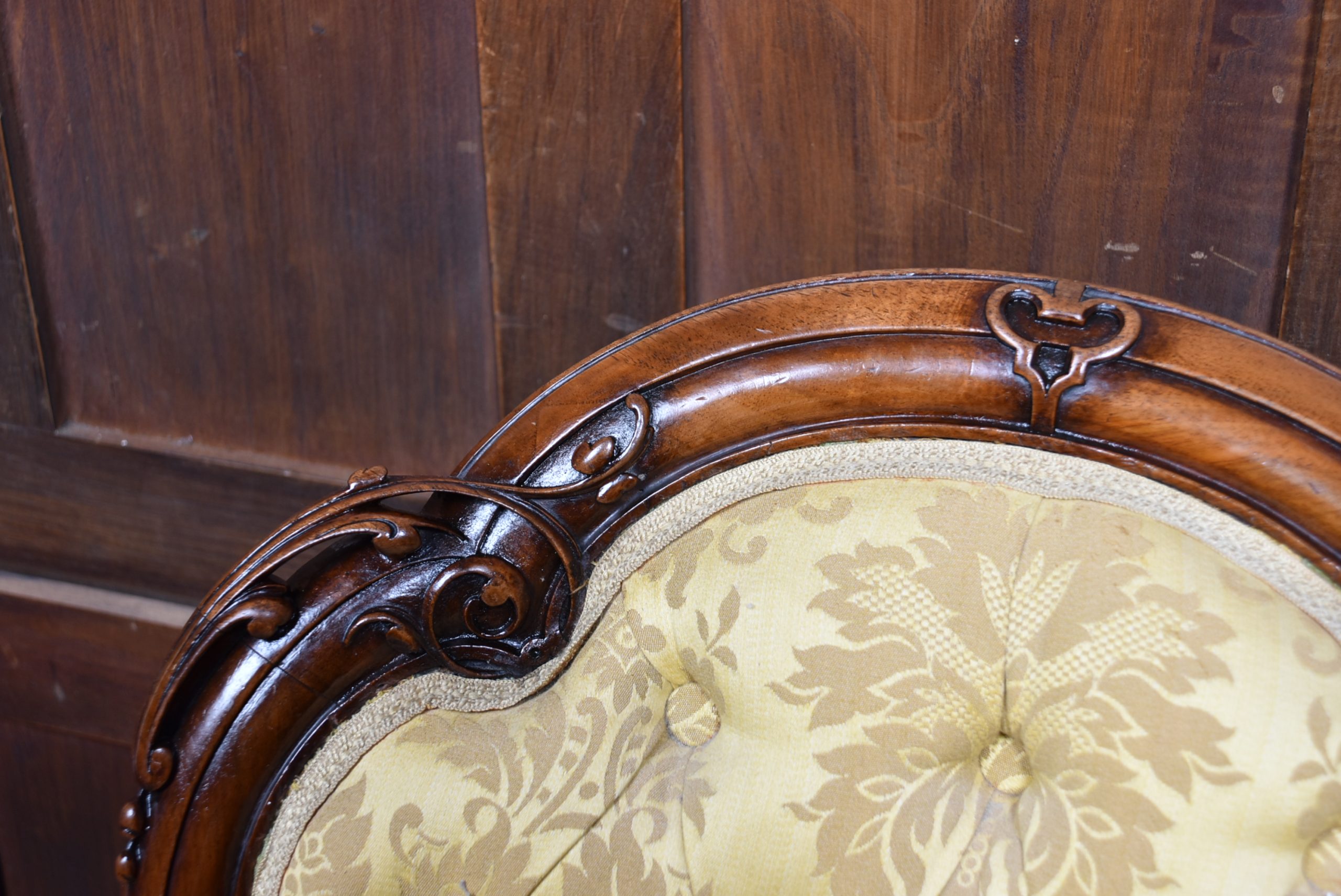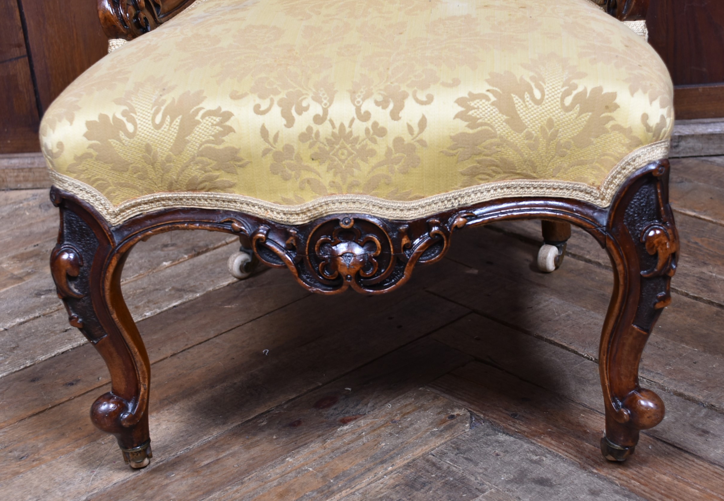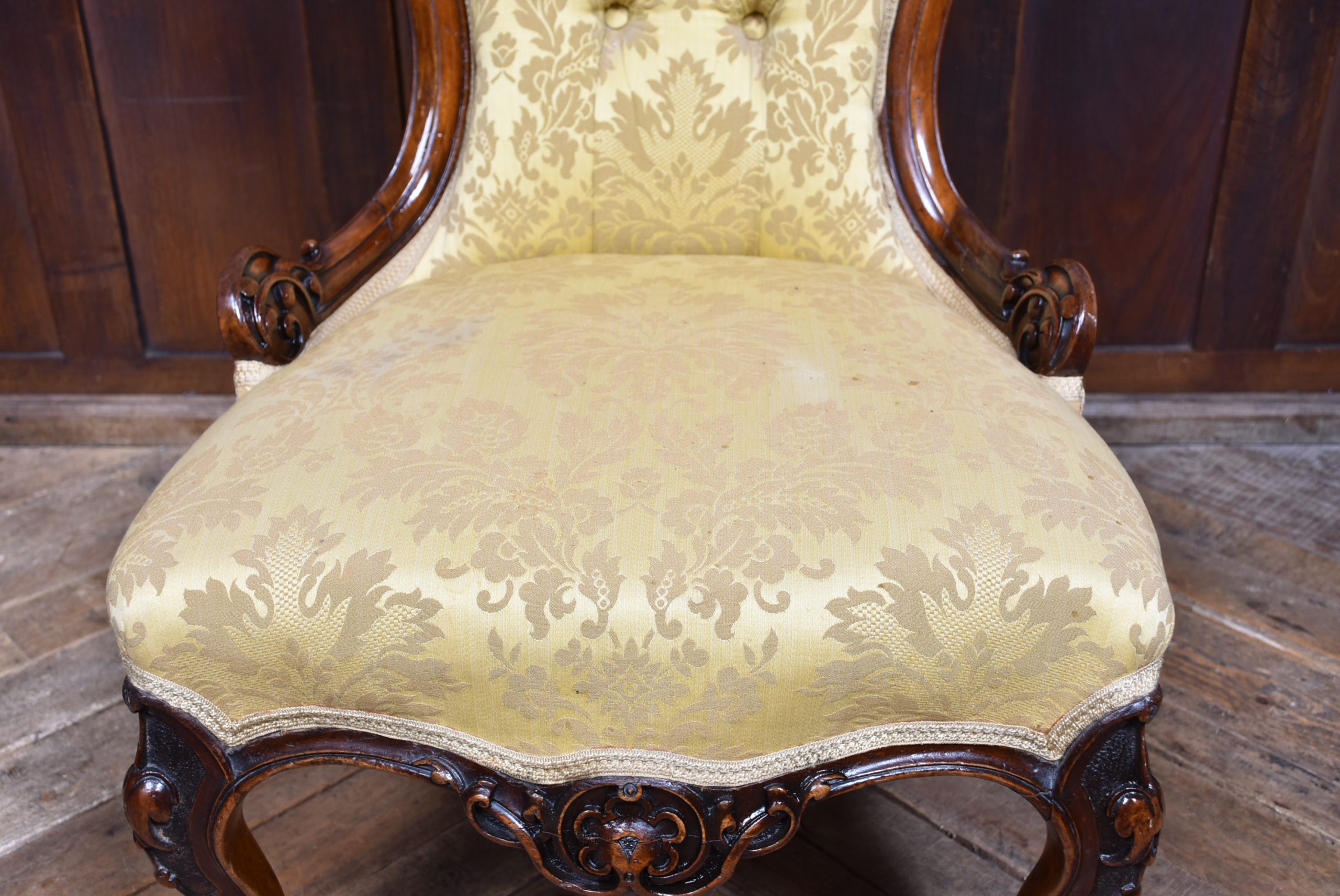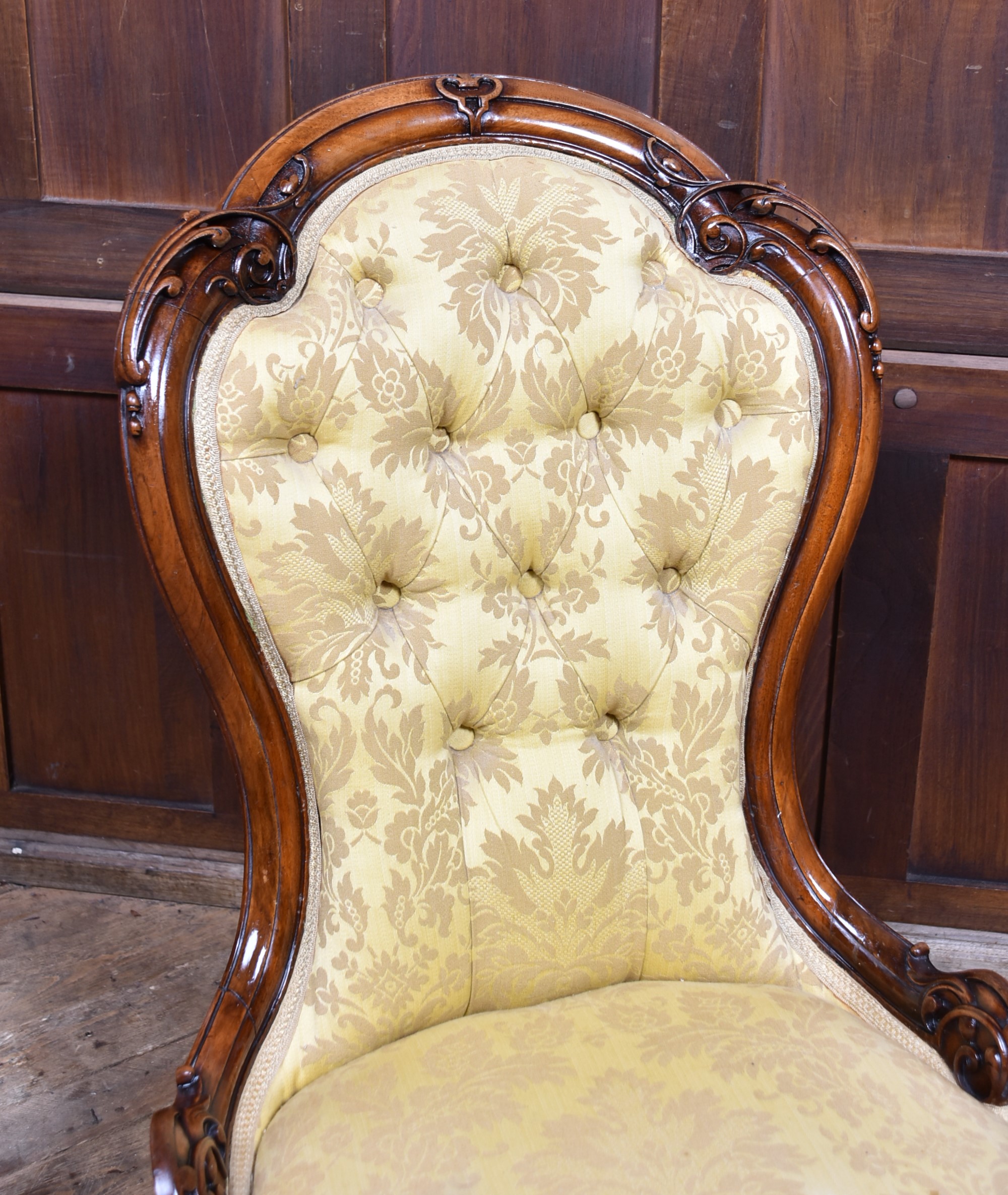 A graceful Victorian walnut spoon-back nursing chair with elegant proportions and richly carved detail. The seat and back are upholstered in a clean patterned damask that pairs beautifully with the warmth of the timber. The walnut frame is finely carved and reassuringly solid, with no creaks or movement. Retaining its original casters for easy positioning, it is a charming and inviting piece that brings a gentle note of Victorian elegance to any interior.
