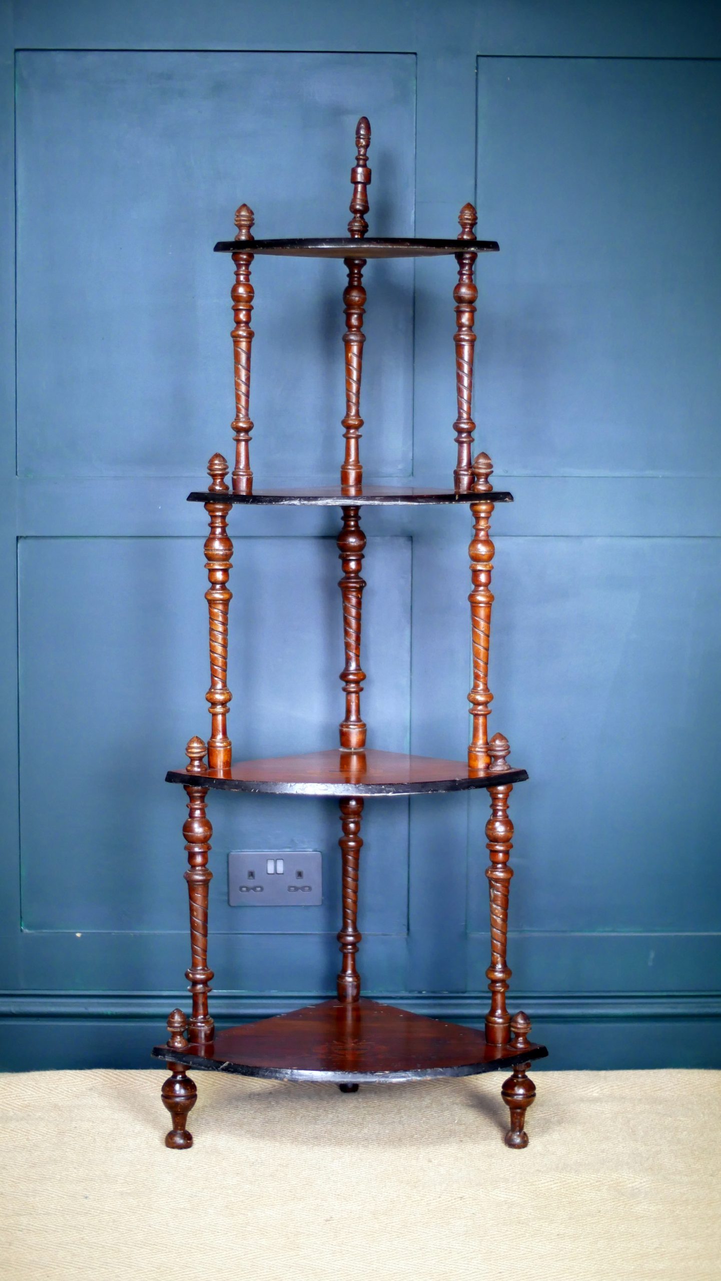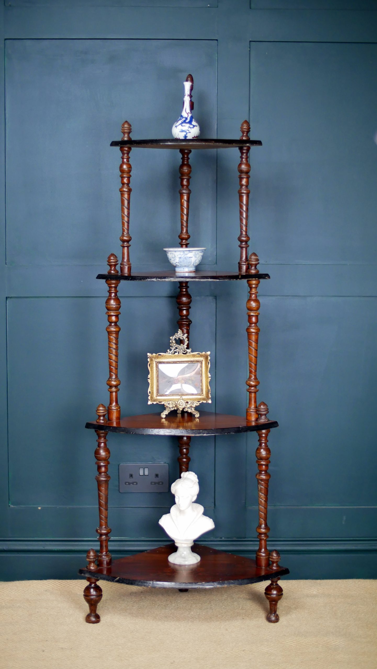 Discover the quintessence of 19th-century charm with this exquisite Victorian corner whatnot. Designed to transform an overlooked corner into a gallery of architectural beauty, this piece is a celebration of the intricate craftsmanship and ornamental flair that defined the era.