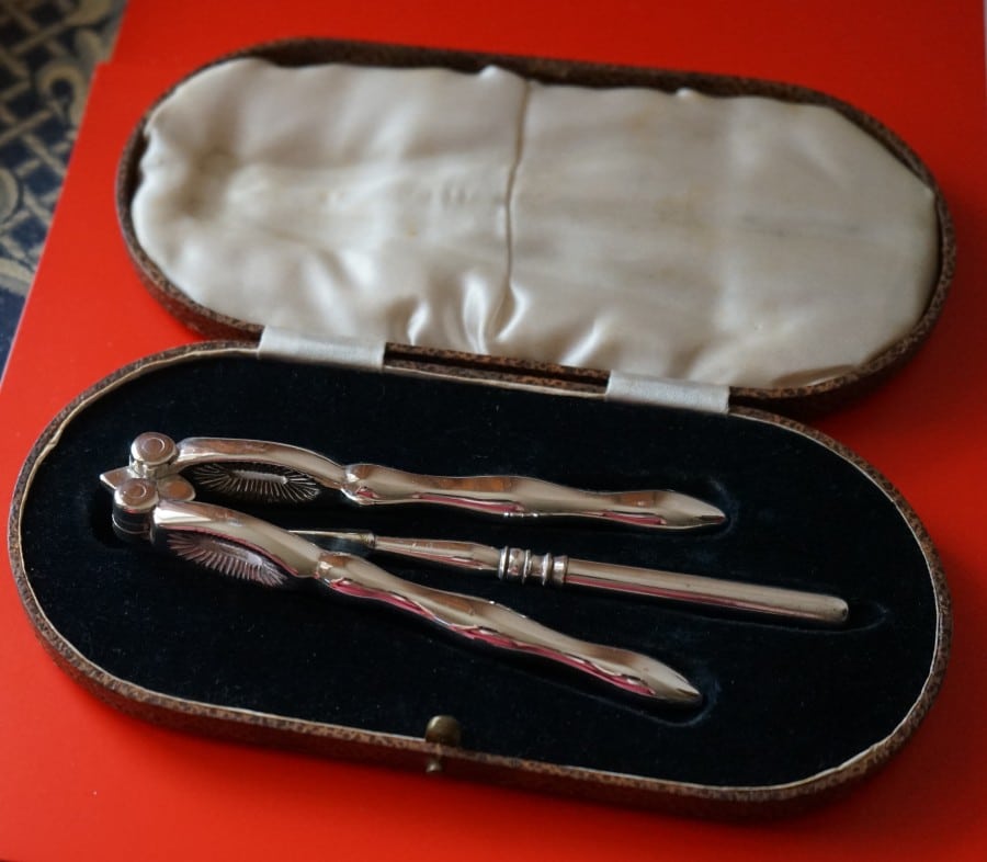 Vintage 1920s Electro Plated Nut Crackers & Nut Pick Boxed Set