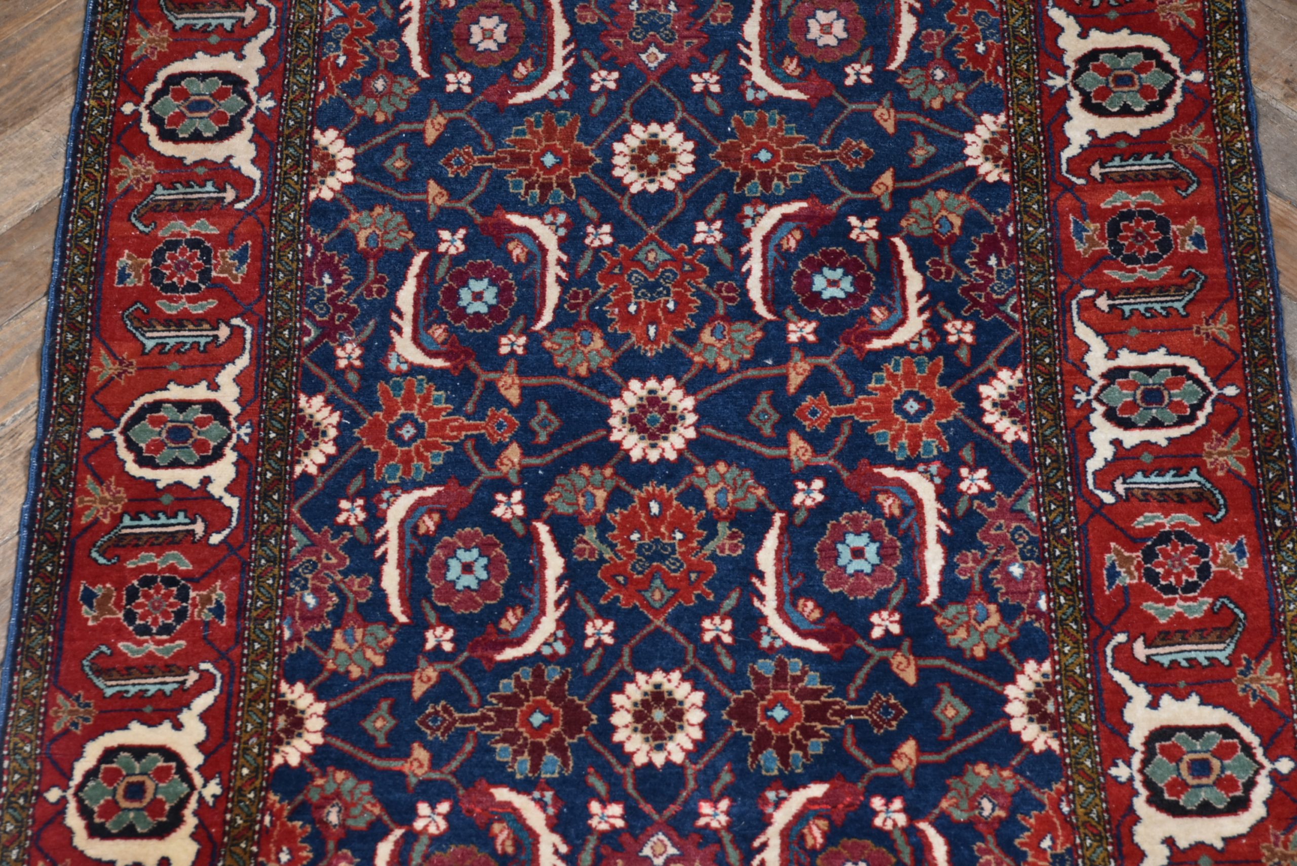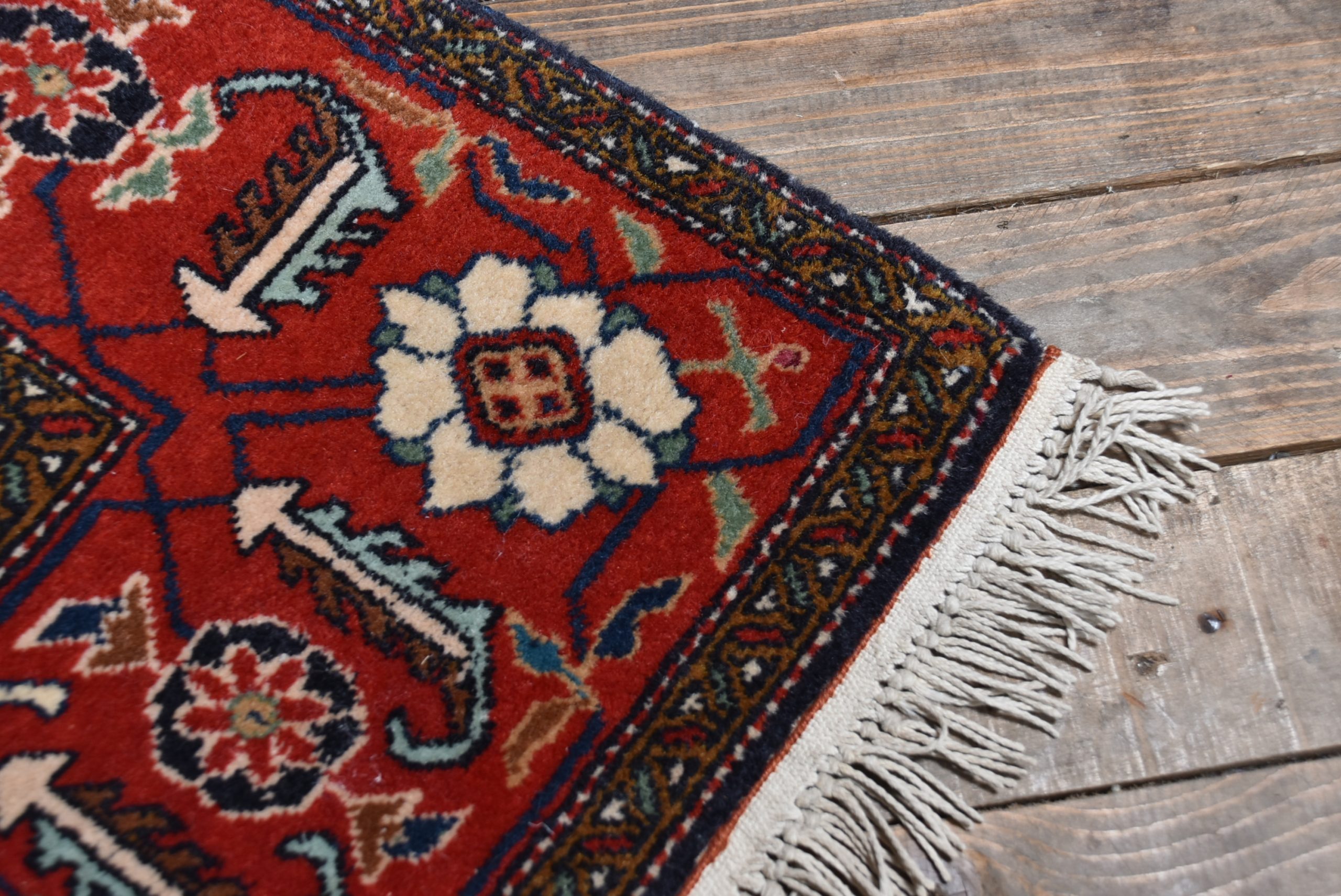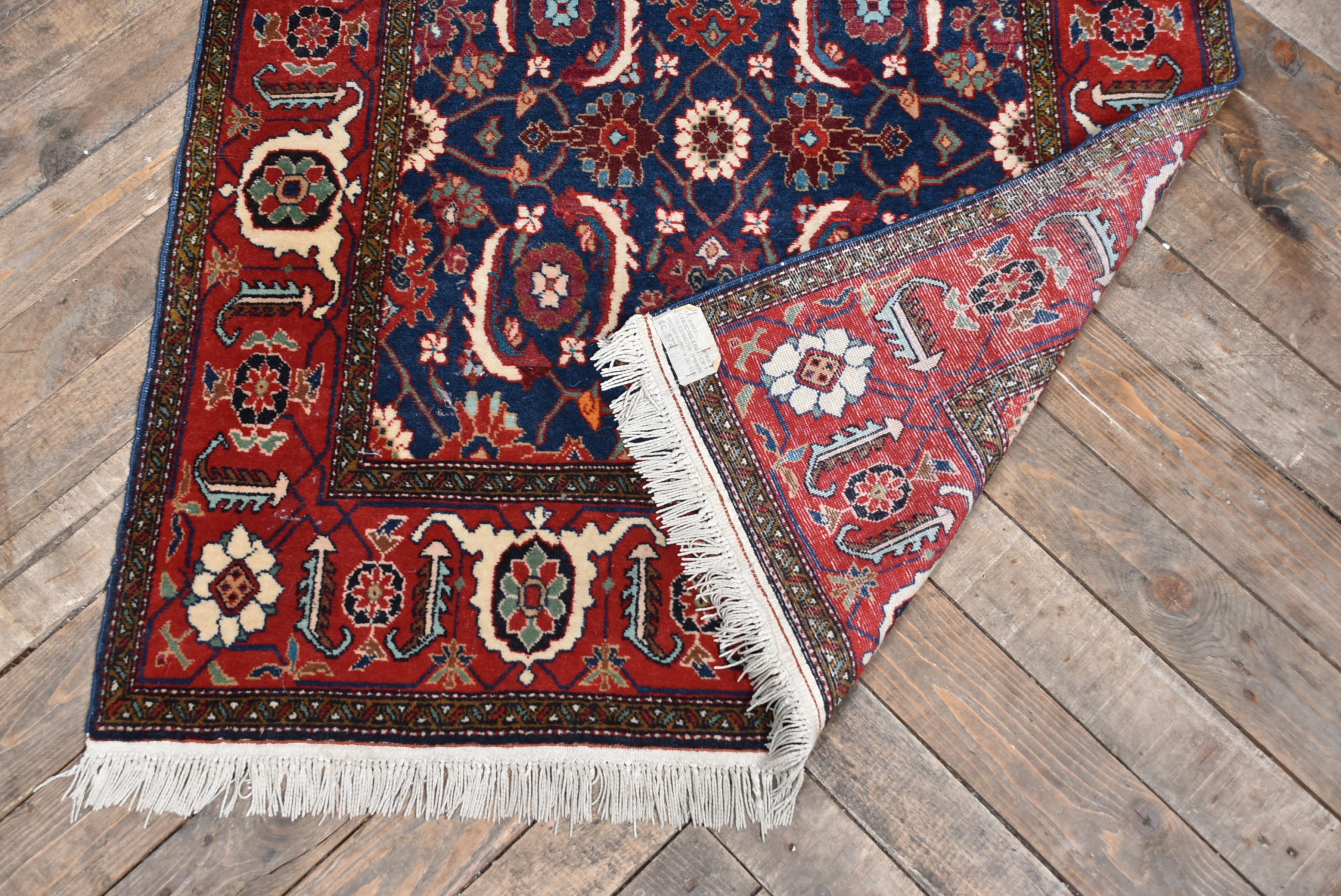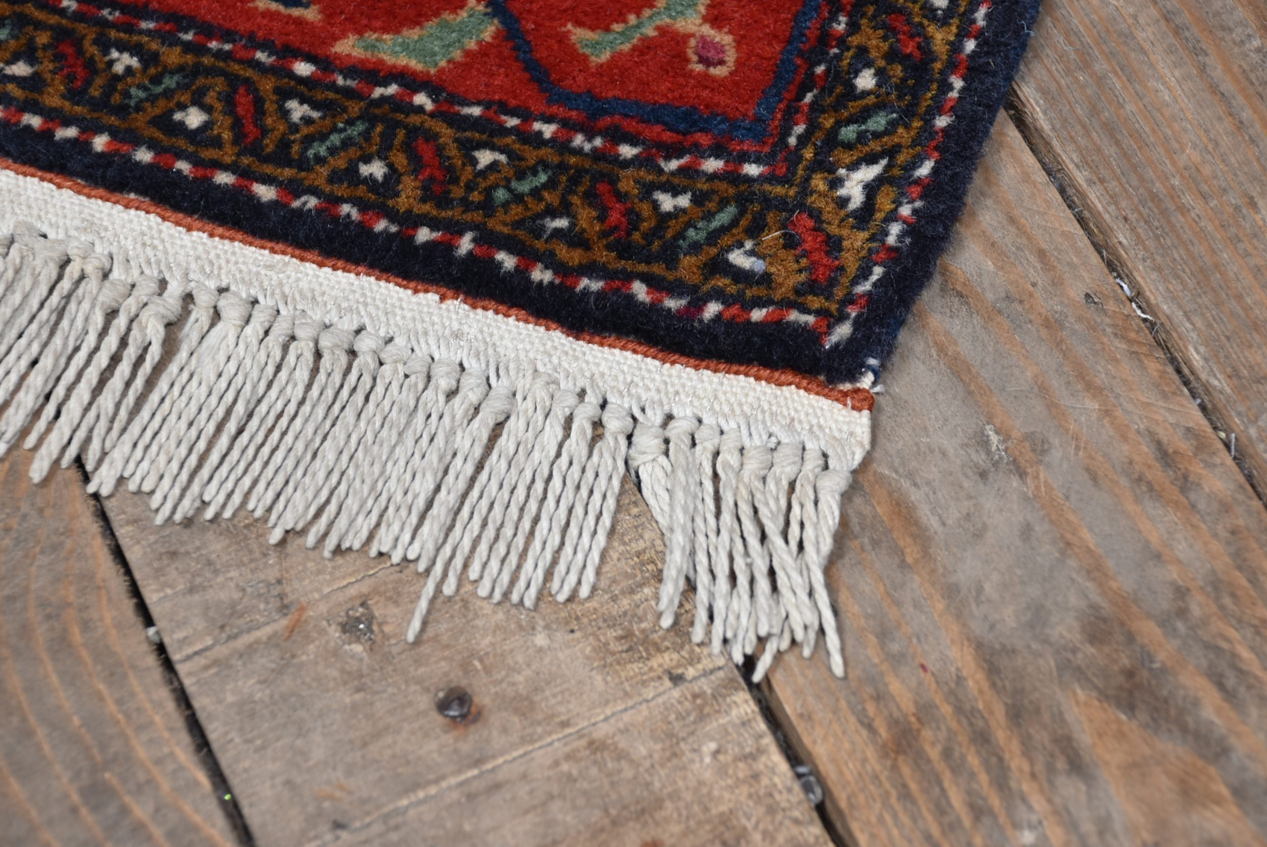 A striking Azerbaijani rug showcasing the region’s renowned craftsmanship and vibrant design tradition. The central field is rendered in deep indigo, adorned with symmetrical floral and geometric motifs in rich tones of red, white, and green. These intricate patterns are framed by a bold red border featuring repeating stylised elements, lending the piece a strong visual rhythm. Handwoven using traditional techniques, the rug is finished with fringed ends and displays a harmonious balance of colour and form. Its palette and patterning suggest origins in the Kazakh or Shirvan weaving traditions, known for their bold contrasts and symbolic motifs. This rug would make a stunning floor piece or wall hanging, offering both decorative appeal and cultural depth.