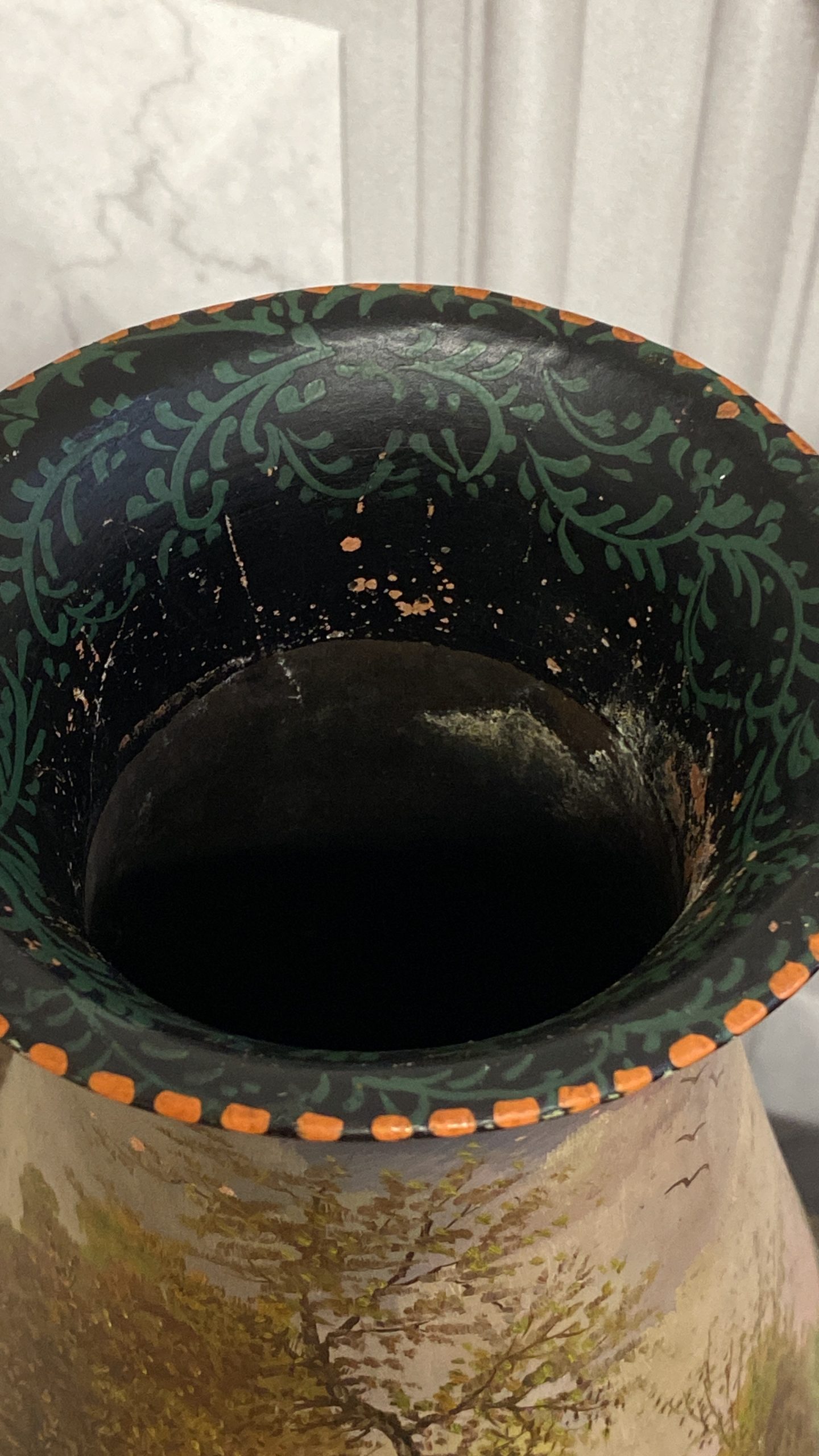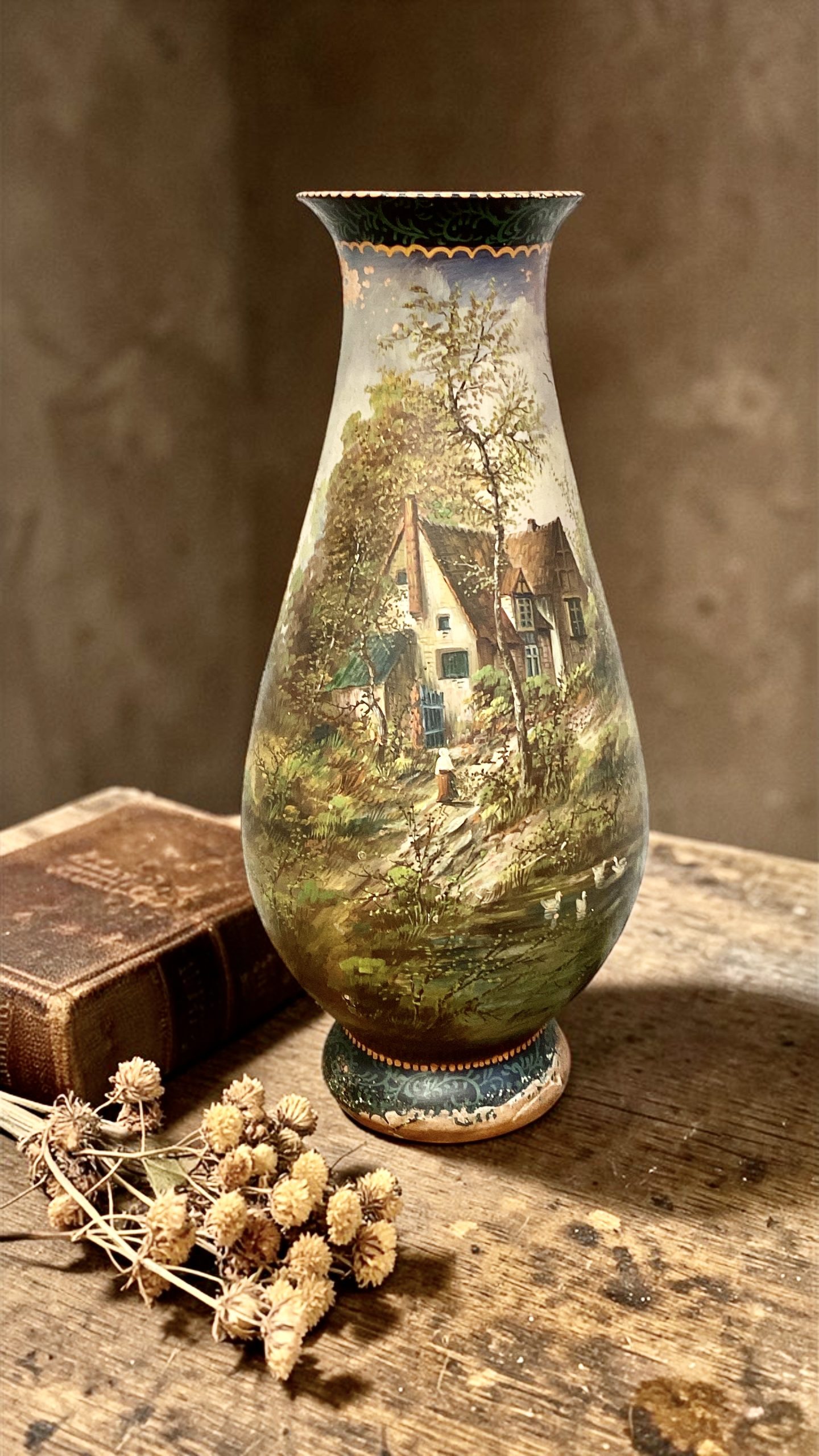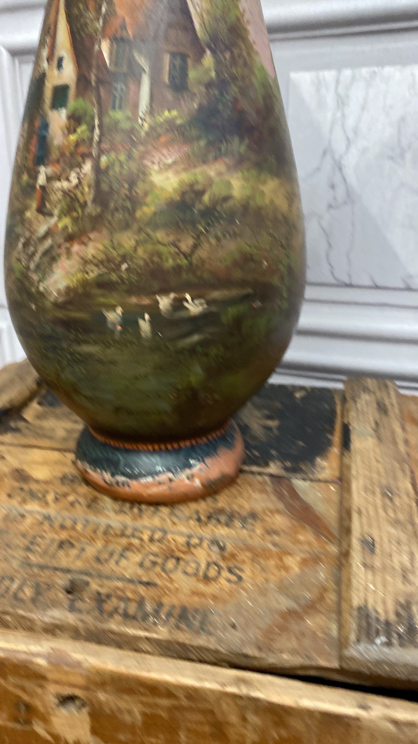 Main body of vase is chip free and the artwork is in nice condition. The only issue with the vase is a loss of artwork to a section of the base and section on neck,but nothing to distract from what is a very pleasing item.