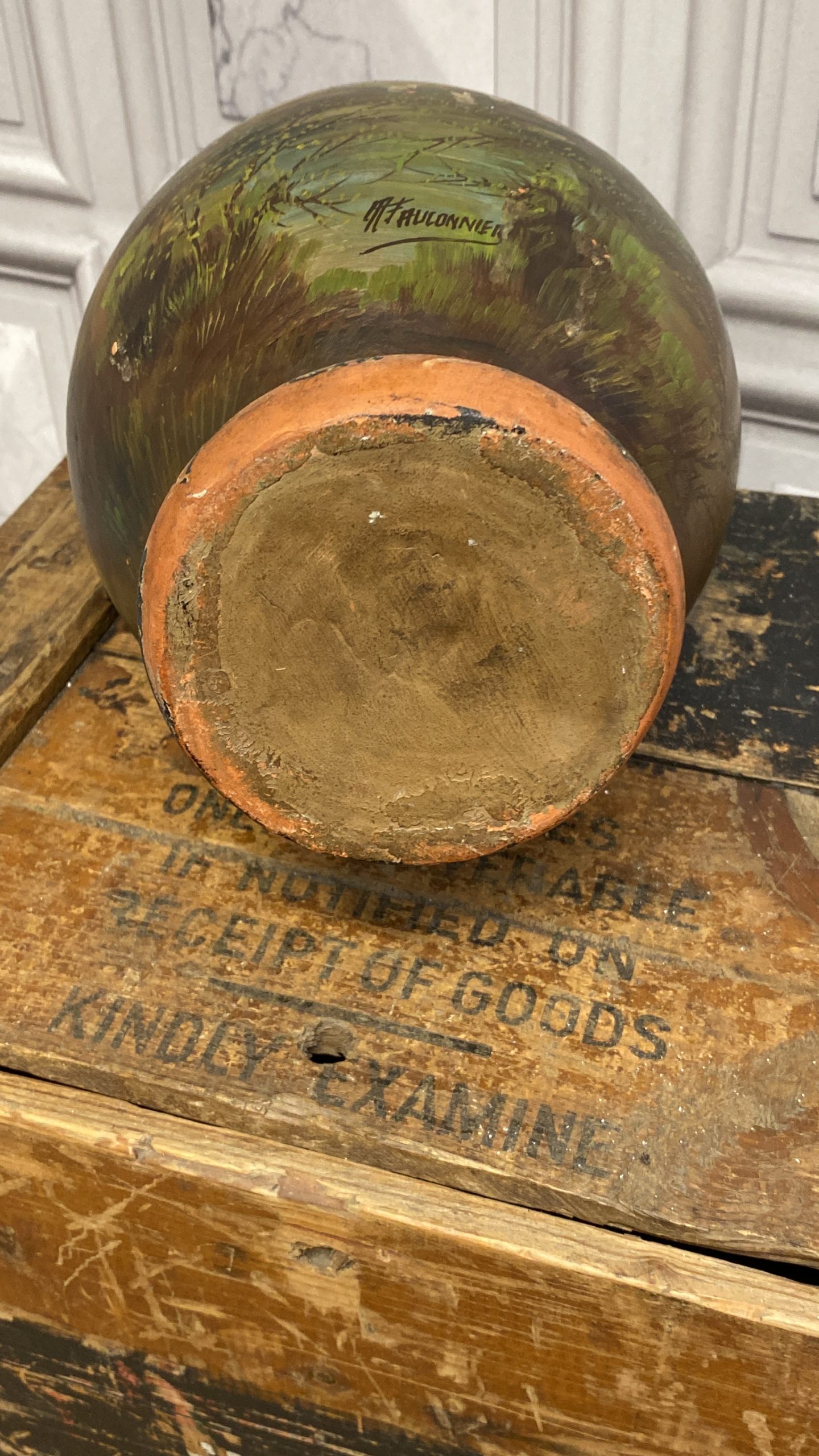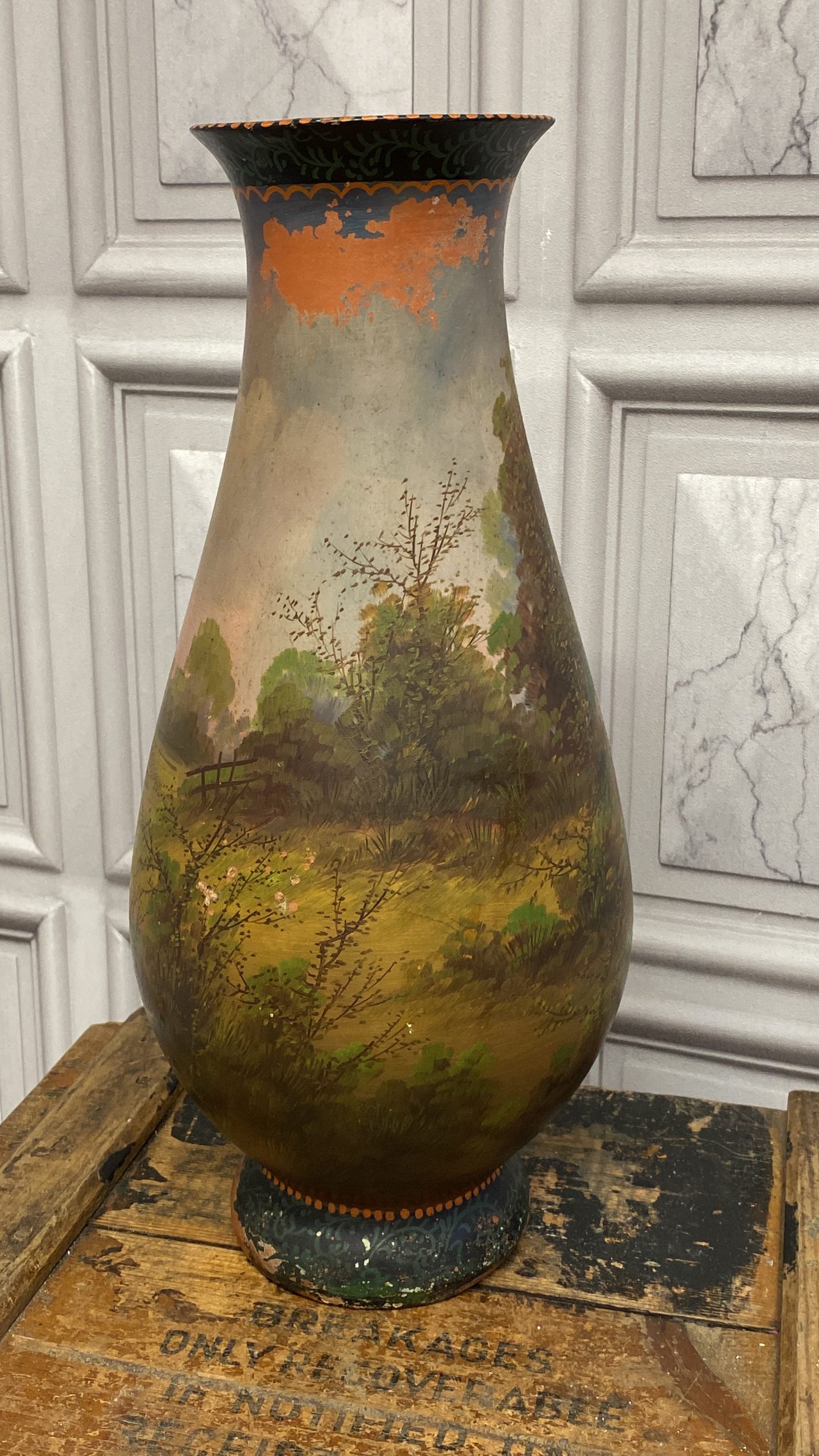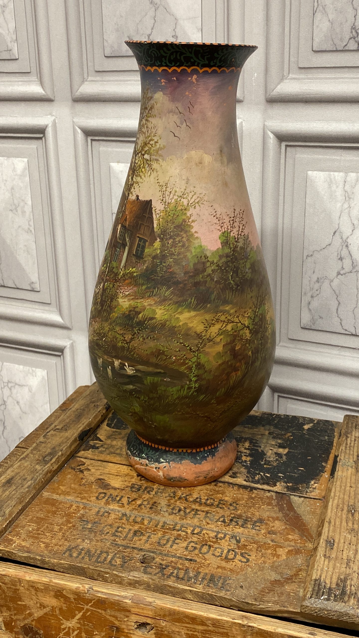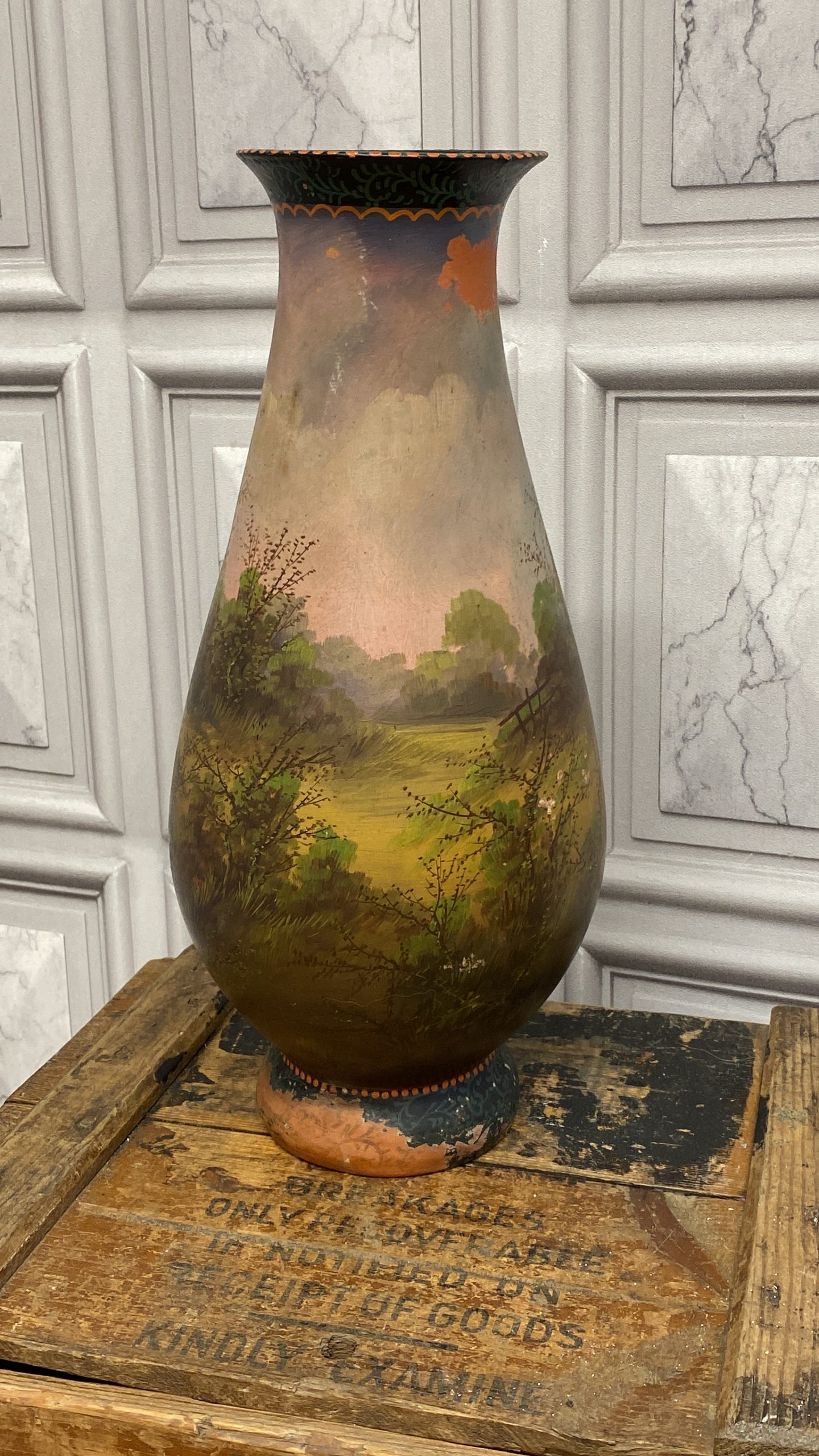 A late 19th Century French terracotta pear-shaped vase, cold painted with a cottage and figure in a woodland landscape WITH sunset colours signed H Fauconnier, 41cms high.