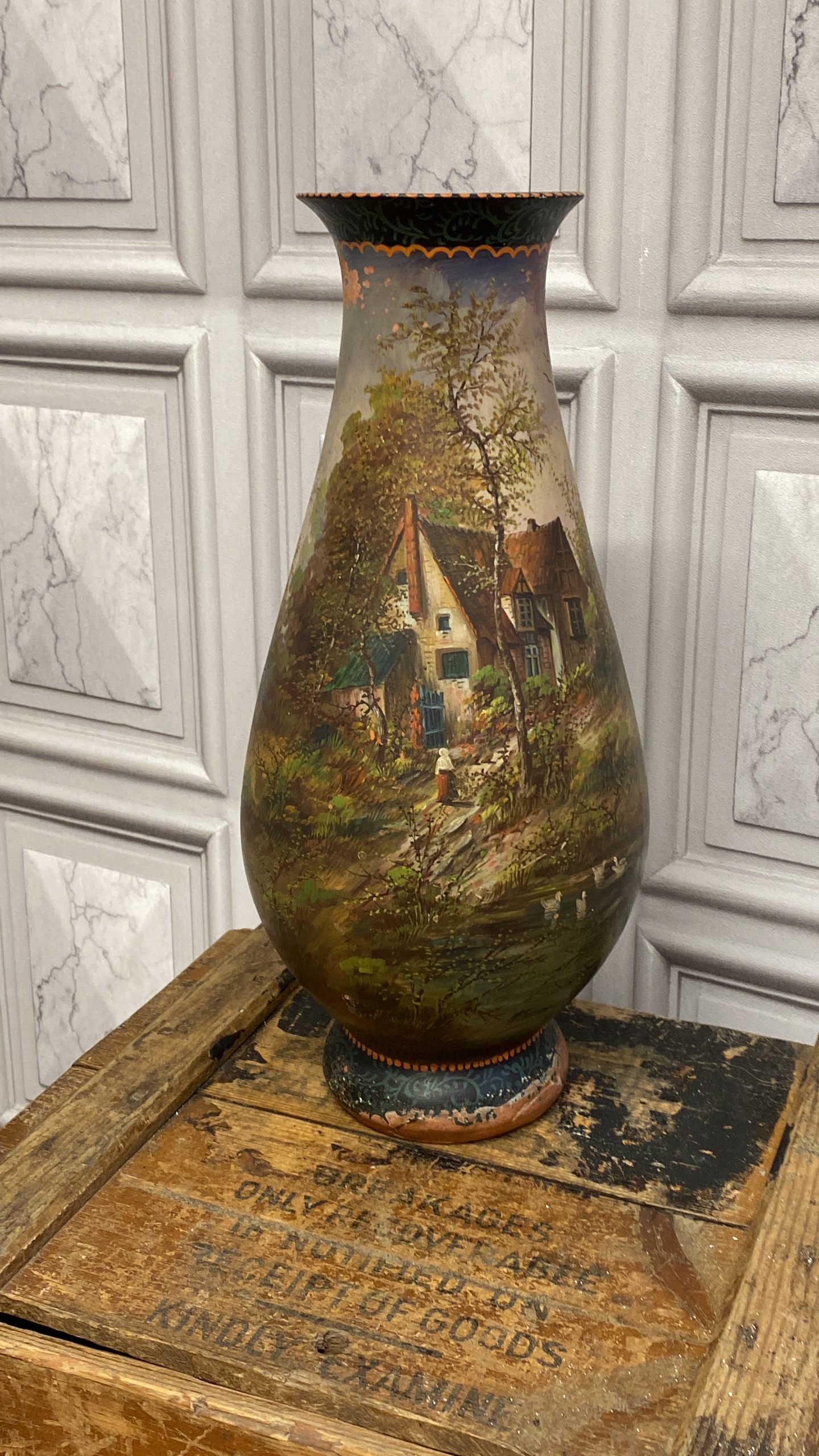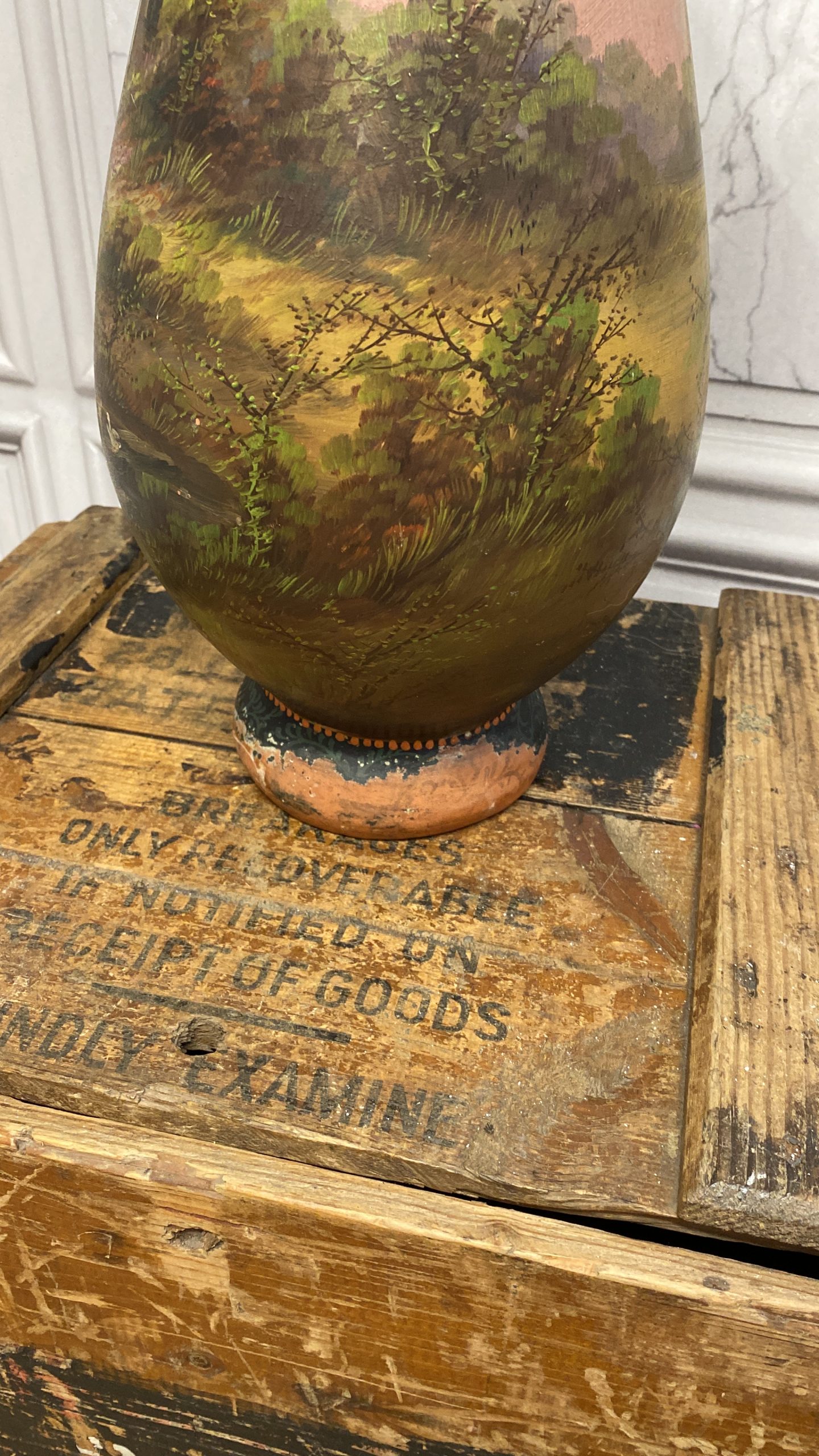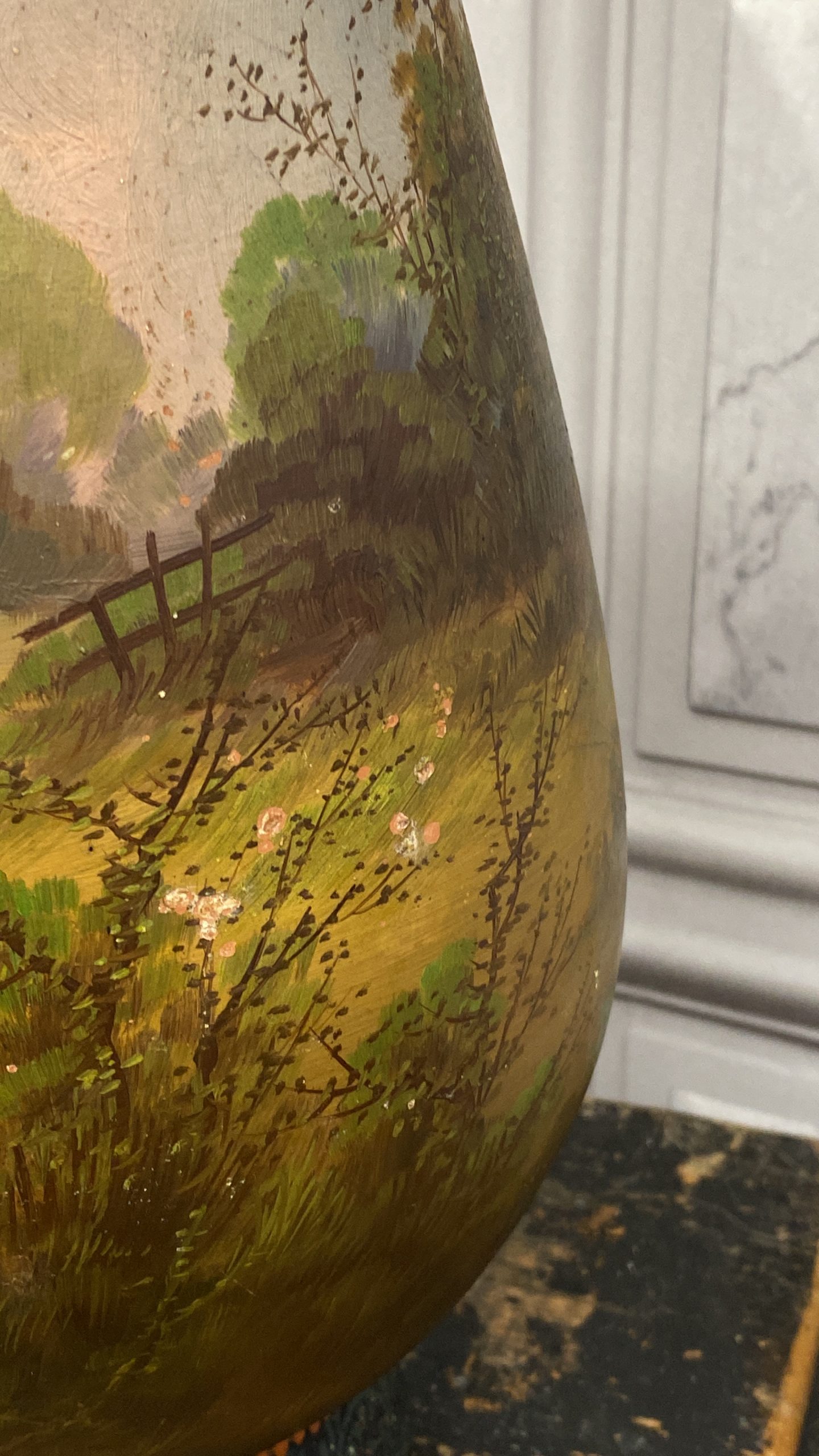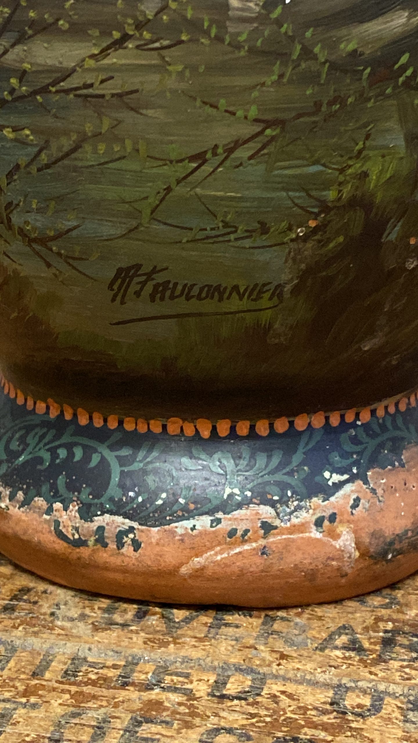 A late 19th Century French terracotta pear-shaped vase, cold painted with a cottage and figure in a woodland landscape WITH sunset colours signed H Fauconnier, 41cms high.