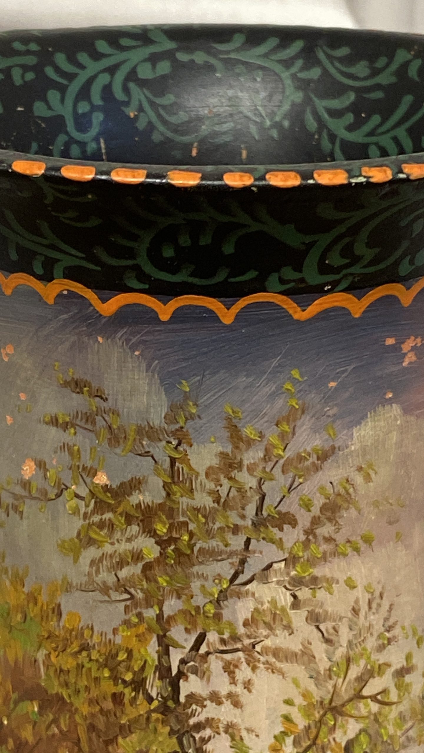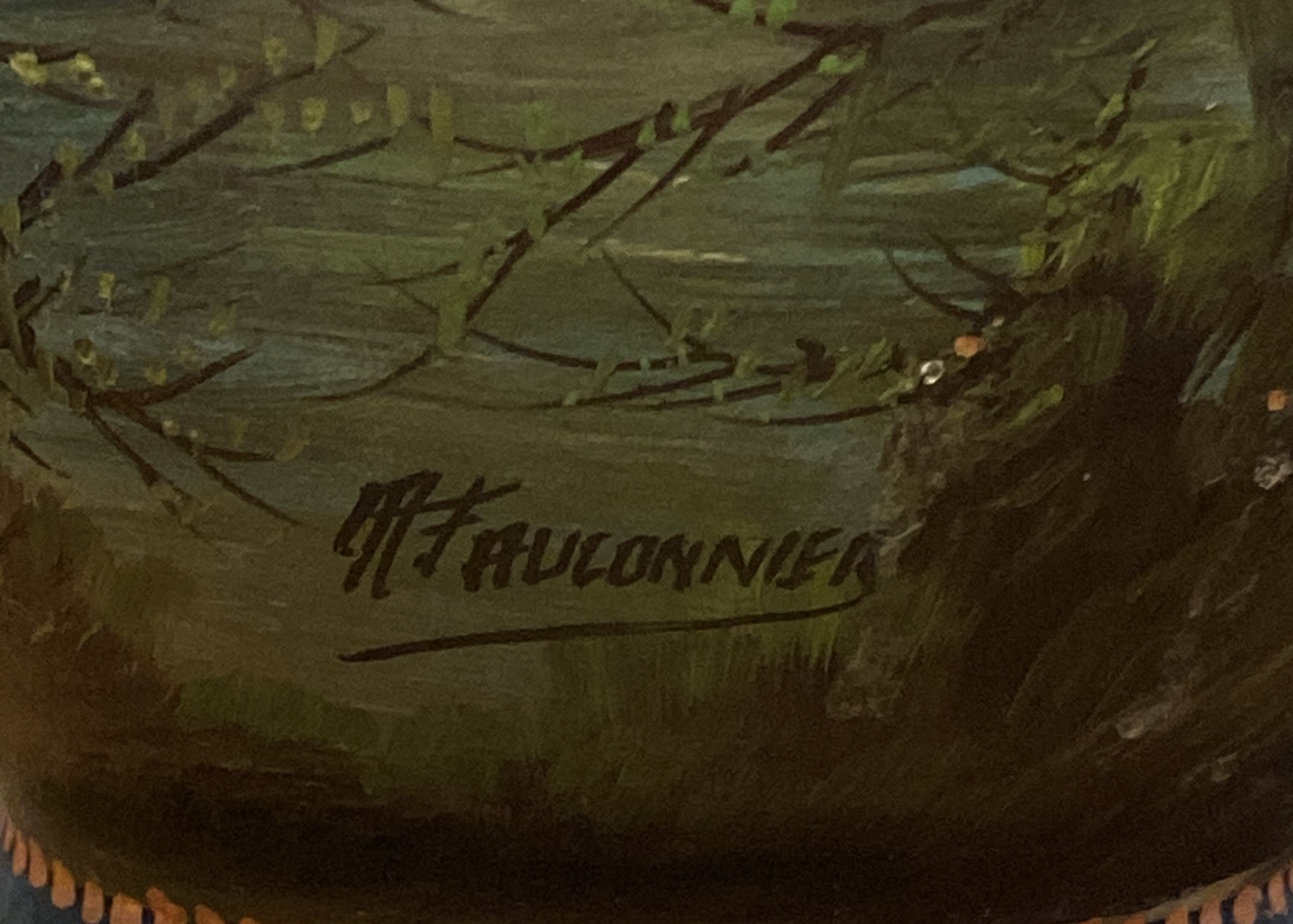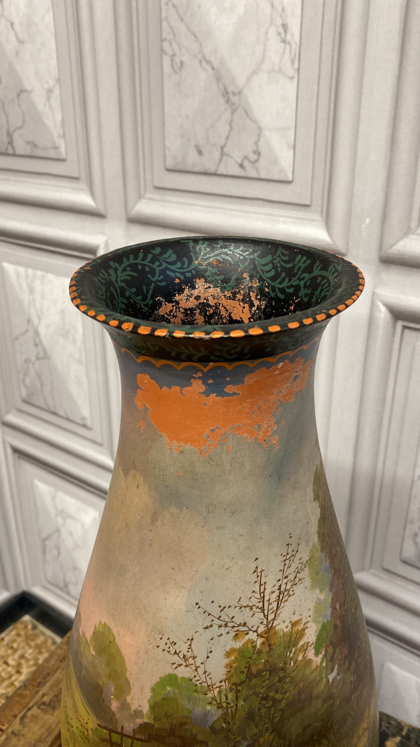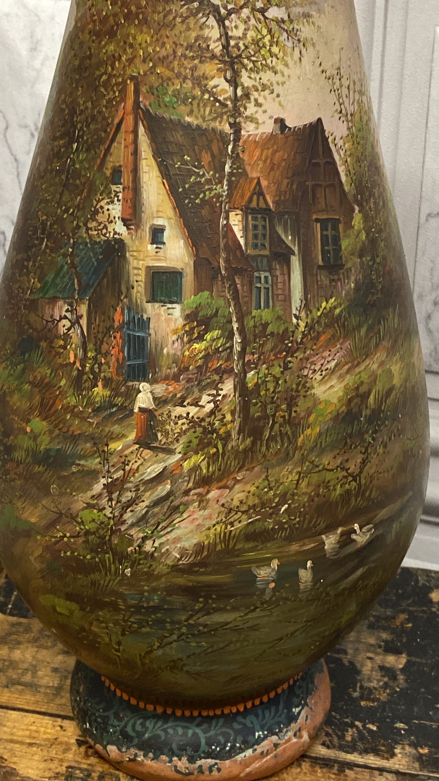 A late 19th Century French terracotta pear-shaped vase, cold painted with a cottage and figure in a woodland landscape WITH sunset colours signed H Fauconnier, 41cms high.