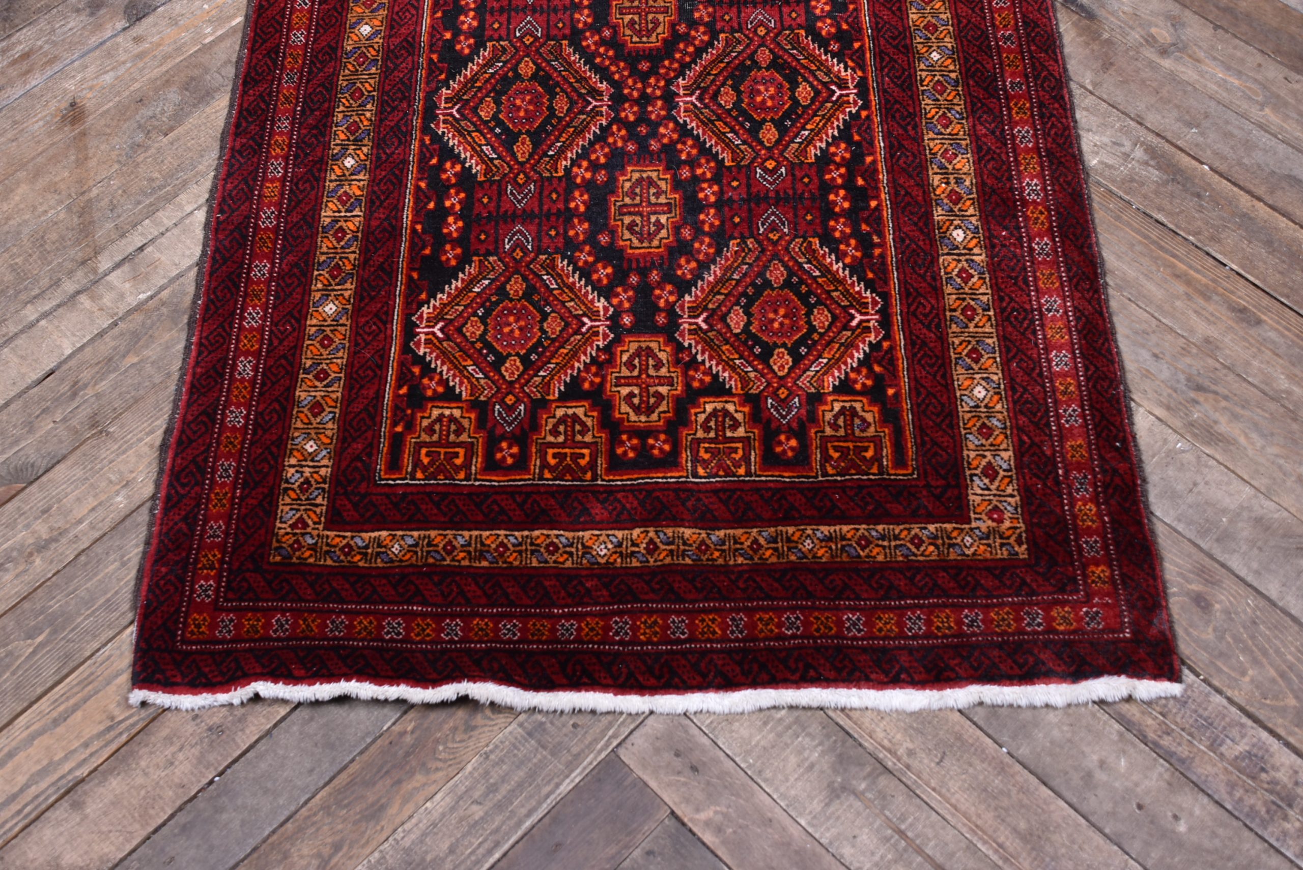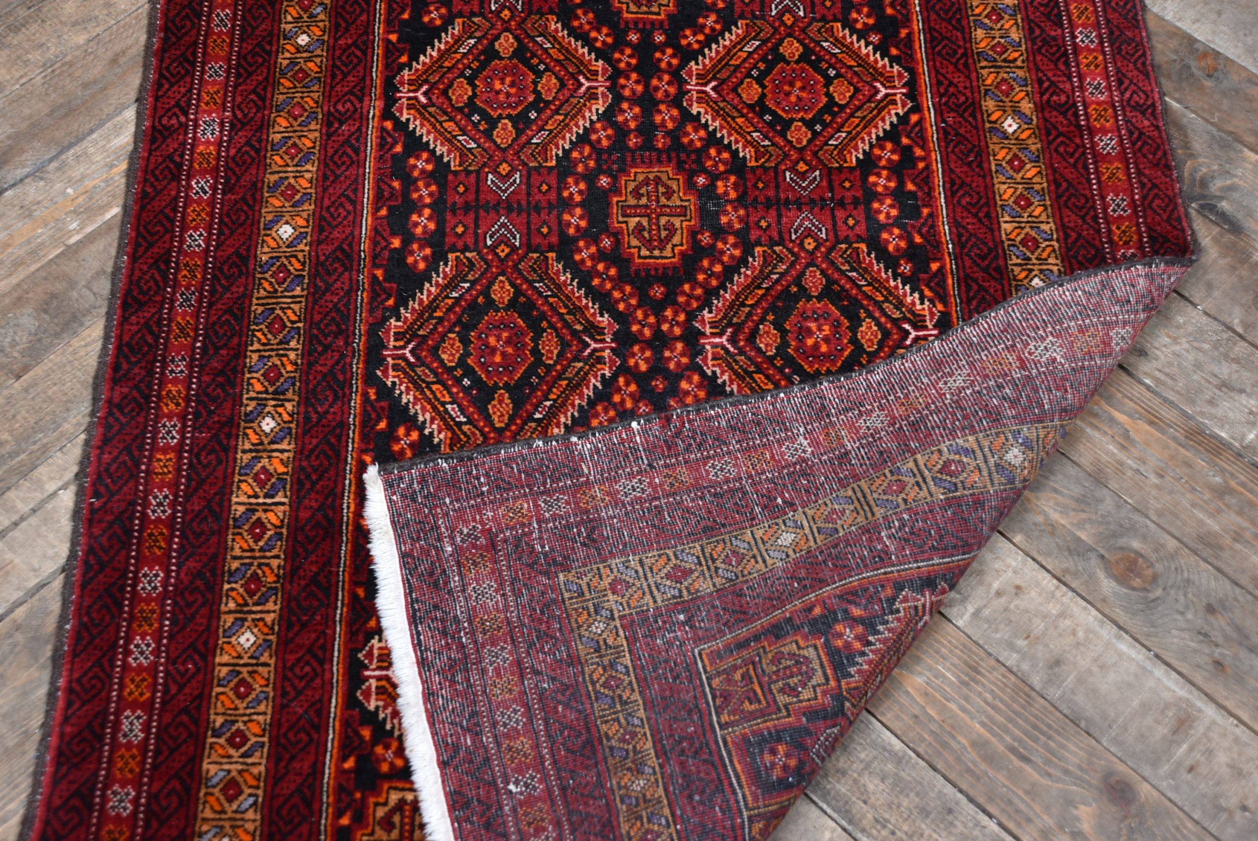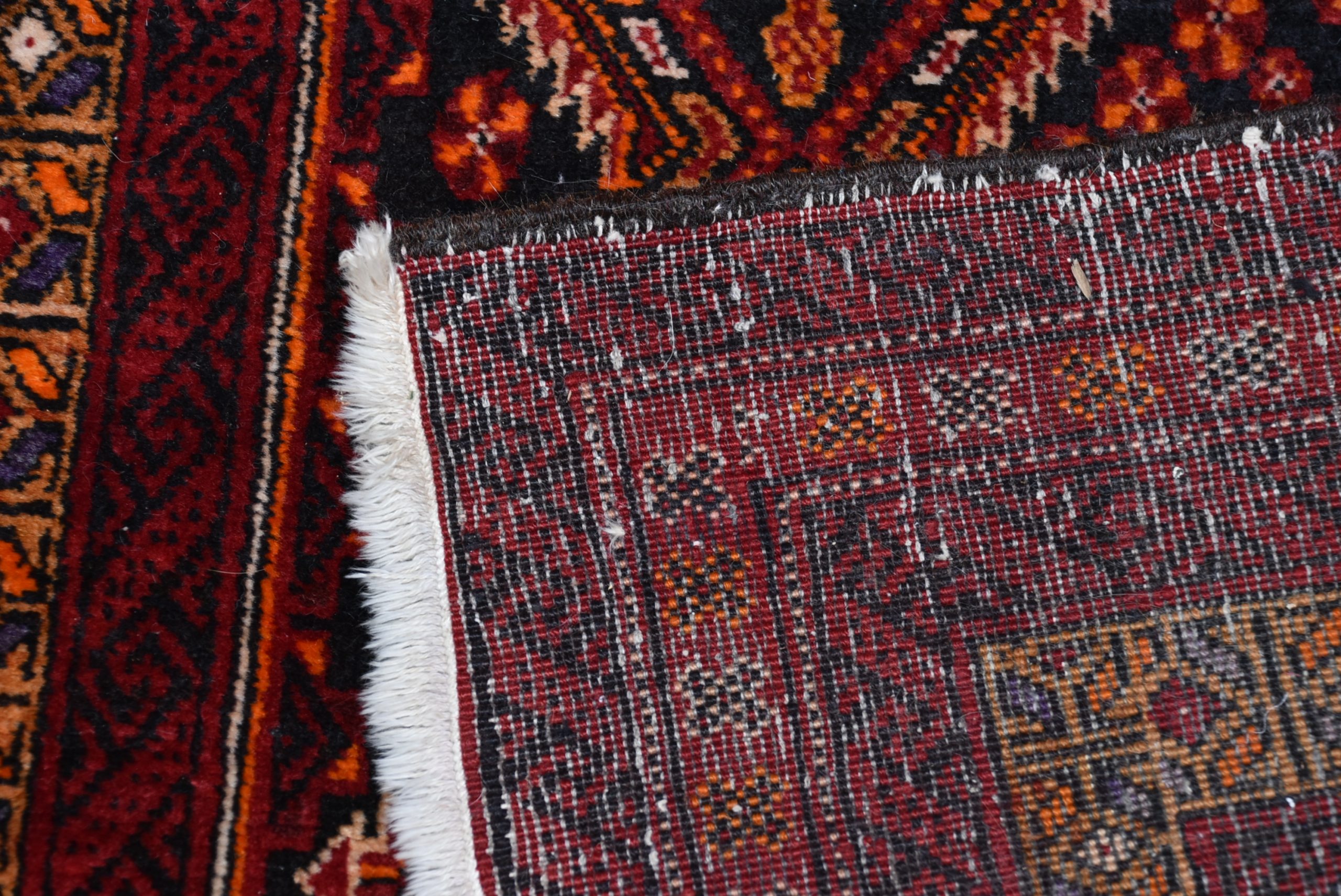 Beautifully handwoven crimson oriental rug in excellent, useable condition. This richly textured piece features a bold palette of bronze and red, complemented by a refined geometric design and hand-knotted fringe. Though it bears a few minor imperfections, it remains structurally sound and free from holes. Its vibrant tones and balanced proportions lend warmth and character to both traditional and contemporary interiors. Whether laid across a floor or hung as a decorative textile, this rug makes a striking and versatile statement.