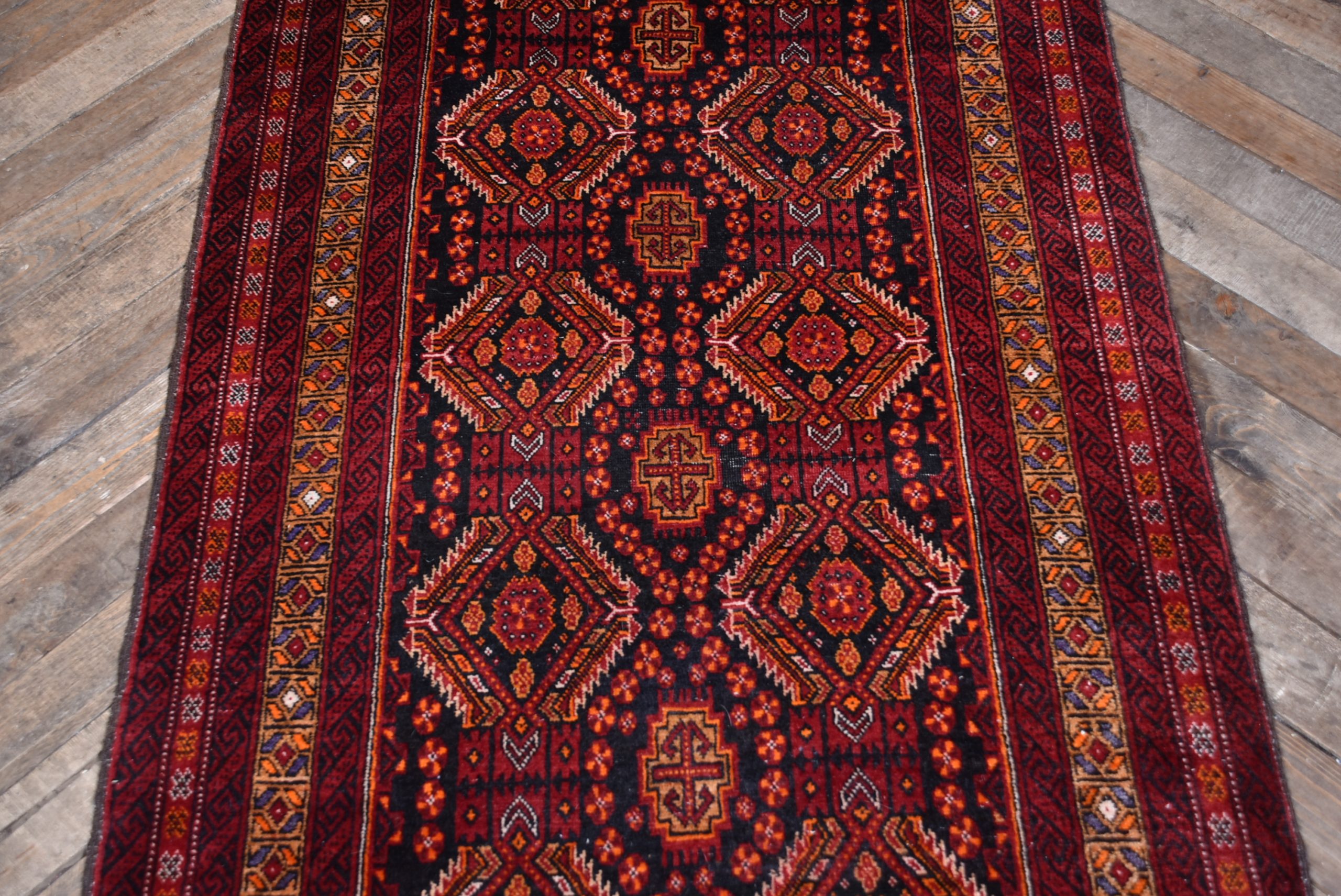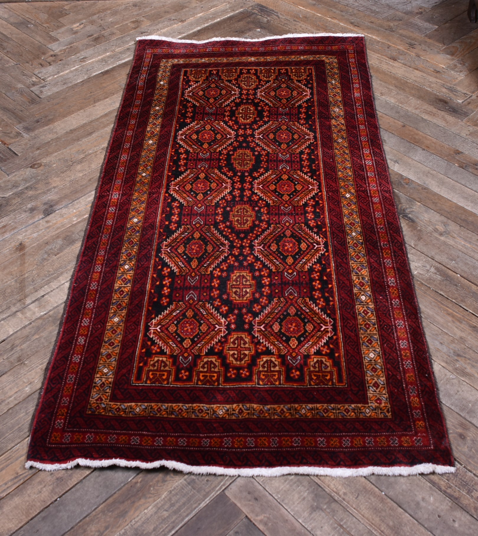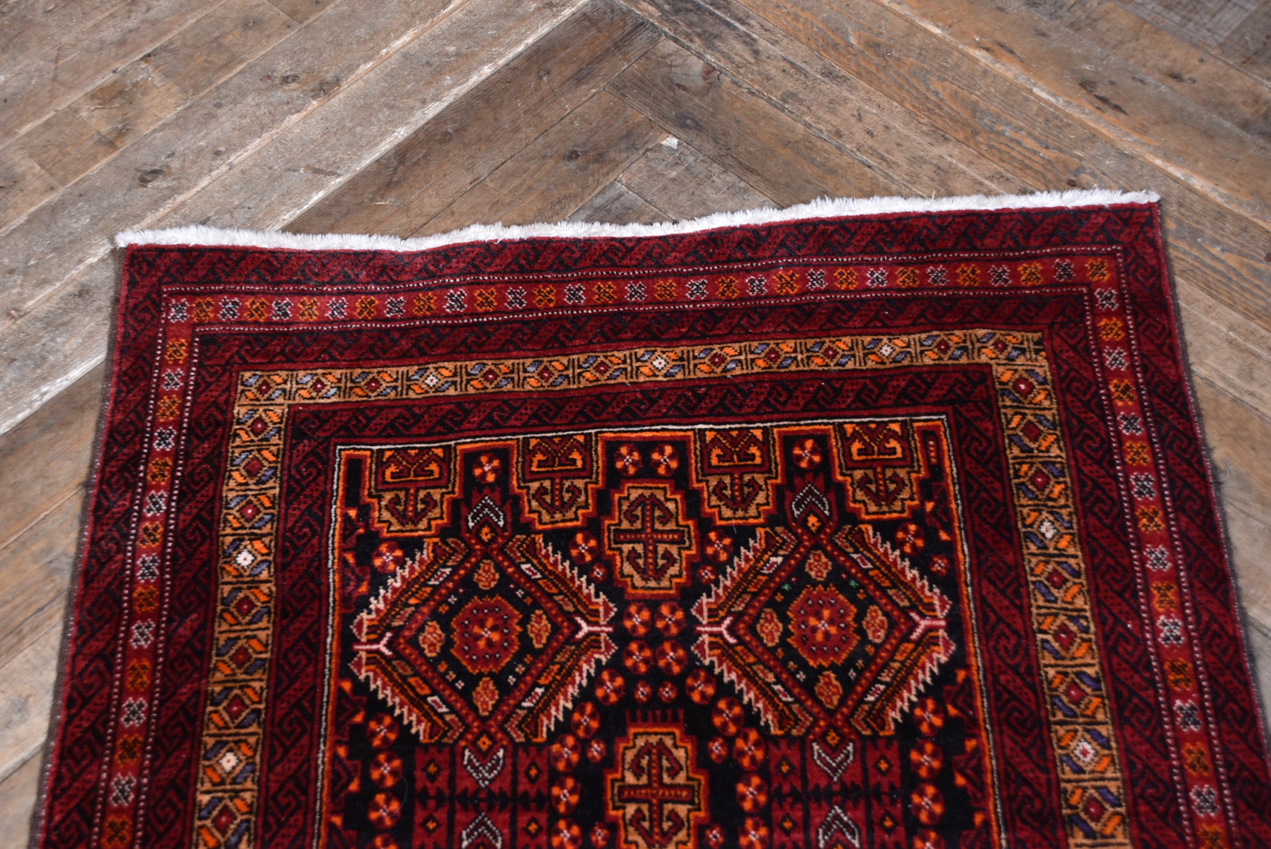 Beautifully handwoven crimson oriental rug in excellent, useable condition. This richly textured piece features a bold palette of bronze and red, complemented by a refined geometric design and hand-knotted fringe. Though it bears a few minor imperfections, it remains structurally sound and free from holes. Its vibrant tones and balanced proportions lend warmth and character to both traditional and contemporary interiors. Whether laid across a floor or hung as a decorative textile, this rug makes a striking and versatile statement.