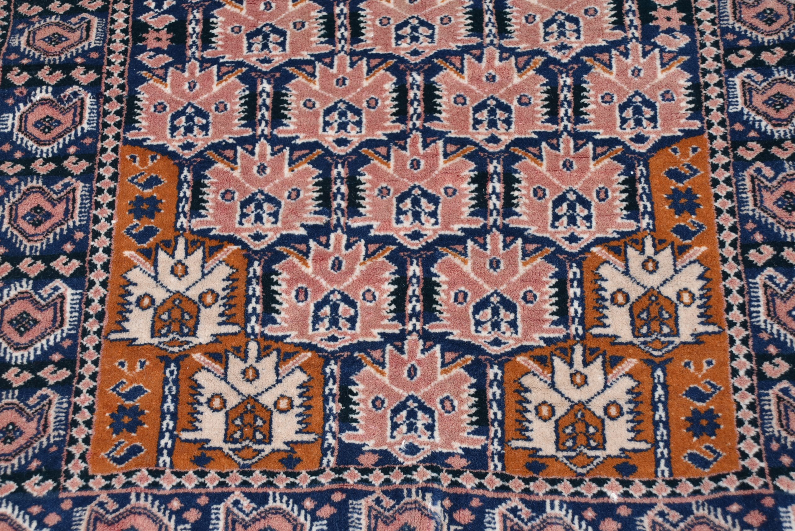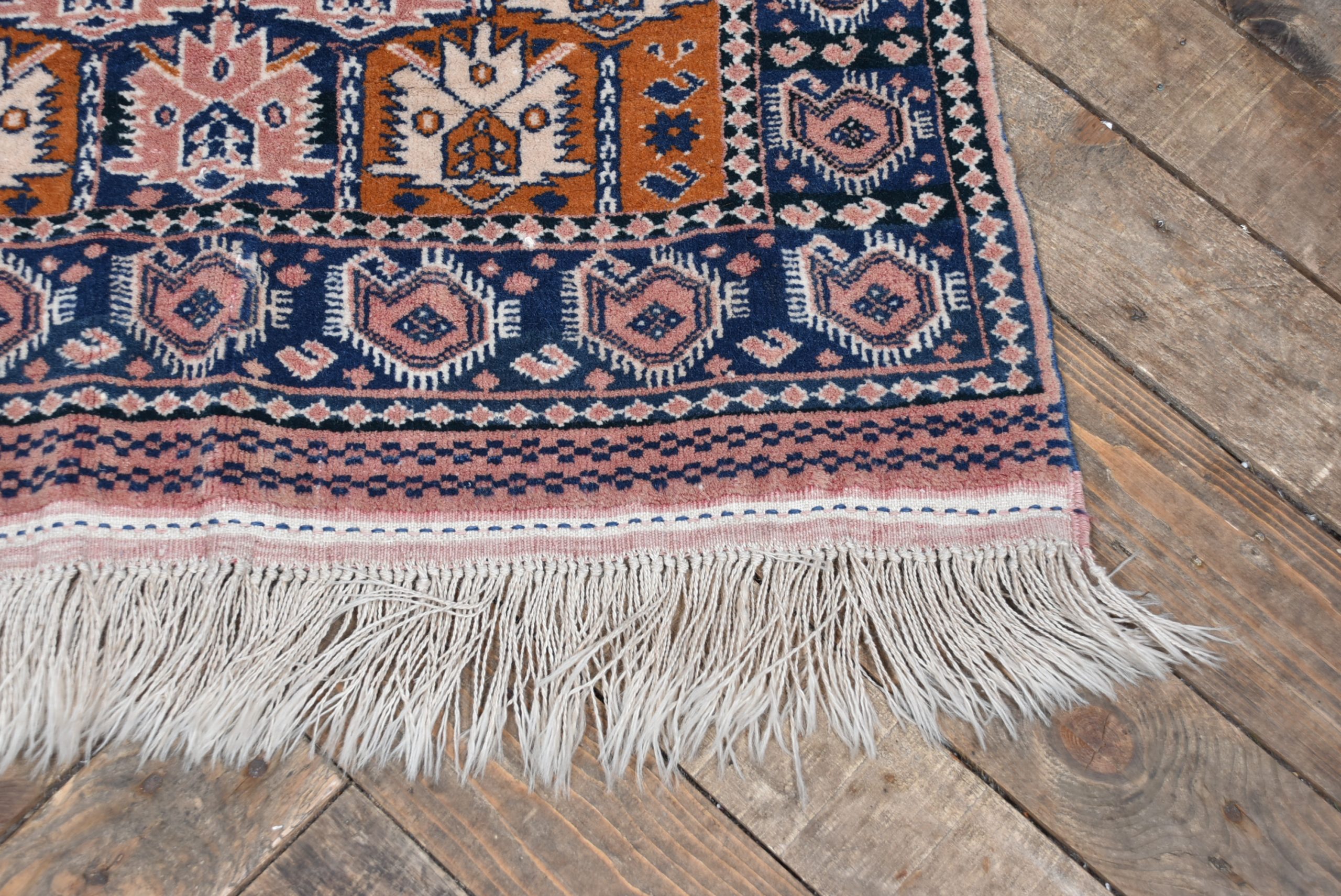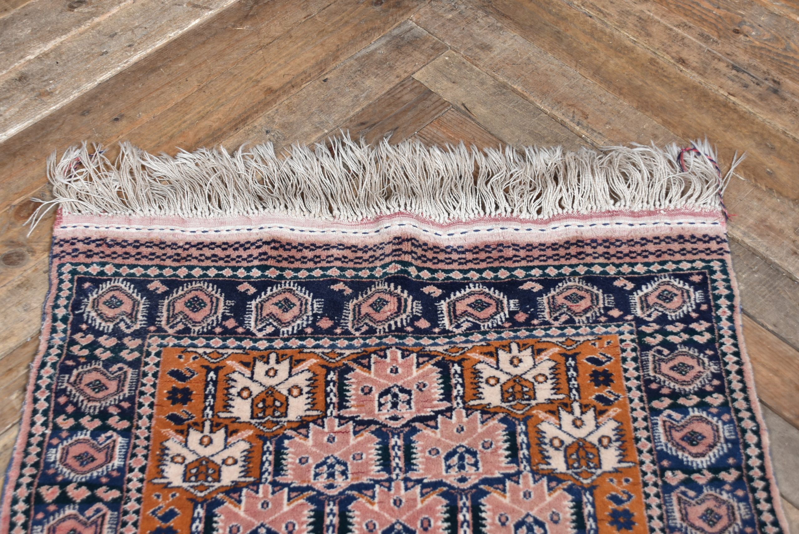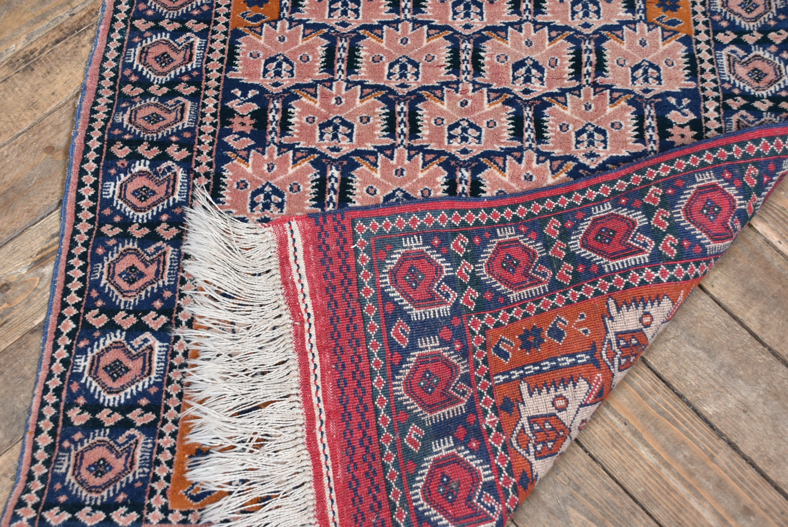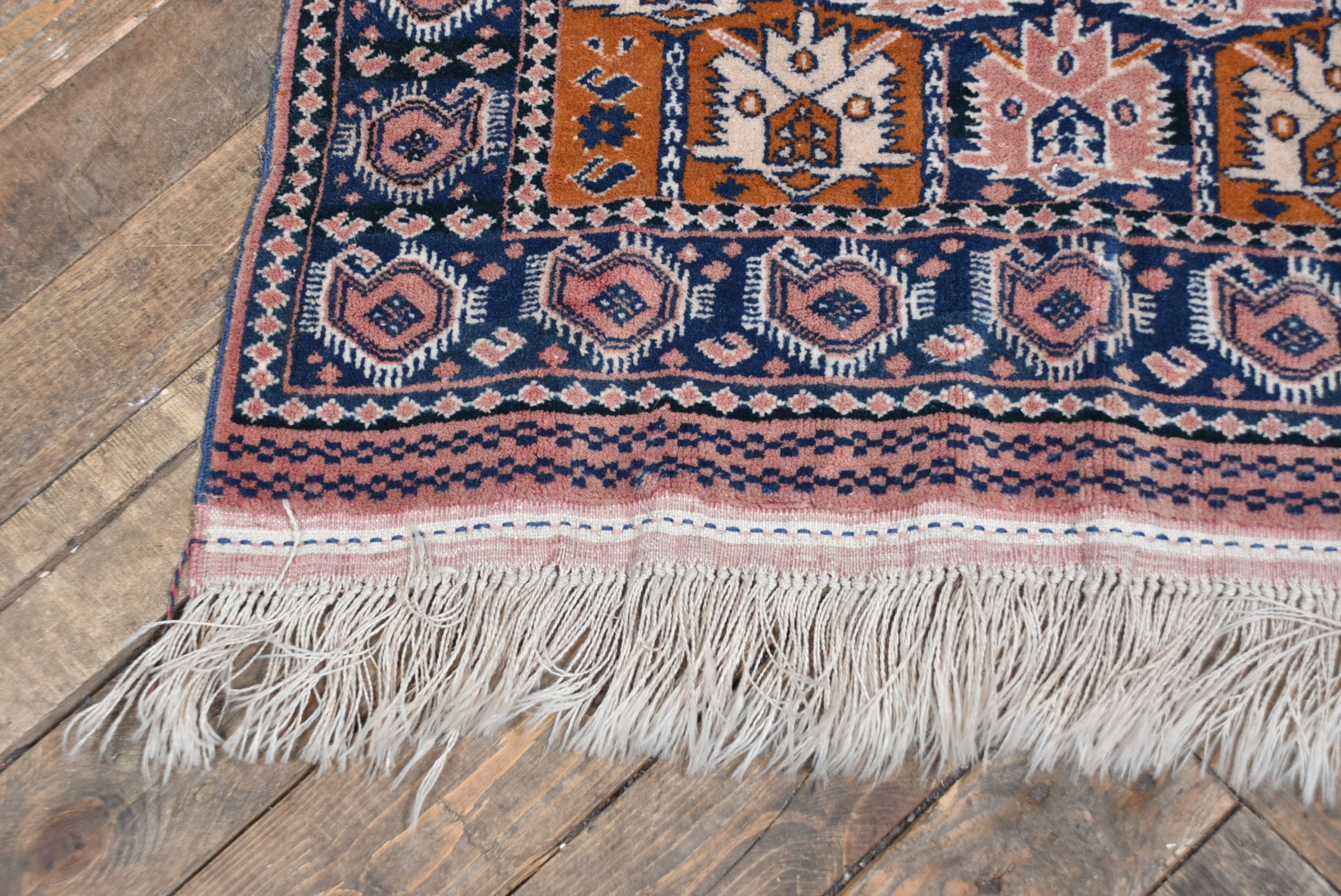 A vibrant handwoven rug in shades of pink, navy, white, and orange. Though gently aged, it retains its vivid colouring and intricate detail. Finished with fringe at each end, this piece showcases traditional craftsmanship and balanced design—adding warmth, character, and cultural richness to hallways or entrances.