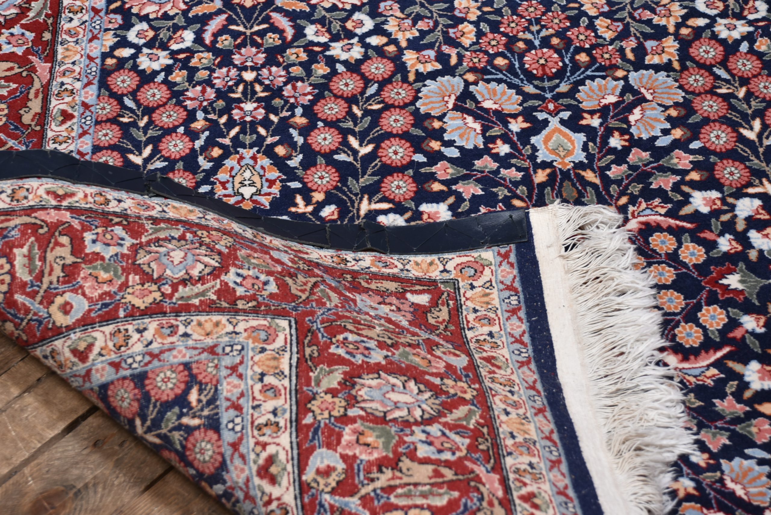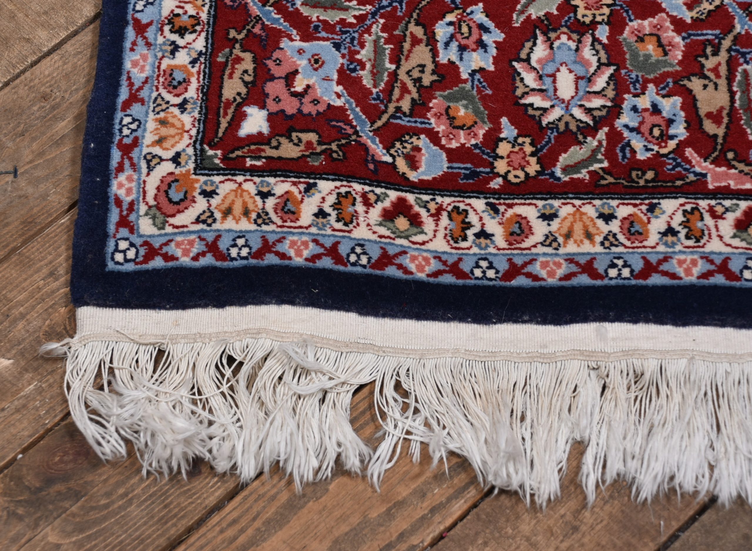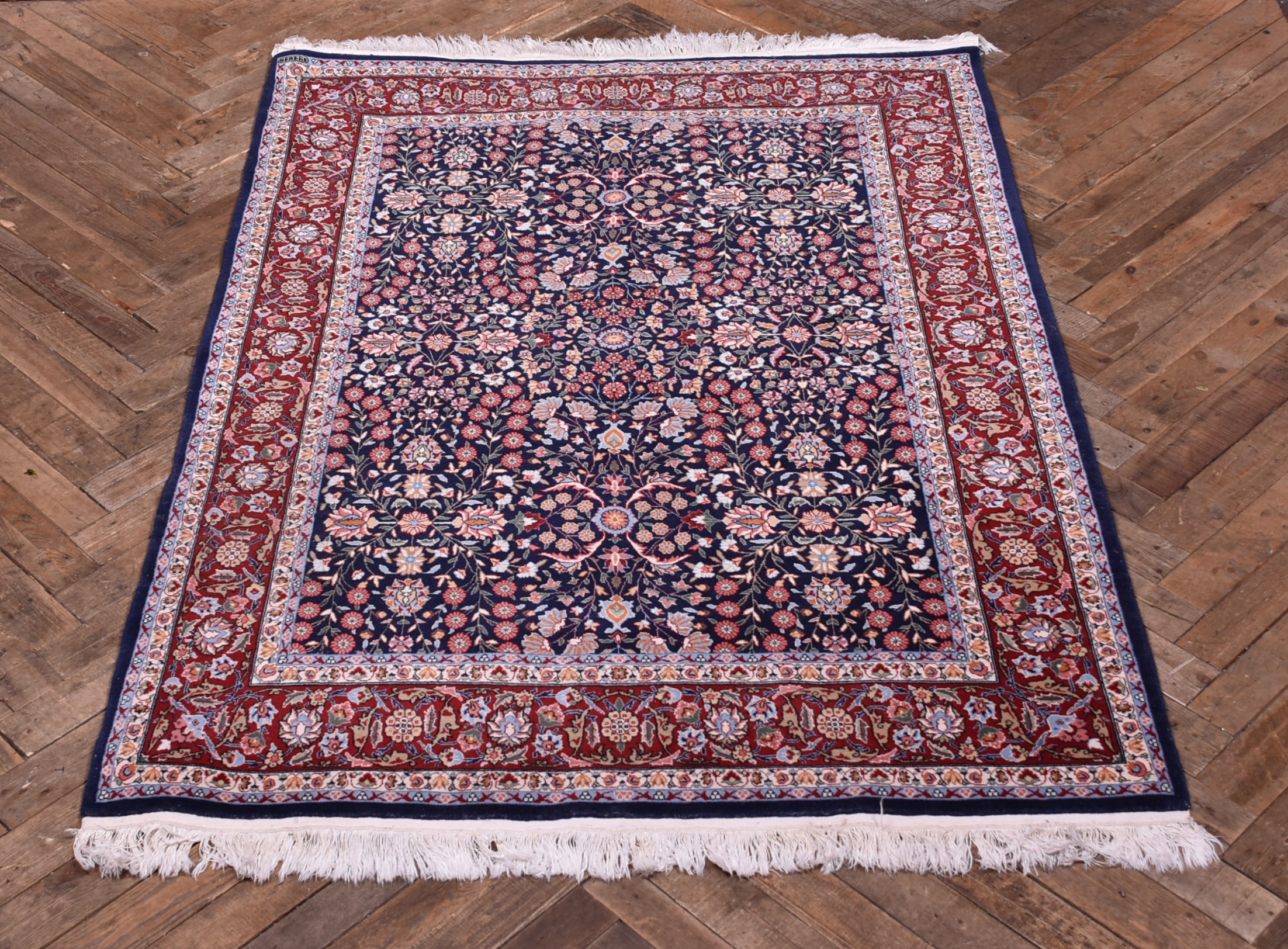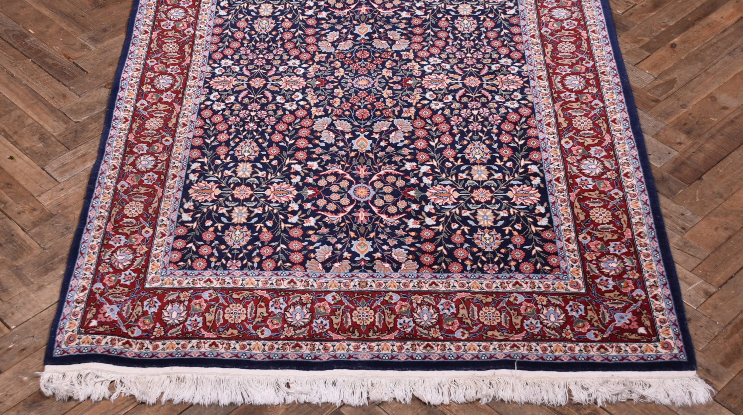 A finely woven Hereke wool rug displaying a richly detailed floral and geometric design in deep navy, soft reds, ivory, and pale blues. The central field is densely patterned, creating a sense of movement and intricacy, while the surrounding borders frame the composition with classic Hereke motifs. The colours are vibrant and the wool pile has a pleasing softness. The craftsmanship is evident in the clarity of the pattern and the tightness of the weave. Completed with hand-knotted fringe and vivid colouration, this rug is both visually captivating and of exceptional quality. Its timeless design and rich character make it a stunning addition to any interior, be it classic or contemporary. A beautifully made piece that would add warmth, colour, and character to a living room, study, or bedroom.