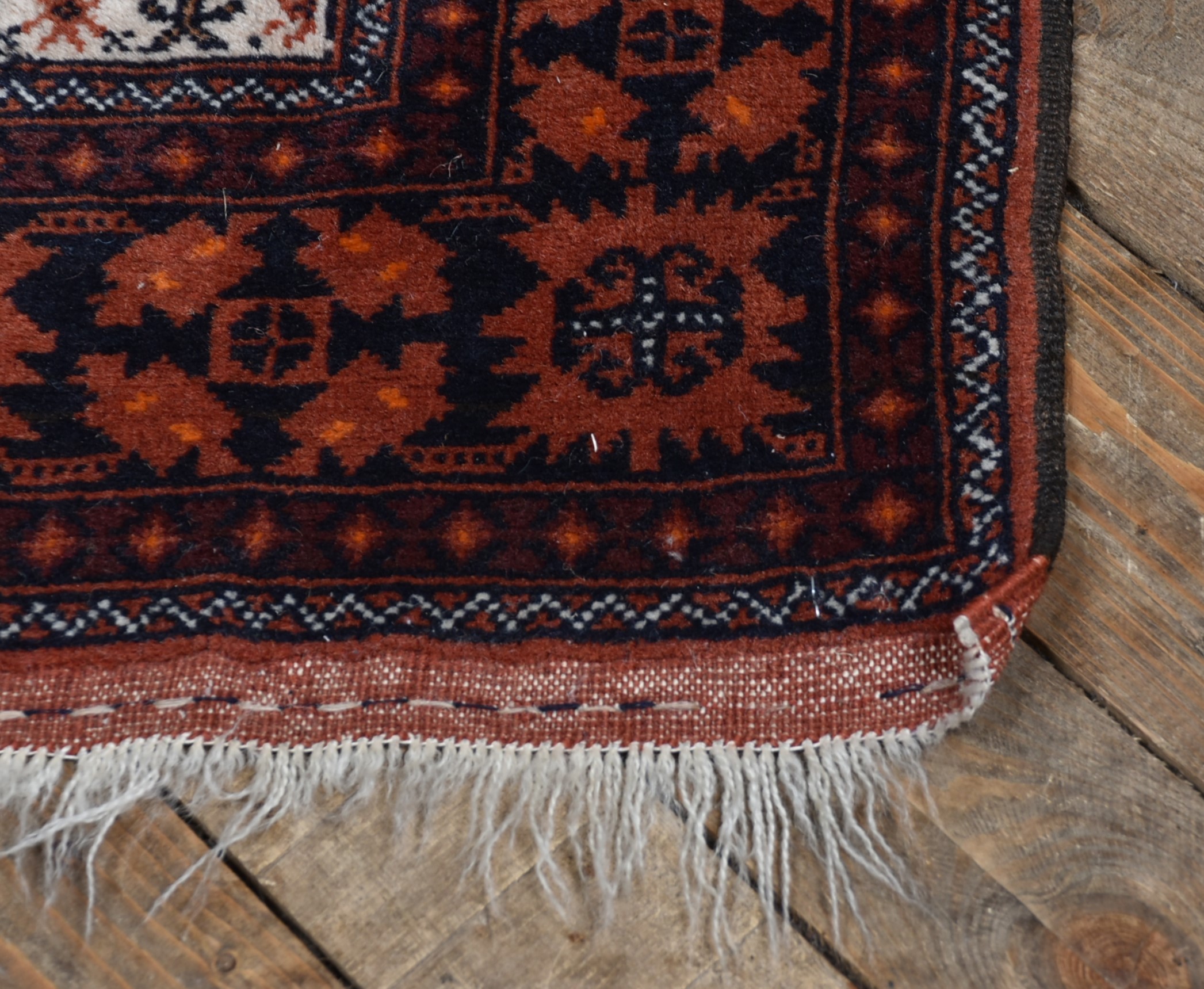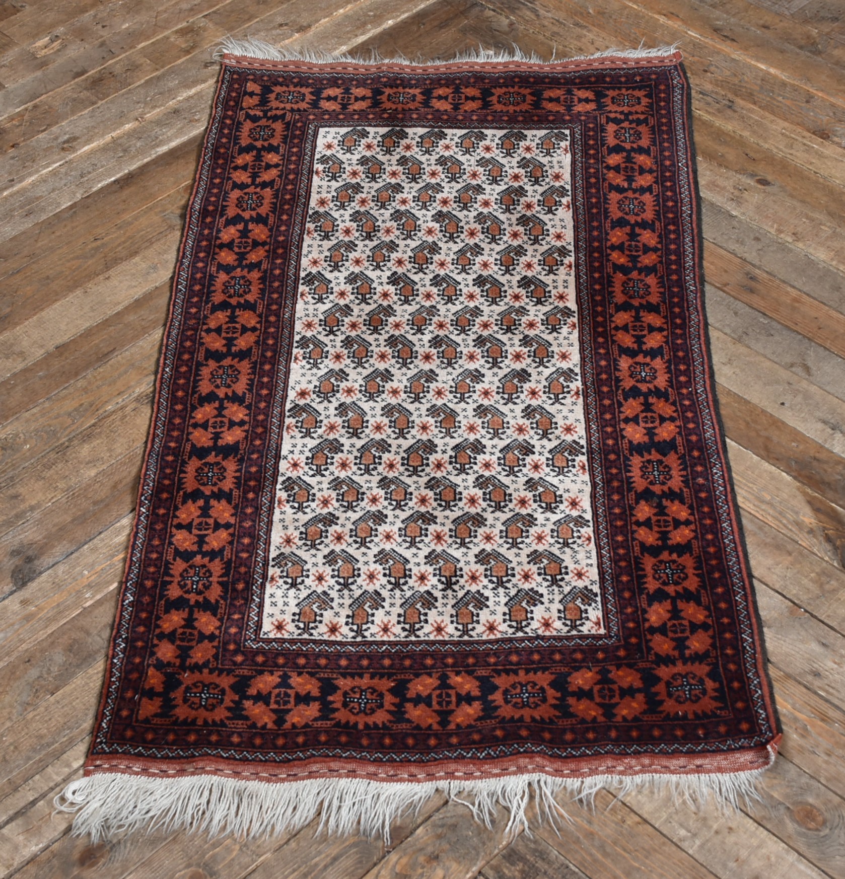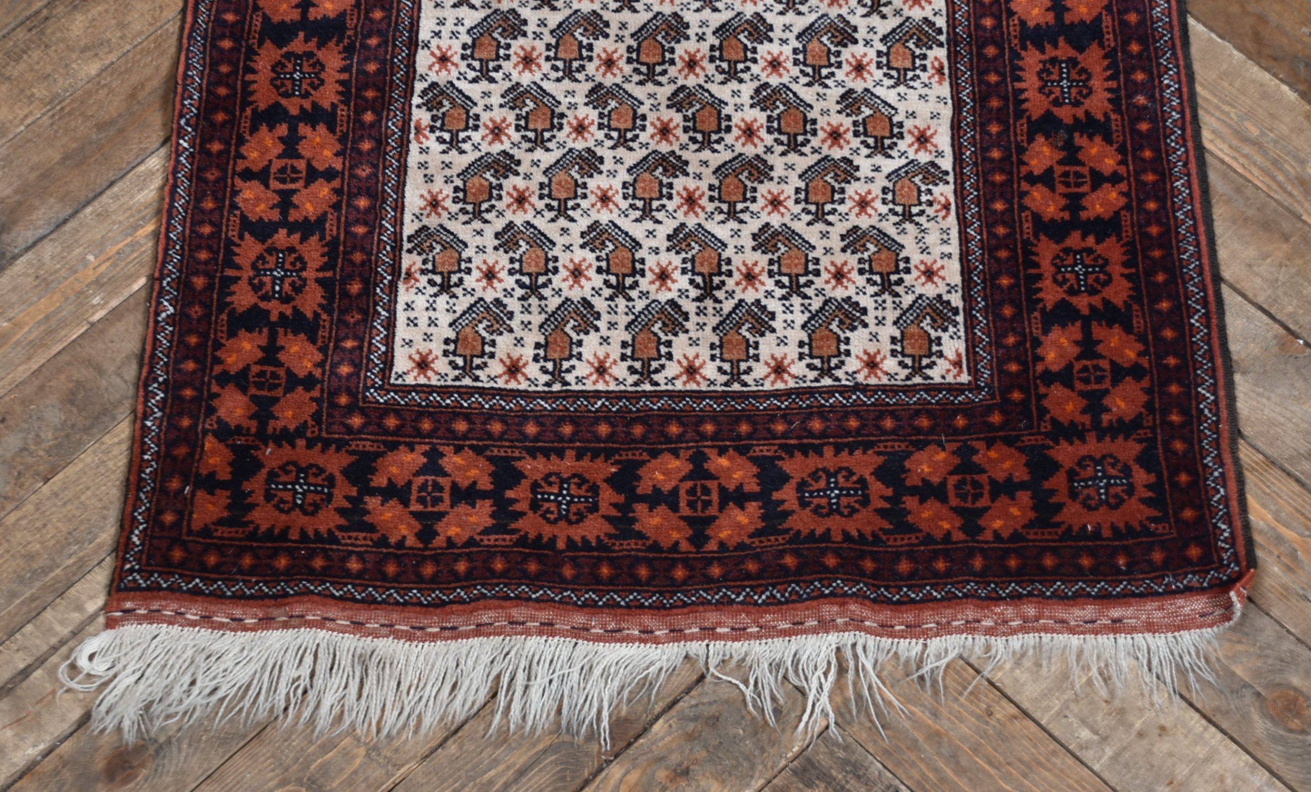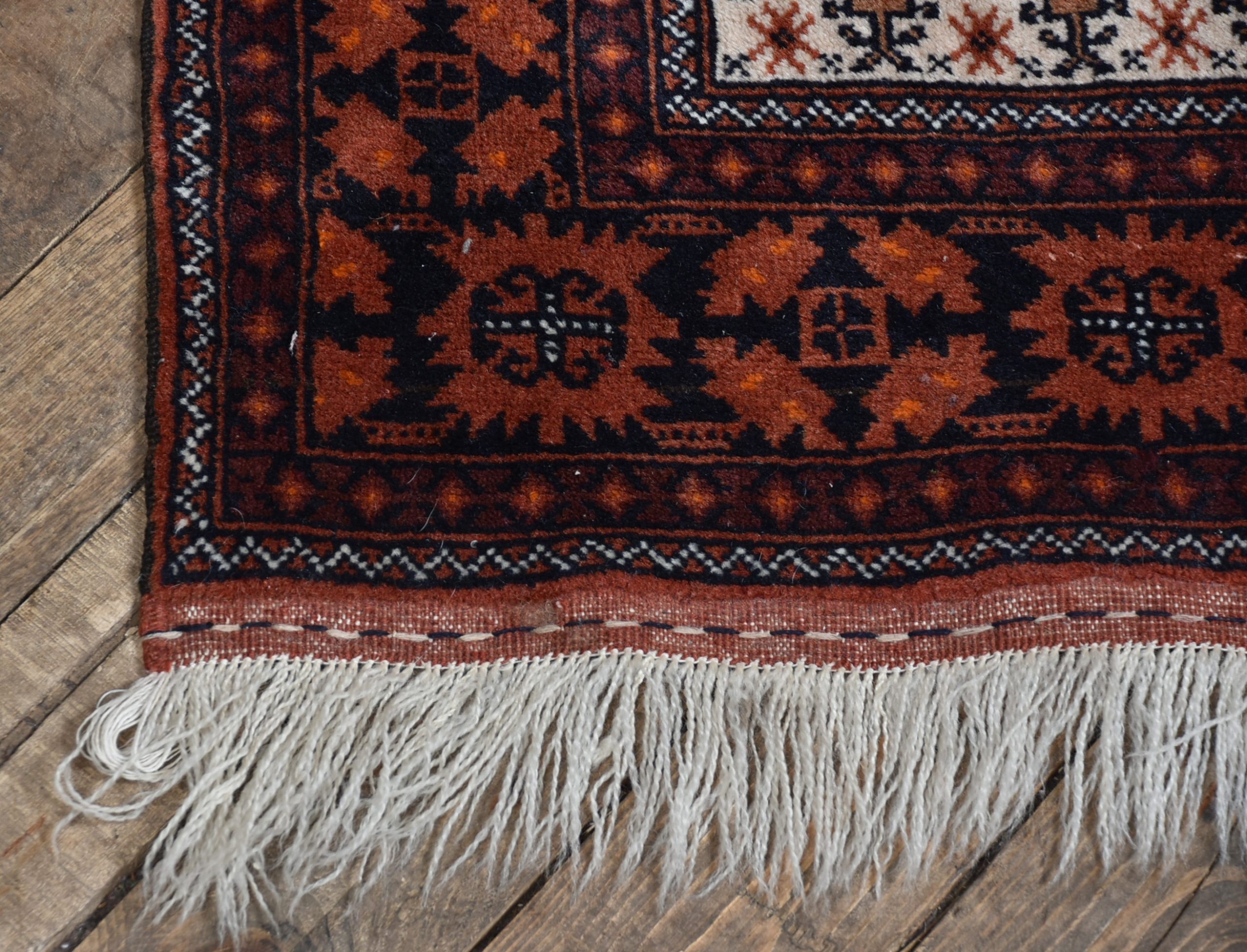 A finely woven rug featuring a richly patterned field of repeating floral and geometric motifs in a palette of deep red, black, and ivory. The symmetrical design is framed by a series of intricate borders, each layered with stylised medallions and angular flourishes that lend rhythm and visual depth. The craftsmanship is evident in the crisp detailing and balanced composition, while the fringed ends and subtle irregularities speak to its handmade origin. Likely of Middle Eastern or Central Asian provenance, this piece reflects a tradition of textile artistry rooted in both utility and ornament. Ideal for interiors seeking warmth, texture, and cultural character, or for collectors drawn to the enduring beauty of traditional weaving.