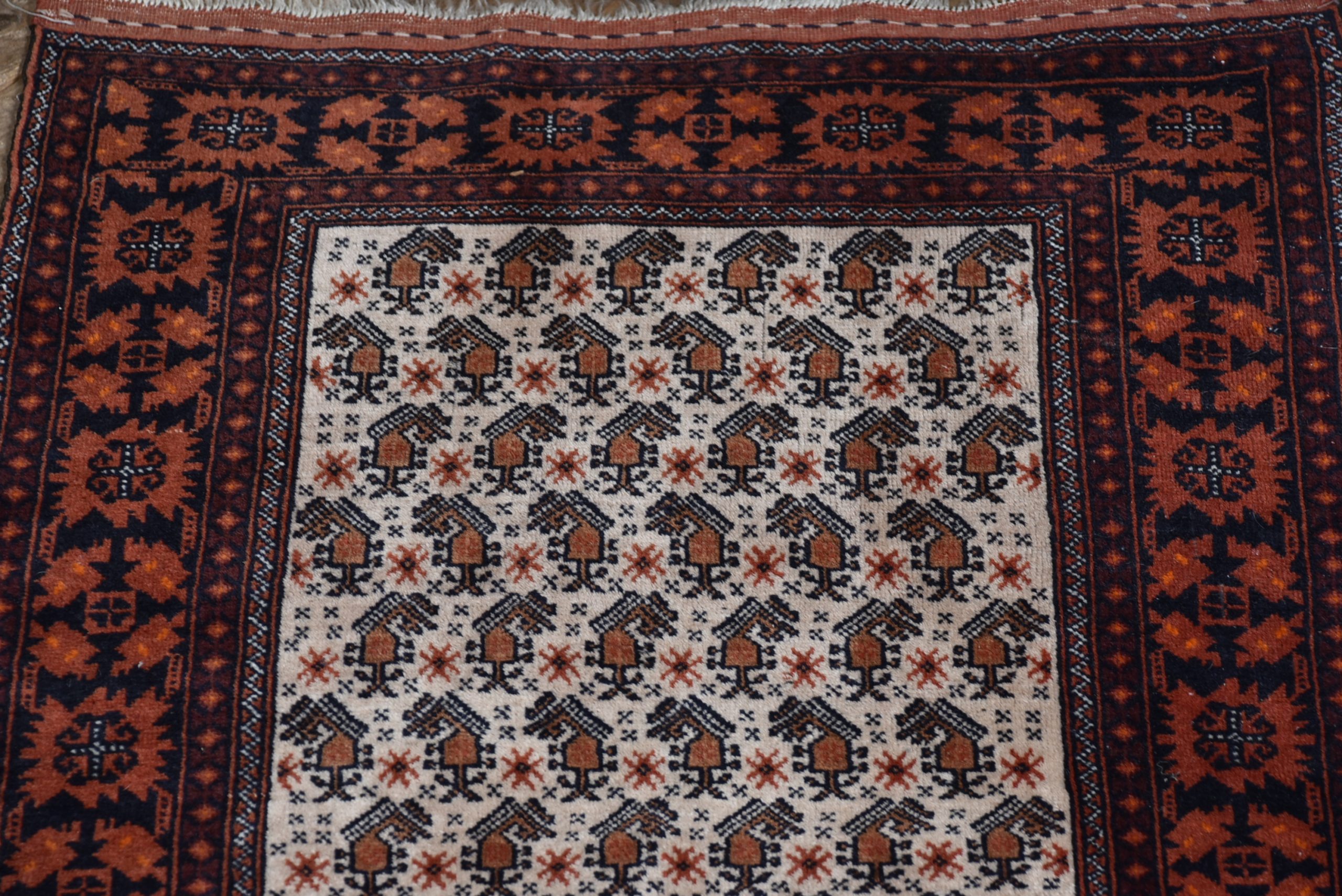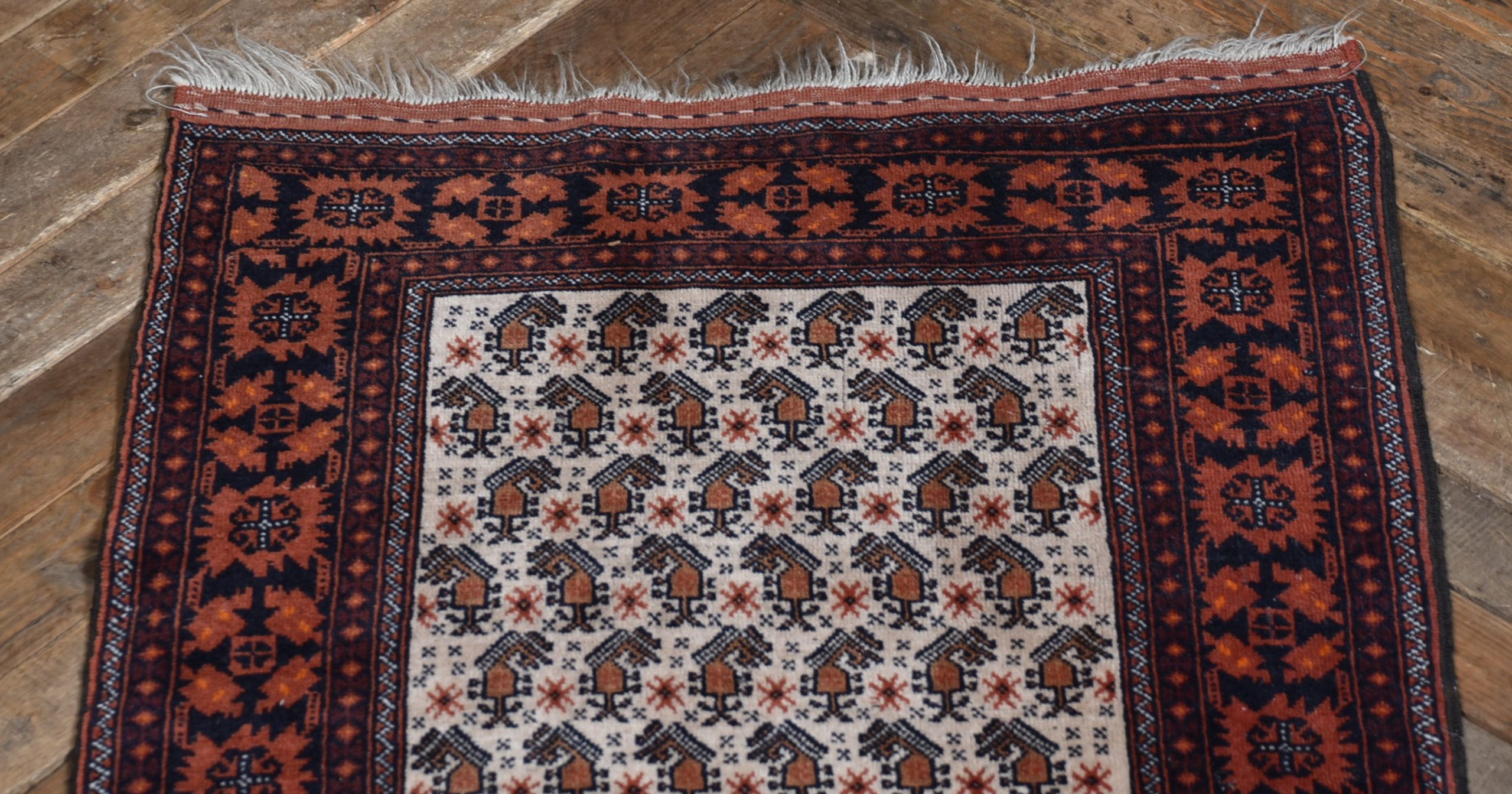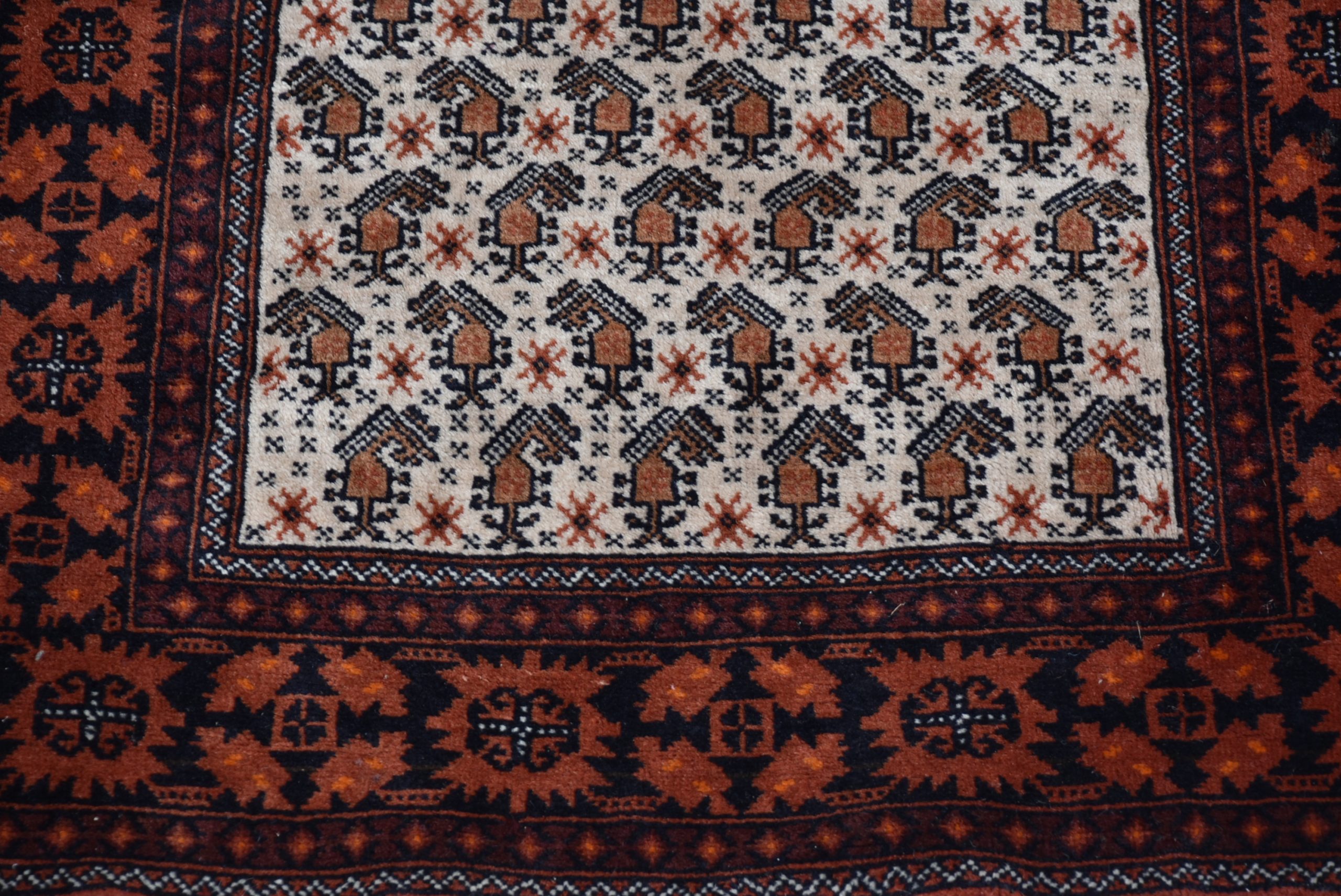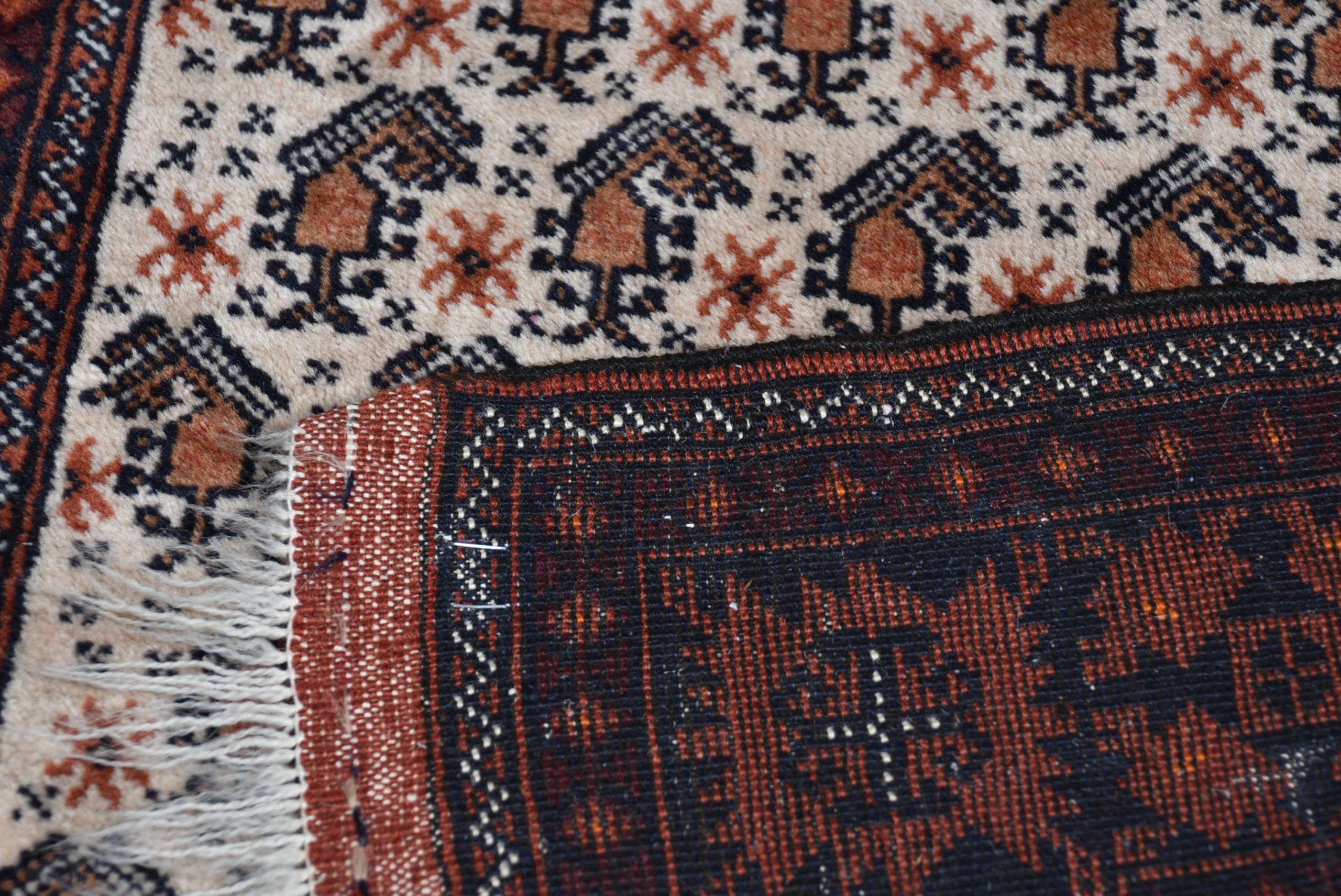 A finely woven rug featuring a richly patterned field of repeating floral and geometric motifs in a palette of deep red, black, and ivory. The symmetrical design is framed by a series of intricate borders, each layered with stylised medallions and angular flourishes that lend rhythm and visual depth. The craftsmanship is evident in the crisp detailing and balanced composition, while the fringed ends and subtle irregularities speak to its handmade origin. Likely of Middle Eastern or Central Asian provenance, this piece reflects a tradition of textile artistry rooted in both utility and ornament. Ideal for interiors seeking warmth, texture, and cultural character, or for collectors drawn to the enduring beauty of traditional weaving.