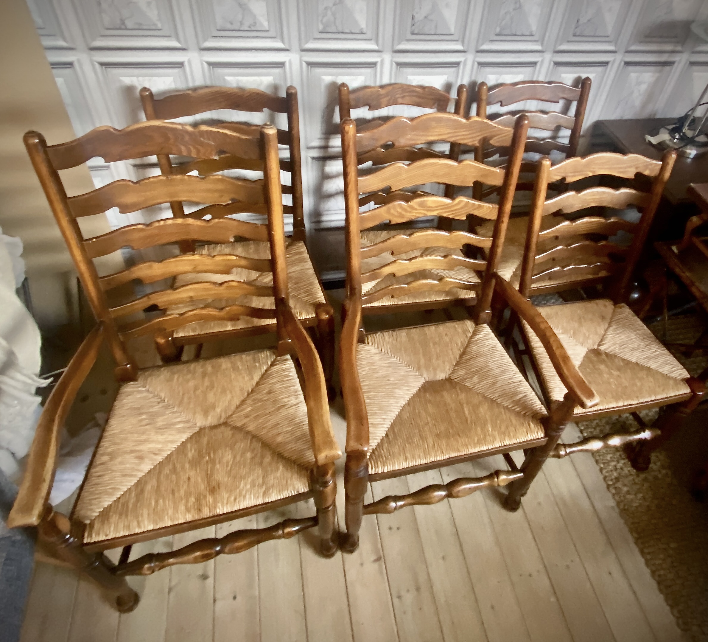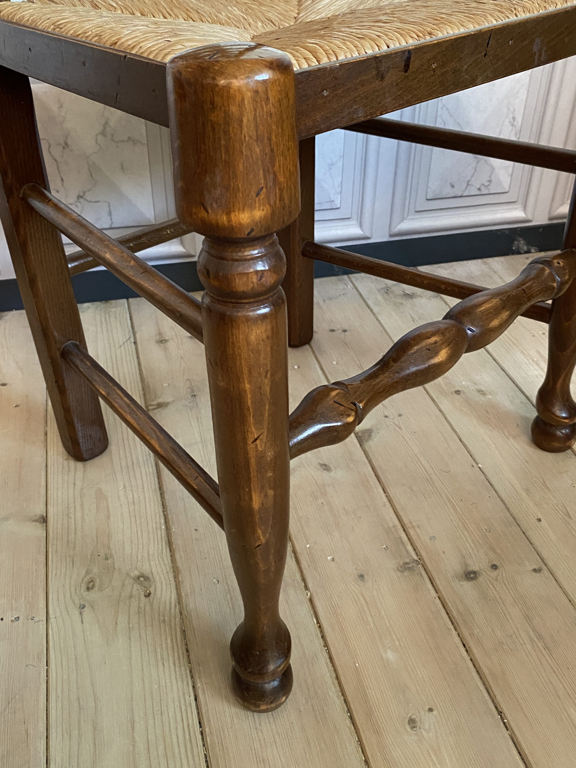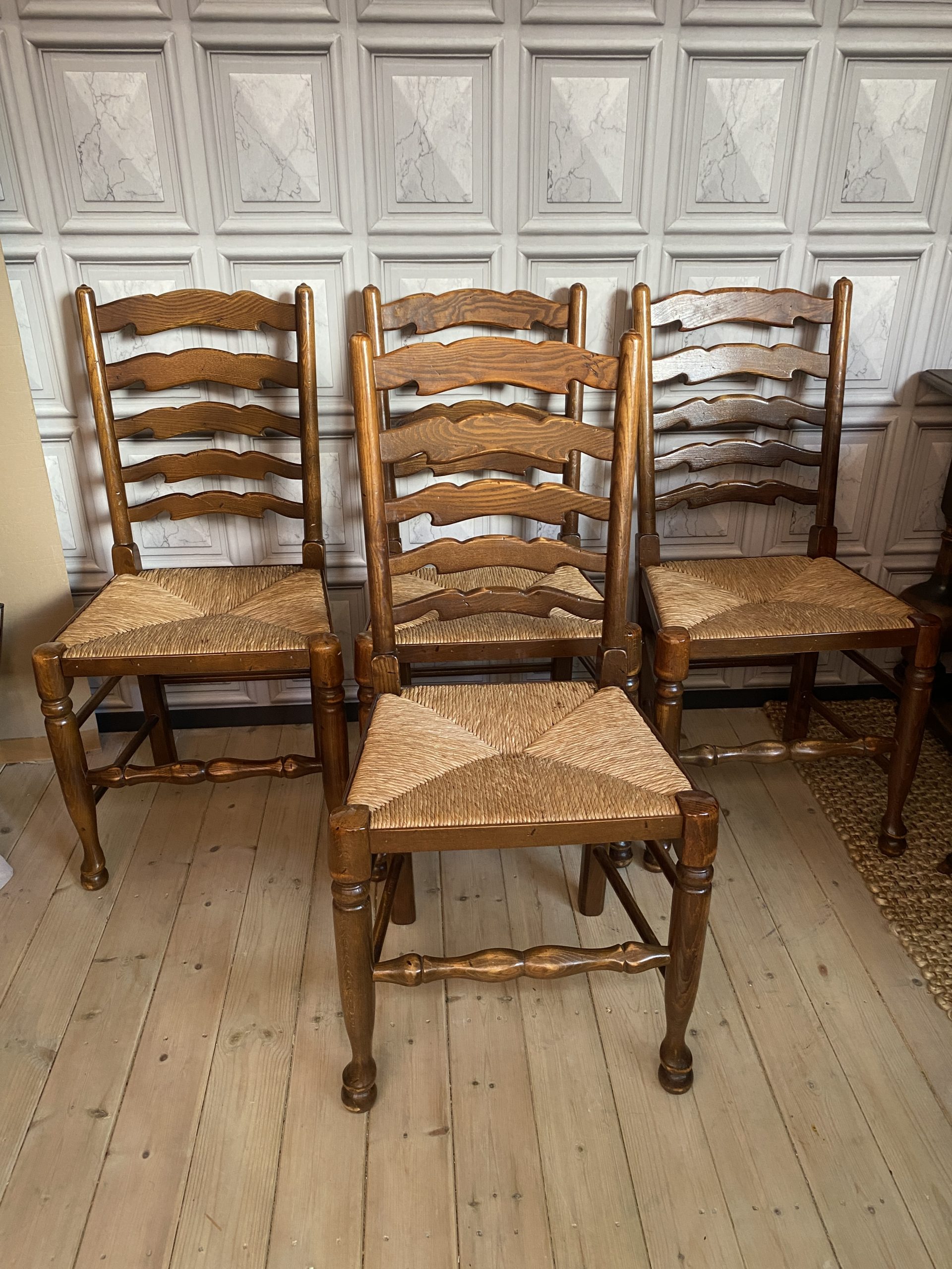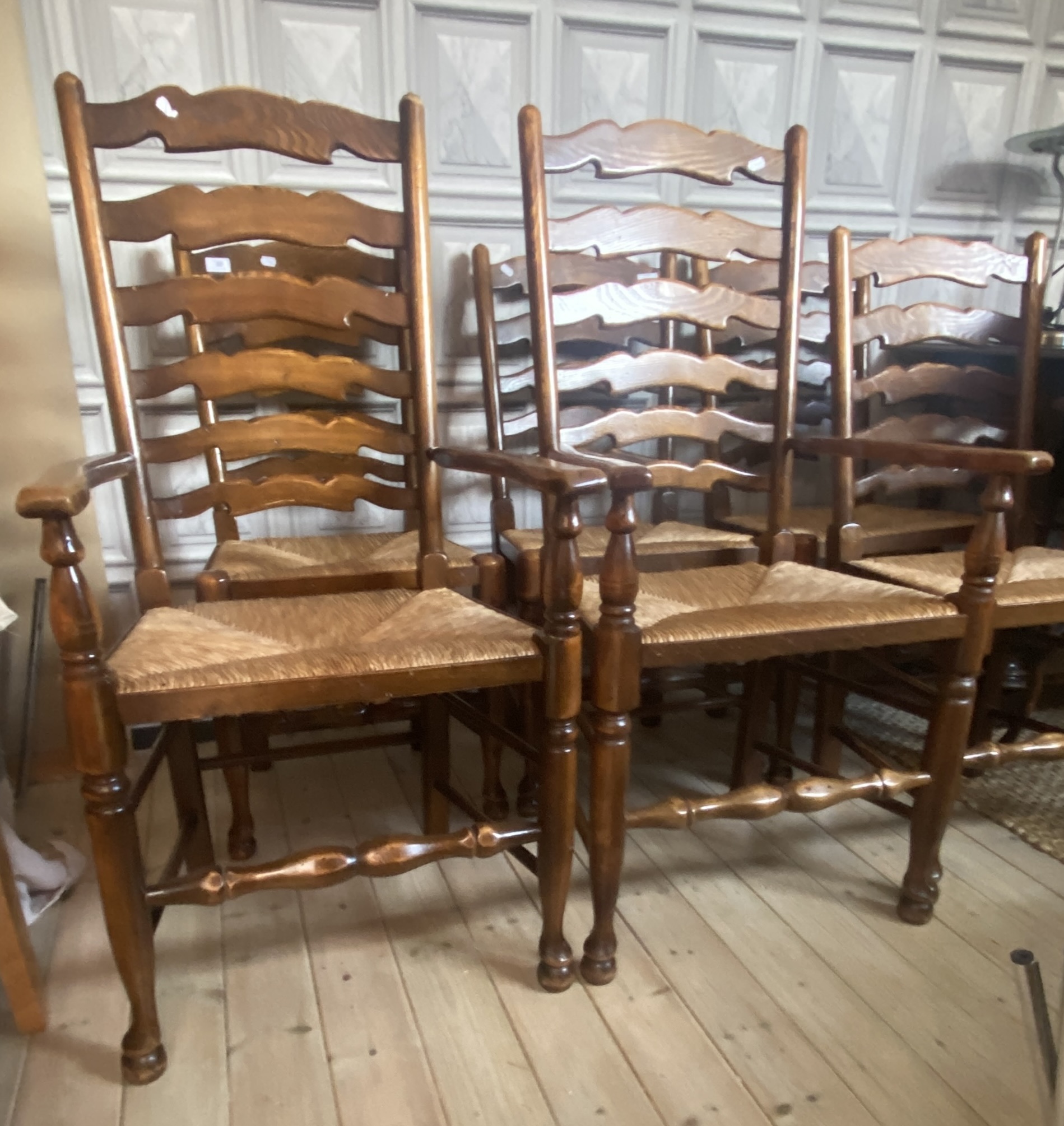 Vintage oak LANCASHIRE style dining chair set. Comprising of 4 upright chairs and 2 carvers. With excellent quarter pattern rush woven seats. Front turned legs on turned feet with straight back legs connected with turned stretchers. Small chairs have 5 backrest rungs and larger carvers each have 6 rungs.