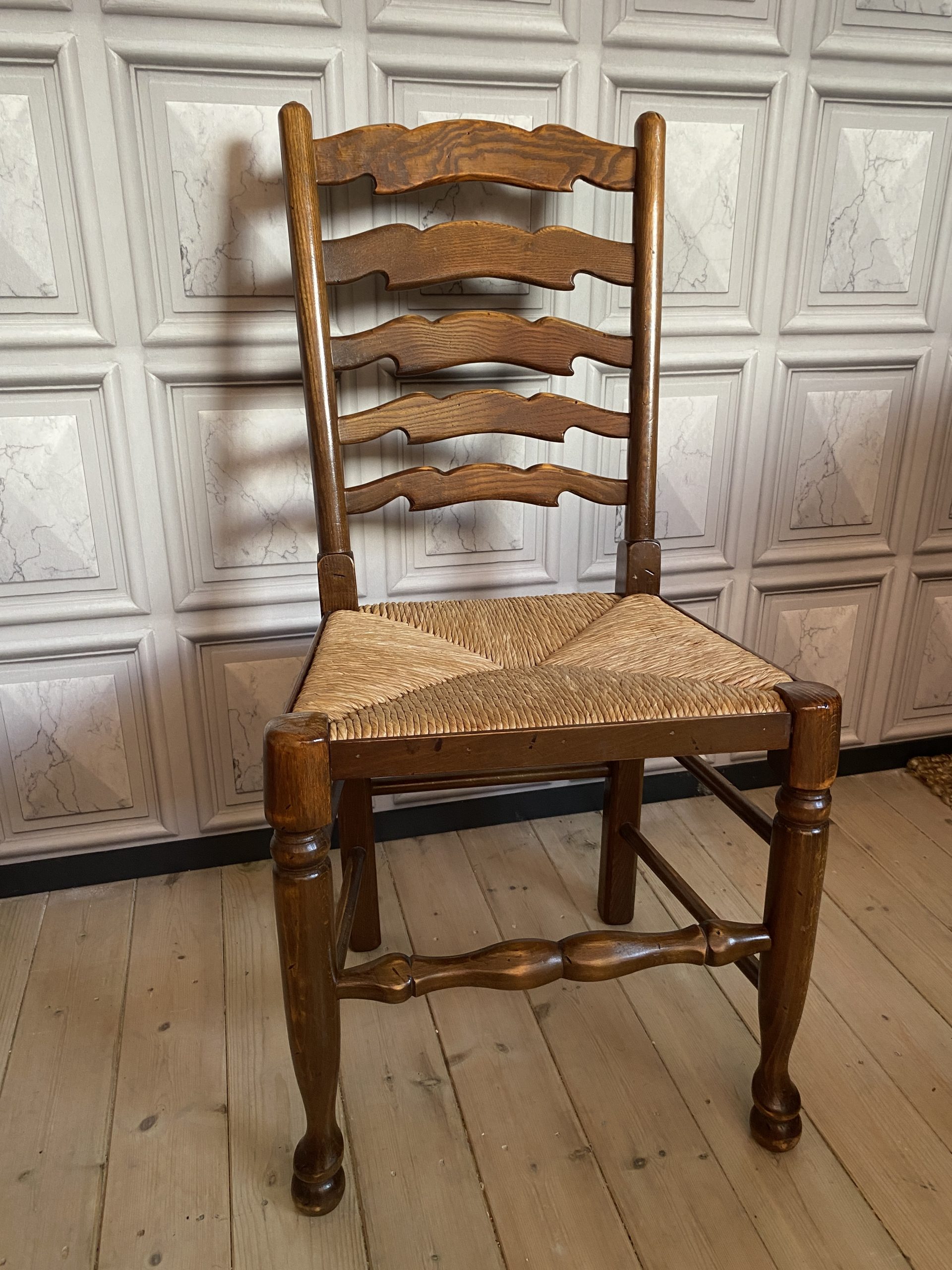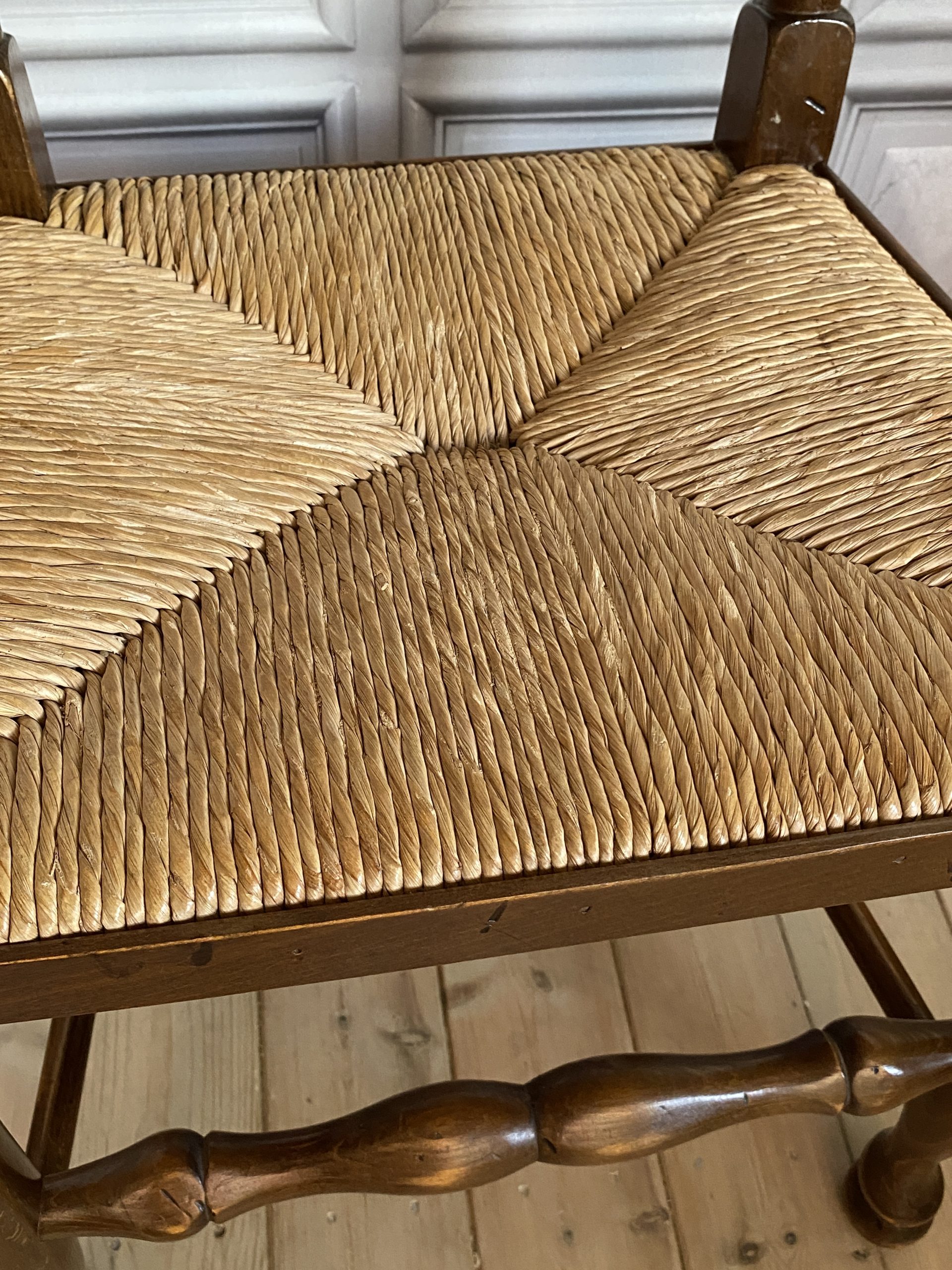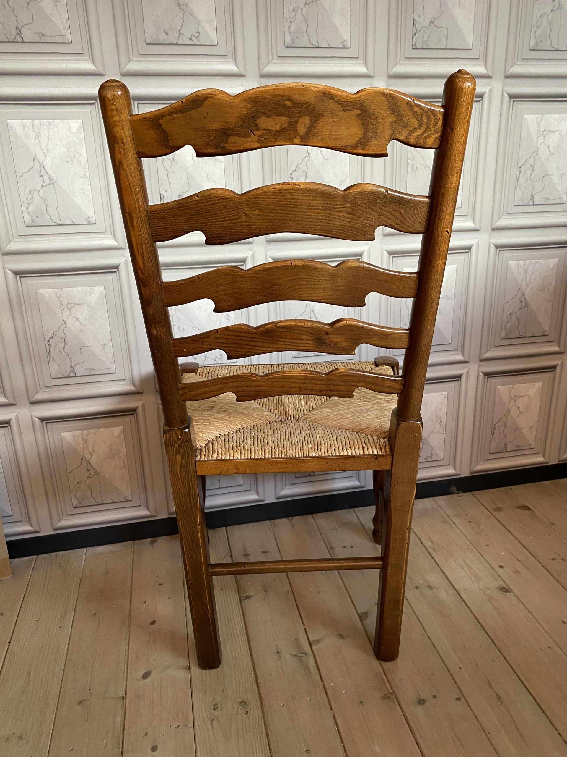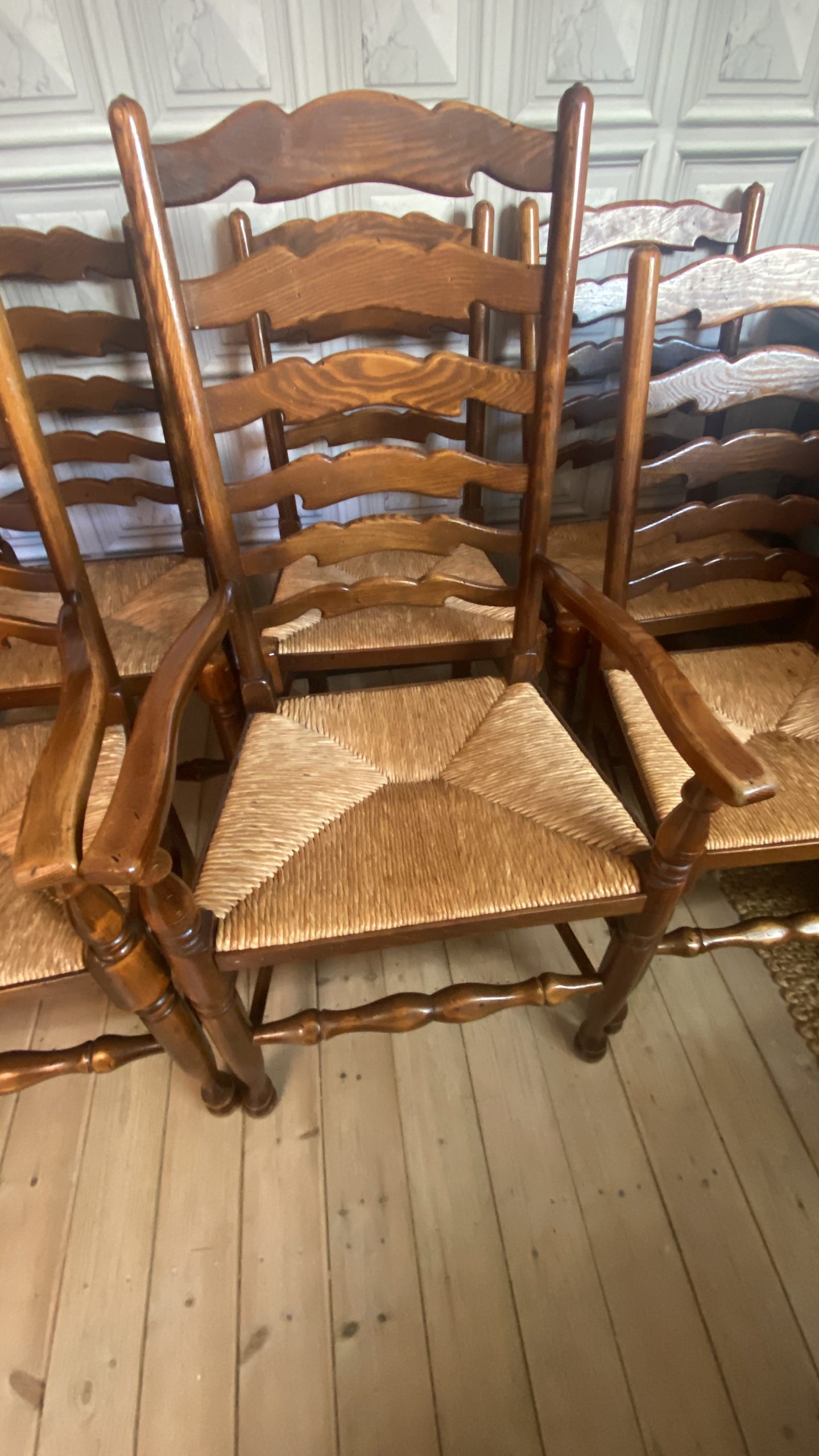 Vintage oak LANCASHIRE style dining chair set. Comprising of 4 upright chairs and 2 carvers. With excellent quarter pattern rush woven seats. Front turned legs on turned feet with straight back legs connected with turned stretchers. Small chairs have 5 backrest rungs and larger carvers each have 6 rungs.