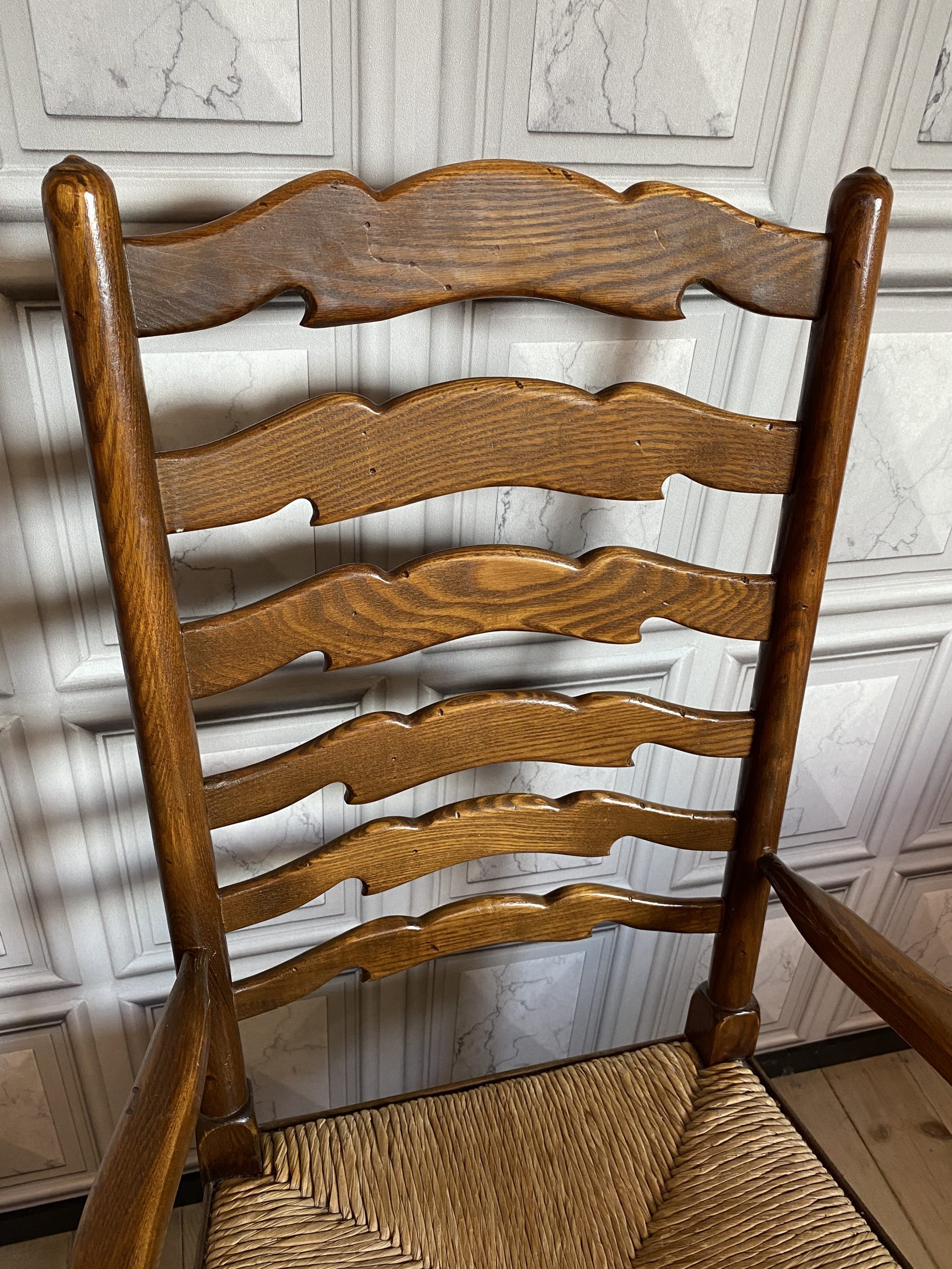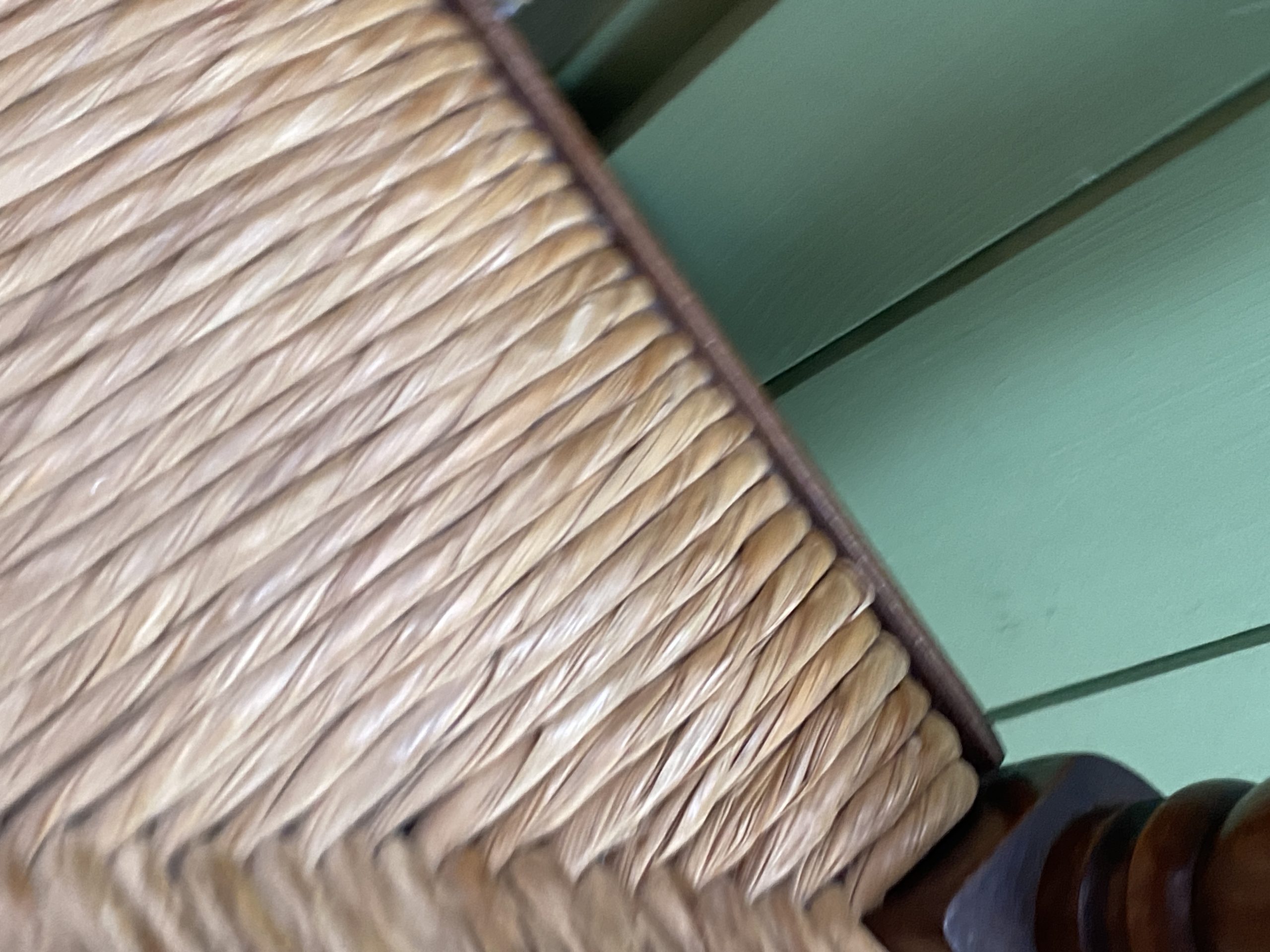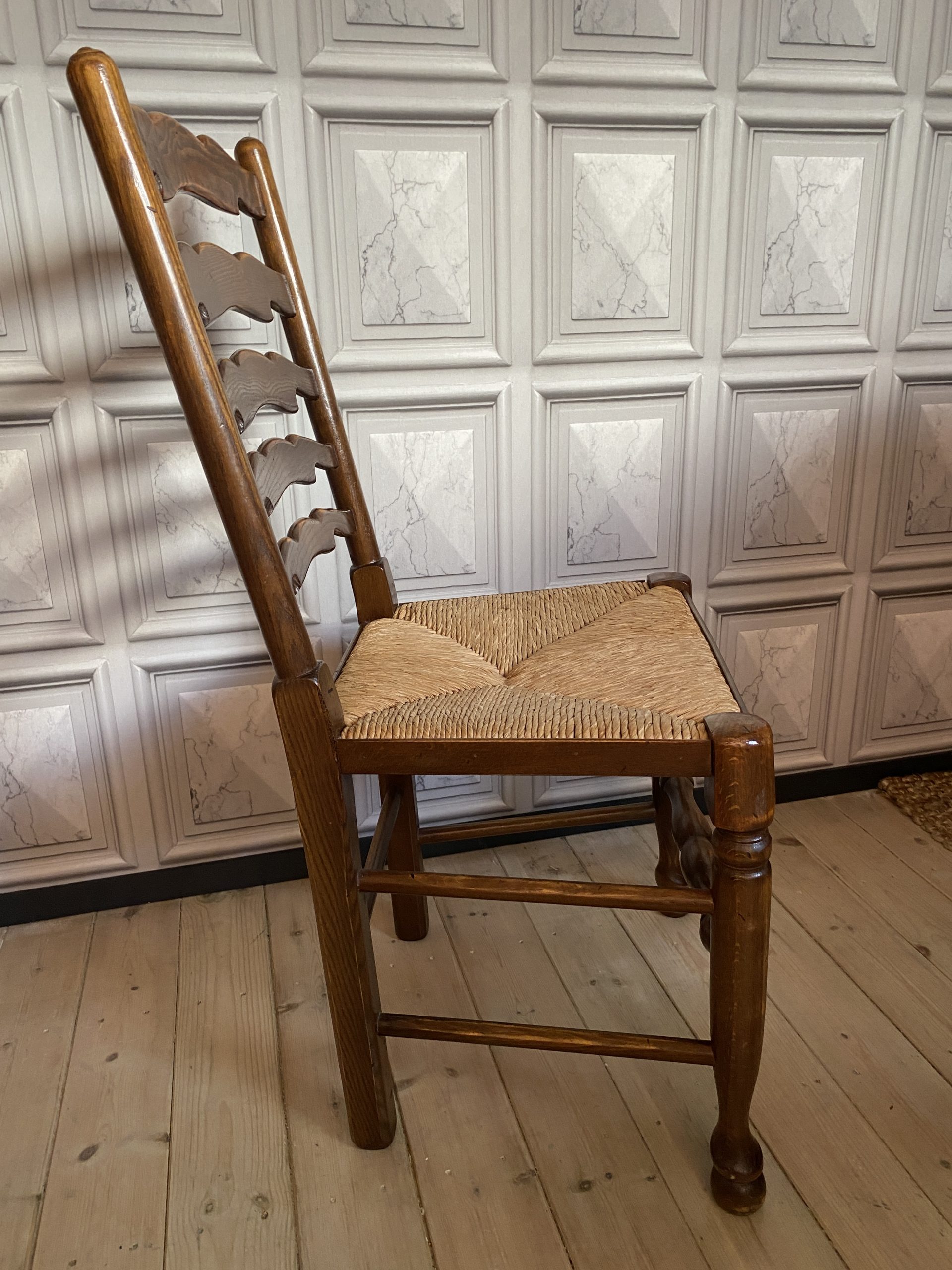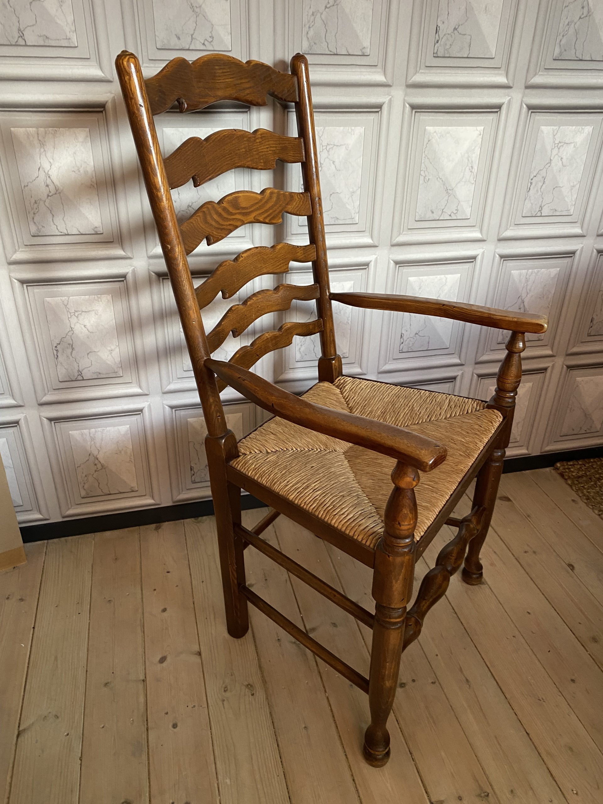 Vintage oak LANCASHIRE style dining chair set. Comprising of 4 upright chairs and 2 carvers. With excellent quarter pattern rush woven seats. Front turned legs on turned feet with straight back legs connected with turned stretchers. Small chairs have 5 backrest rungs and larger carvers each have 6 rungs.