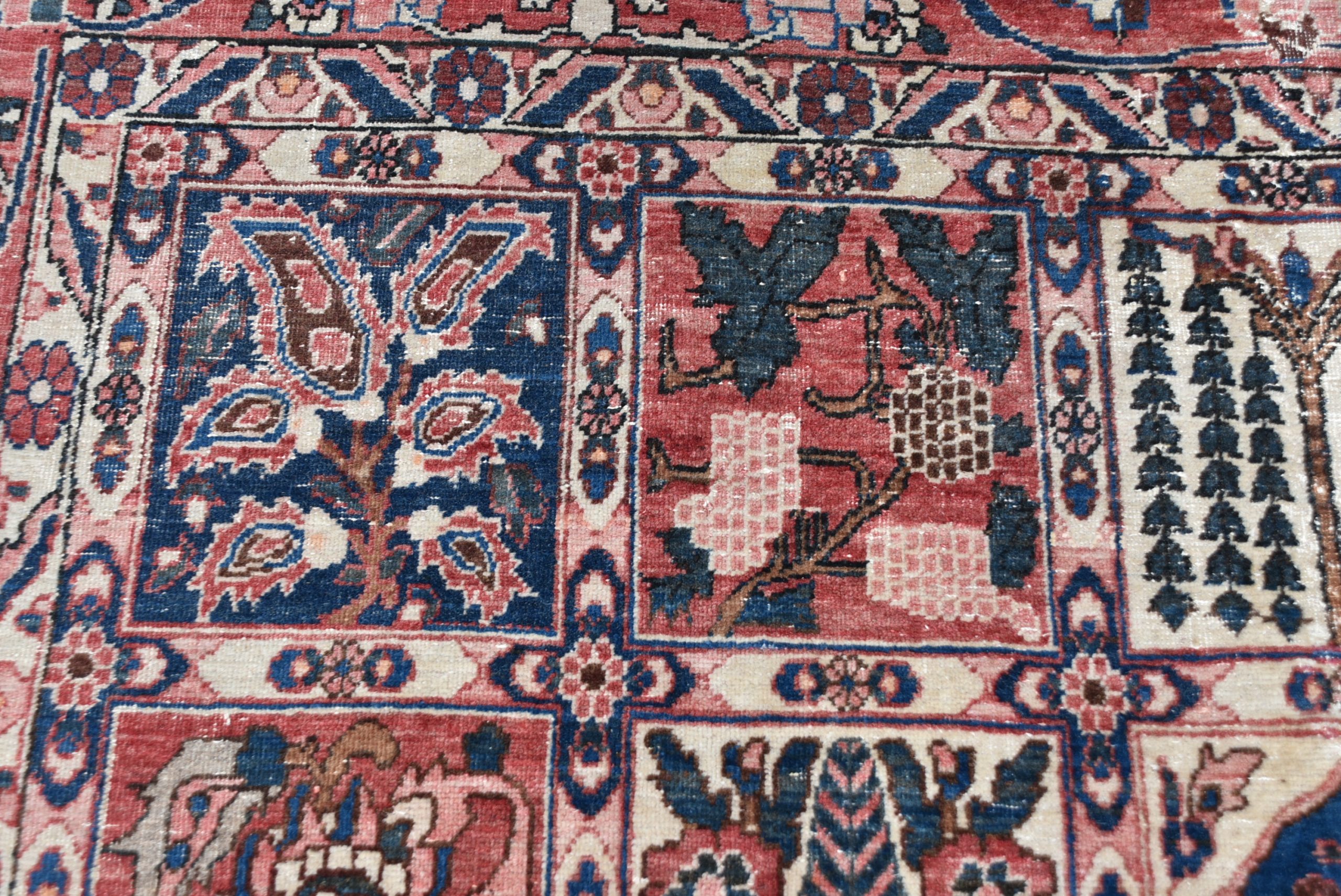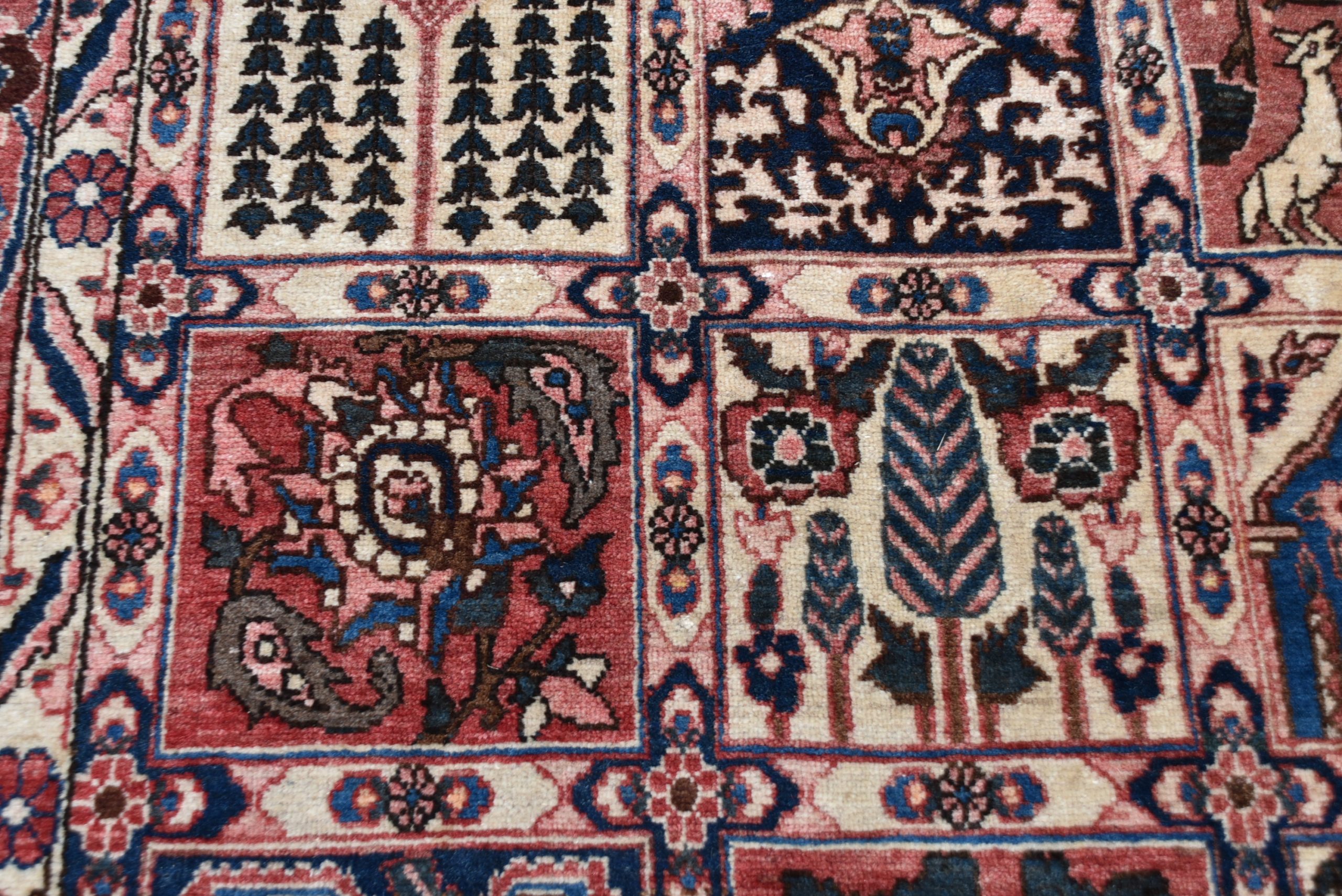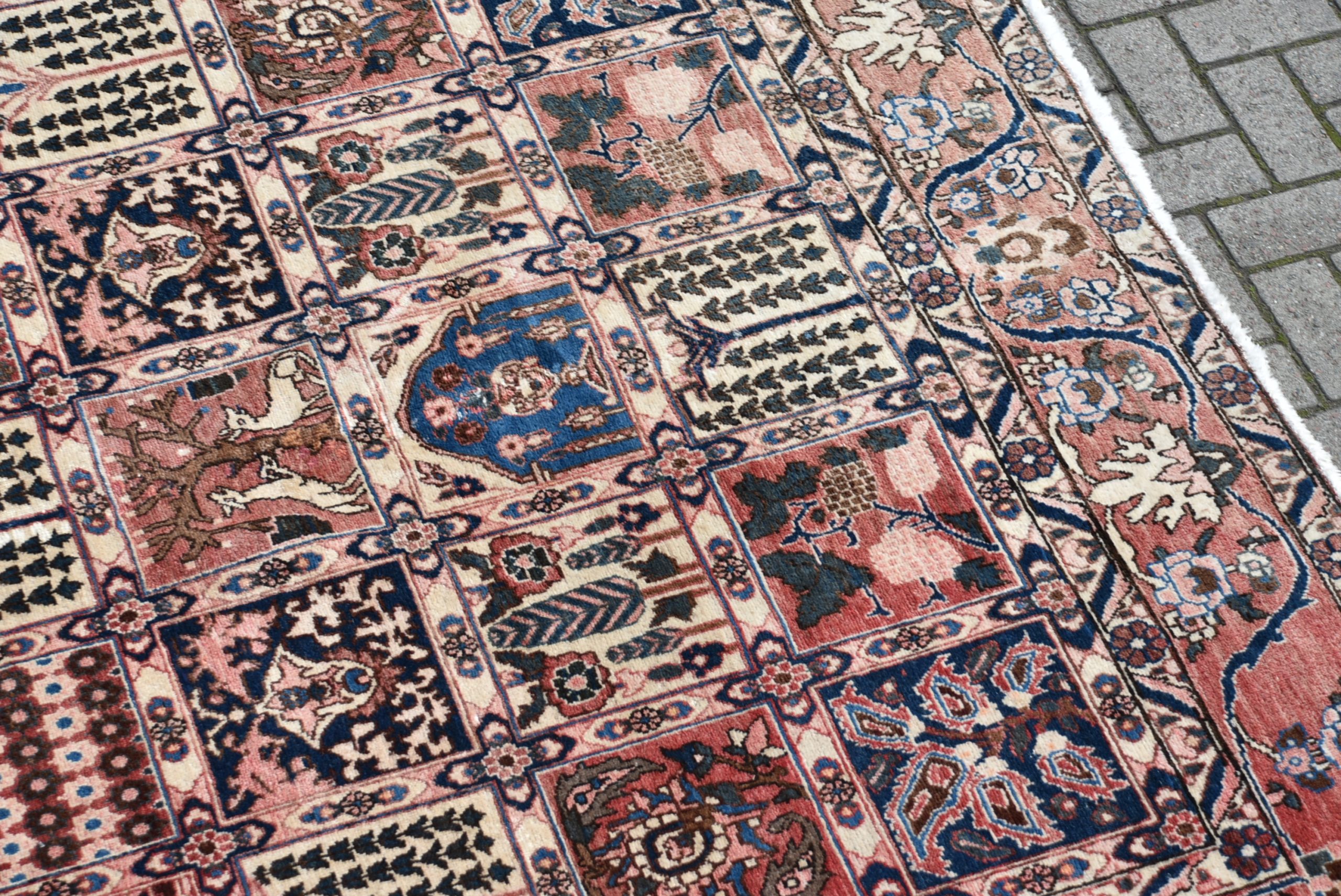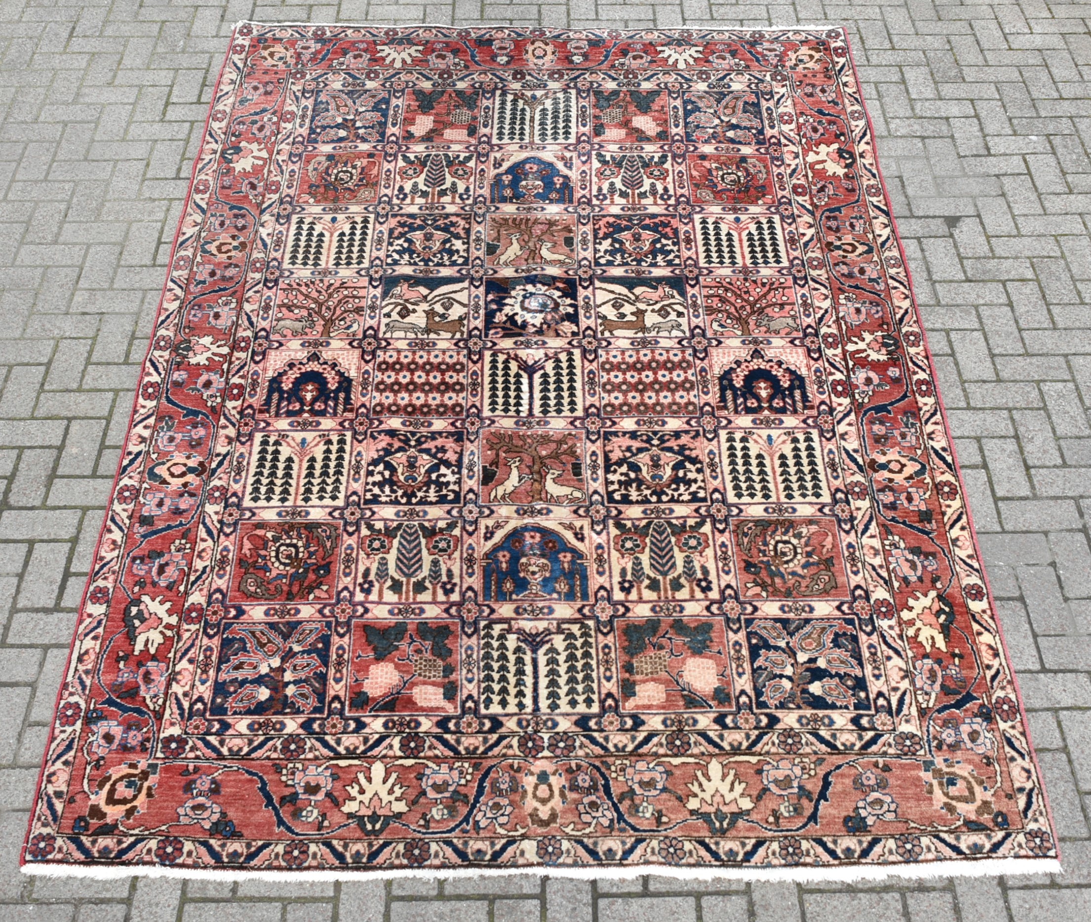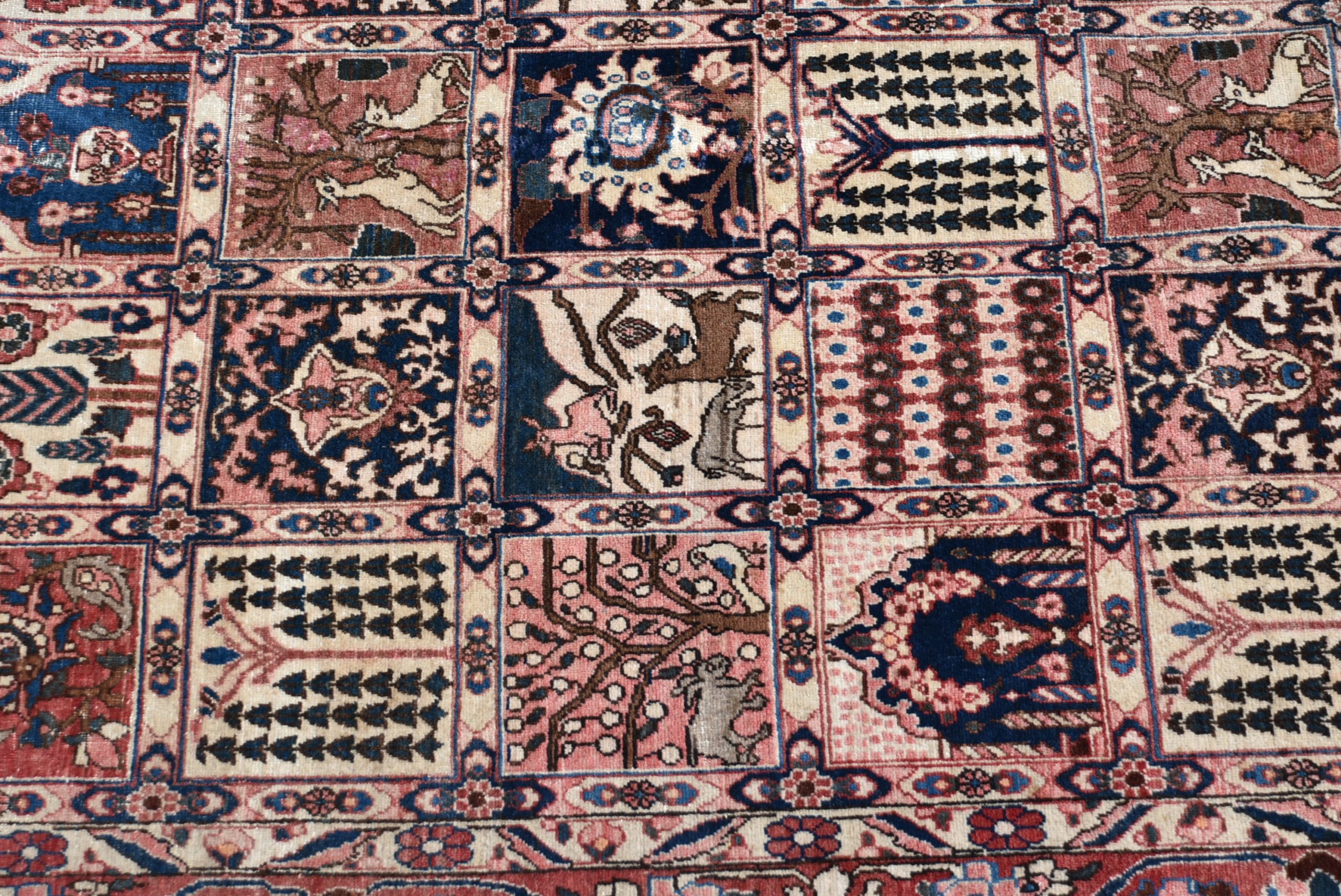 A beautifully hand‑knotted vintage Persian rug, arranged in a striking panelled garden layout composed of small square and rectangular compartments. Each panel is filled with fine motifs in a rich palette of red, indigo, cream, and soft brown. The border is equally detailed, with a continuous meandering floral design framing the central grid. The rug shows the crisp drawing and balanced symmetry typical of mid‑20th‑century Persian village weaving, with subtle abrash and the gentle wear expected of an authentic, hand‑woven piece. A wonderfully decorative carpet that brings warmth, pattern, and cultural depth to any interior.