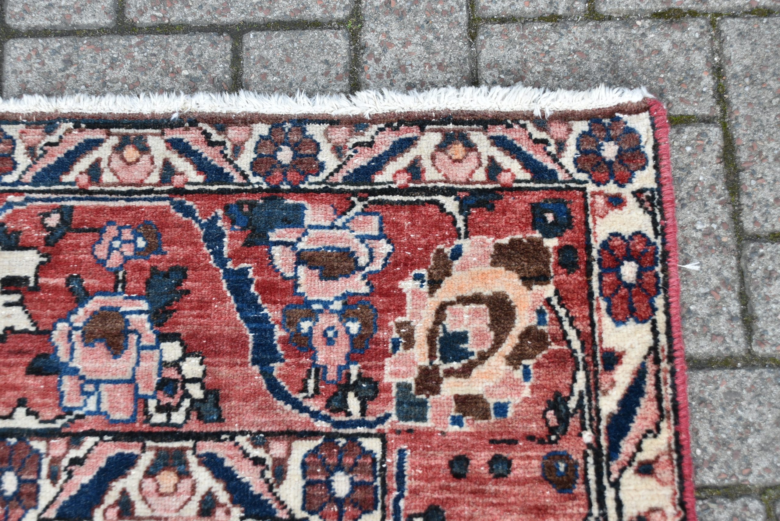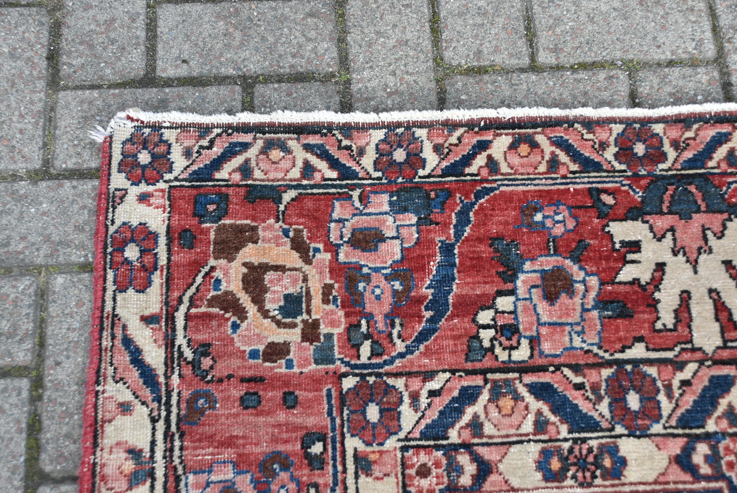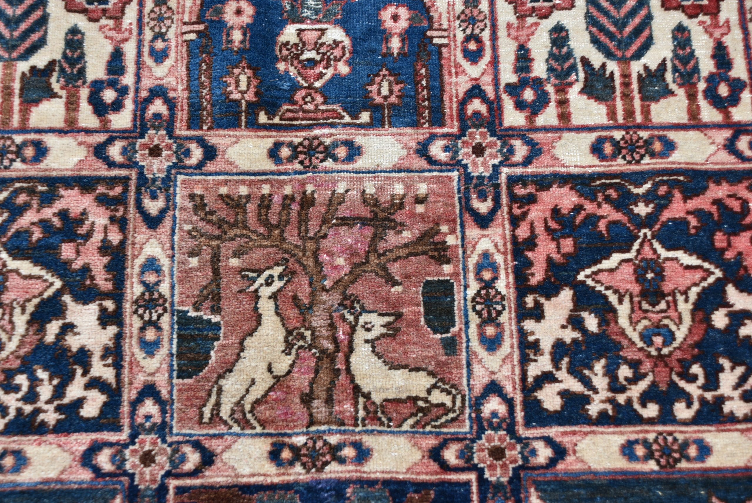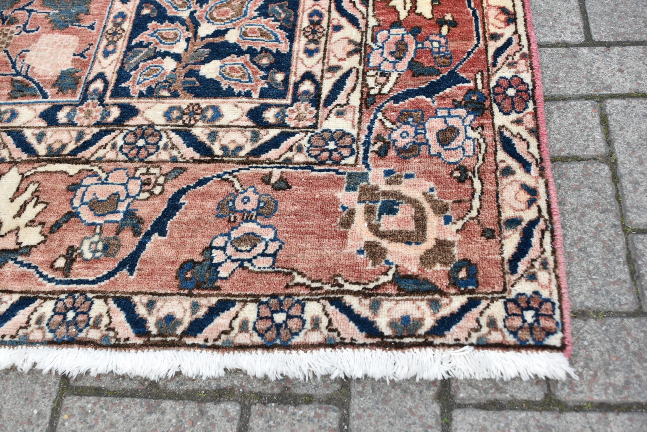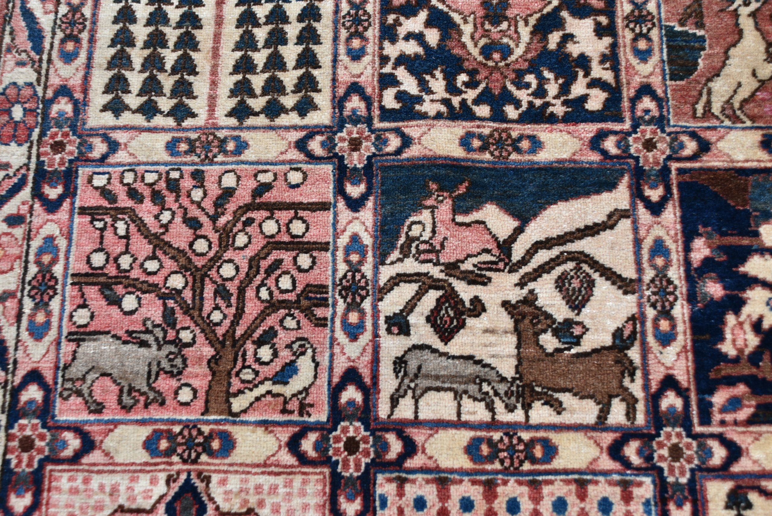 A beautifully hand‑knotted vintage Persian rug, arranged in a striking panelled garden layout composed of small square and rectangular compartments. Each panel is filled with fine motifs in a rich palette of red, indigo, cream, and soft brown. The border is equally detailed, with a continuous meandering floral design framing the central grid. The rug shows the crisp drawing and balanced symmetry typical of mid‑20th‑century Persian village weaving, with subtle abrash and the gentle wear expected of an authentic, hand‑woven piece. A wonderfully decorative carpet that brings warmth, pattern, and cultural depth to any interior.