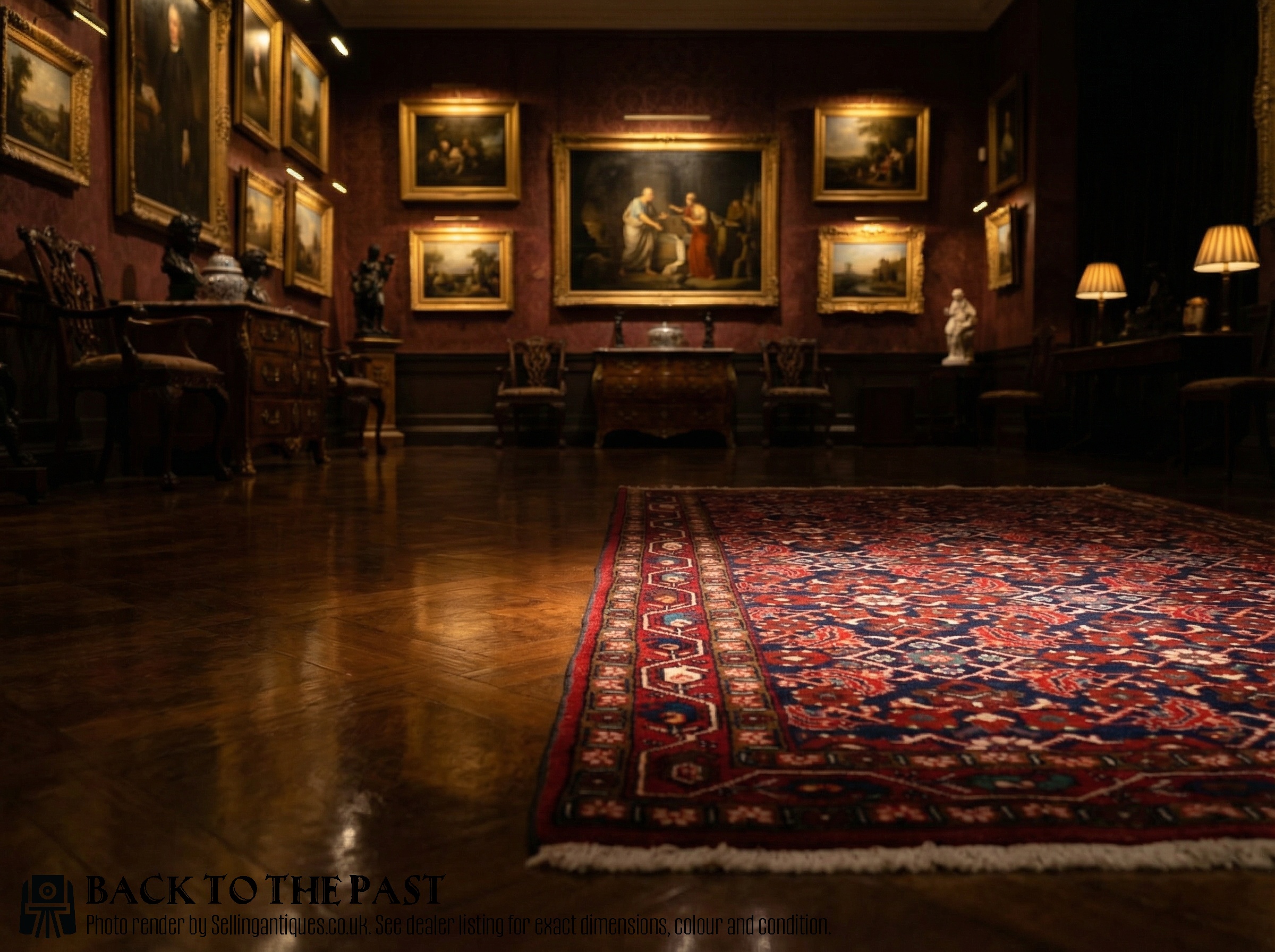 A richly woven Persian rug of traditional design, featuring a deep crimson field adorned with symmetrical floral and geometric motifs in navy, ivory, and forest green. The intricate border comprises multiple bands of stylised blossoms and angular forms, framing the central pattern with rhythmic precision. Likely hand-knotted, the craftsmanship and complexity suggest a piece of cultural and artistic significance—ideal for collectors or interiors seeking warmth and heritage.