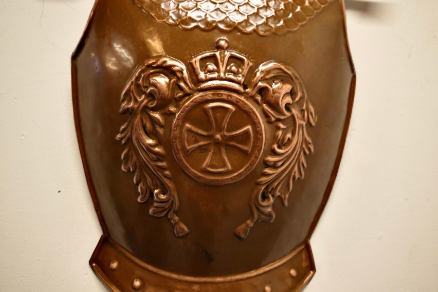 Wall hanging Arts and Crafts copper breast plate shield with cross swords A Large Decorative wall piece the copper is hand beaten and has a Cross with Crown over The swords are held in the back but not removable, a good looking piece of Traditional Pub Decoration This wall decoration is 25”x 15” TJK187. Manufacture Date : 1920 Materials : Copper