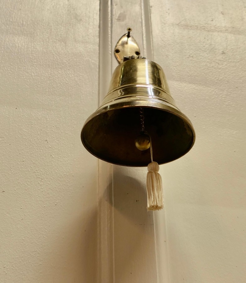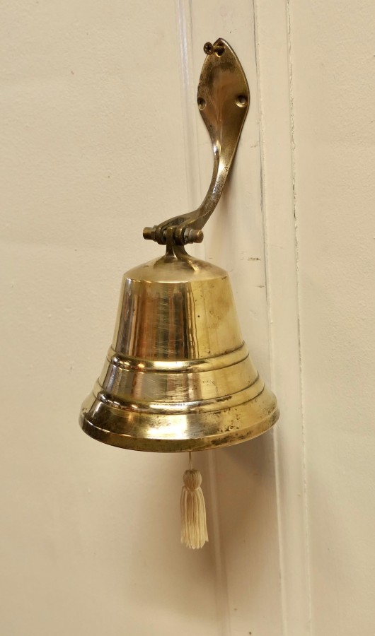 Wall hanging brass door bell. This bell is on a hinged brass bracket and comes complete with hand clapper, it is in very good condition, it is very loud and would work well as a door bell A great piece in excellent condition. The bell is 10” in high, 5” in dimeter. HM78 Manufacture Date : 1920 Materials : Brass