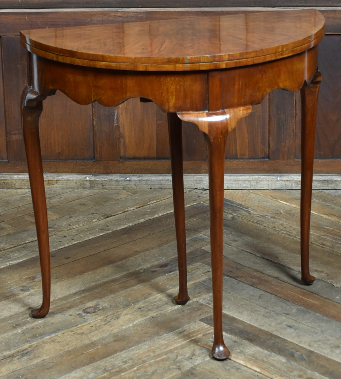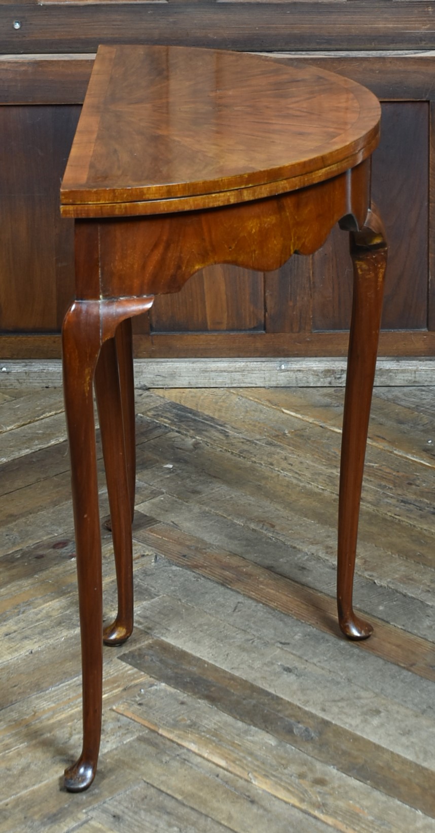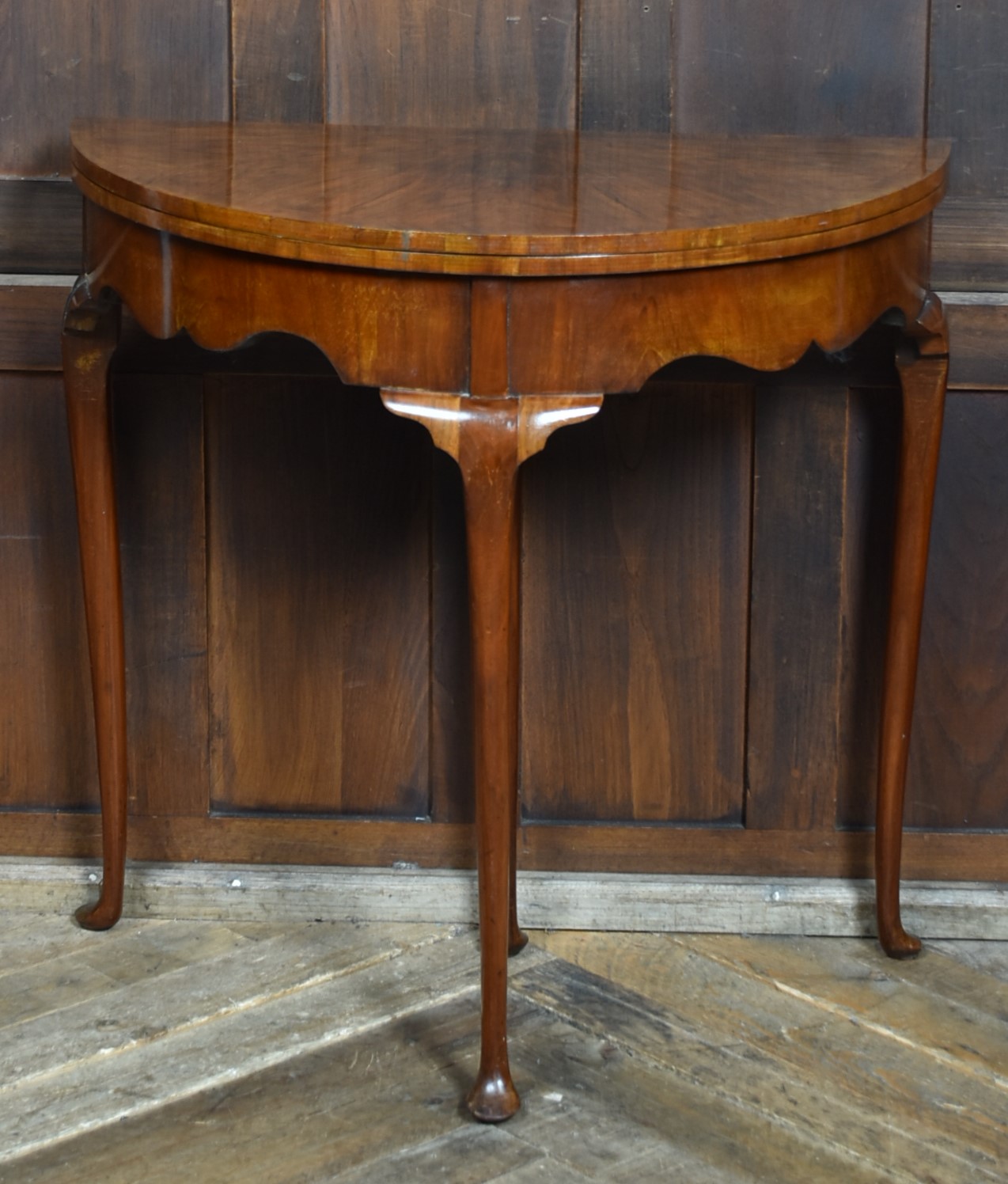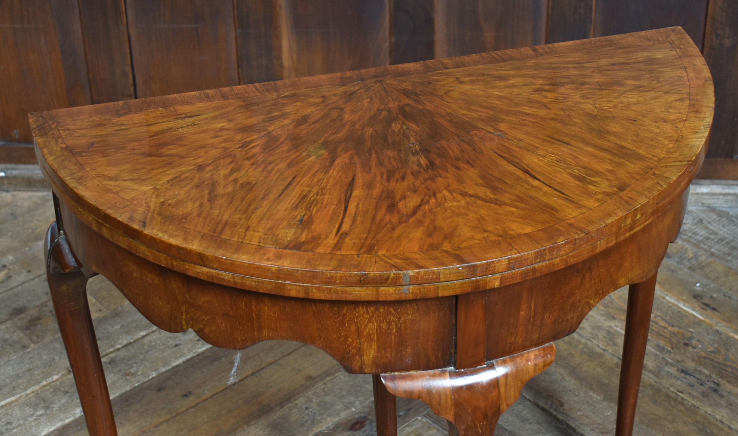 A stunning walnut demi‑lune card table or side table, standing on four elegant cabriole legs with pad feet. The top is beautifully veneered in figured walnut and opens on a hinge to reveal a circular green baize playing surface. This rests on a pull‑out rear leg, which is also baize‑topped and incorporates a small compartment for playing cards, chips, and other gaming pieces. When opened, the top measures 77 cm. The table is in excellent condition, with only minor marks and scuffs consistent with age and use. These do nothing to detract from its charm. A beautiful and versatile piece that will look superb in many settings throughout the home.