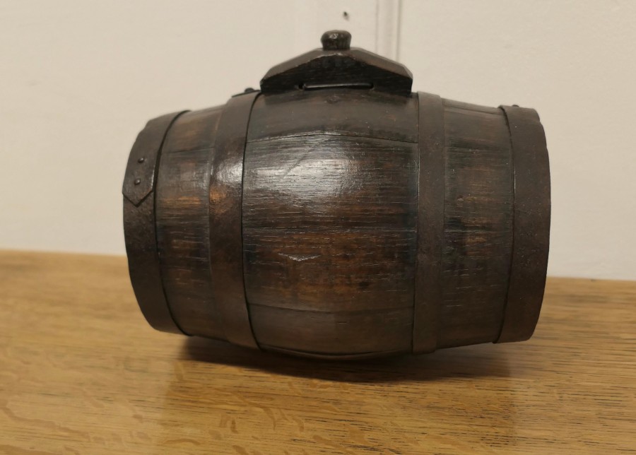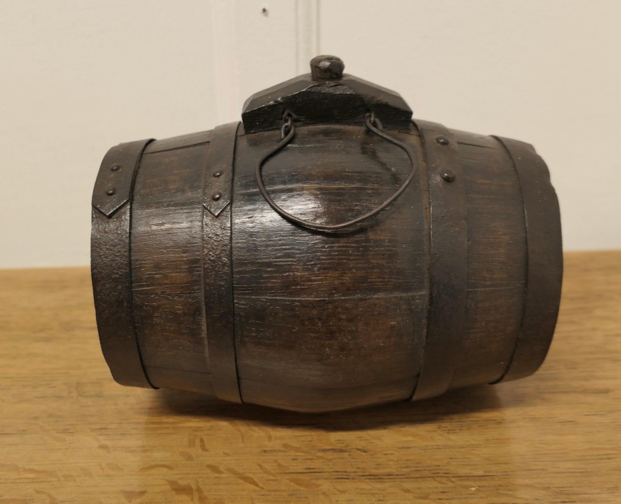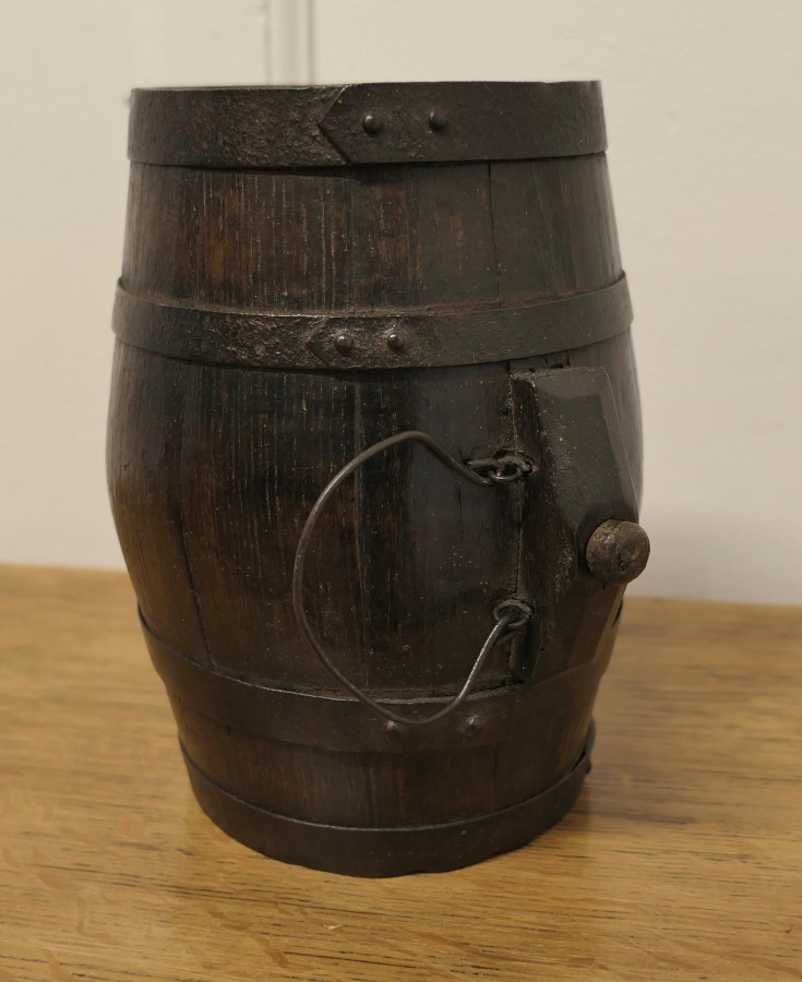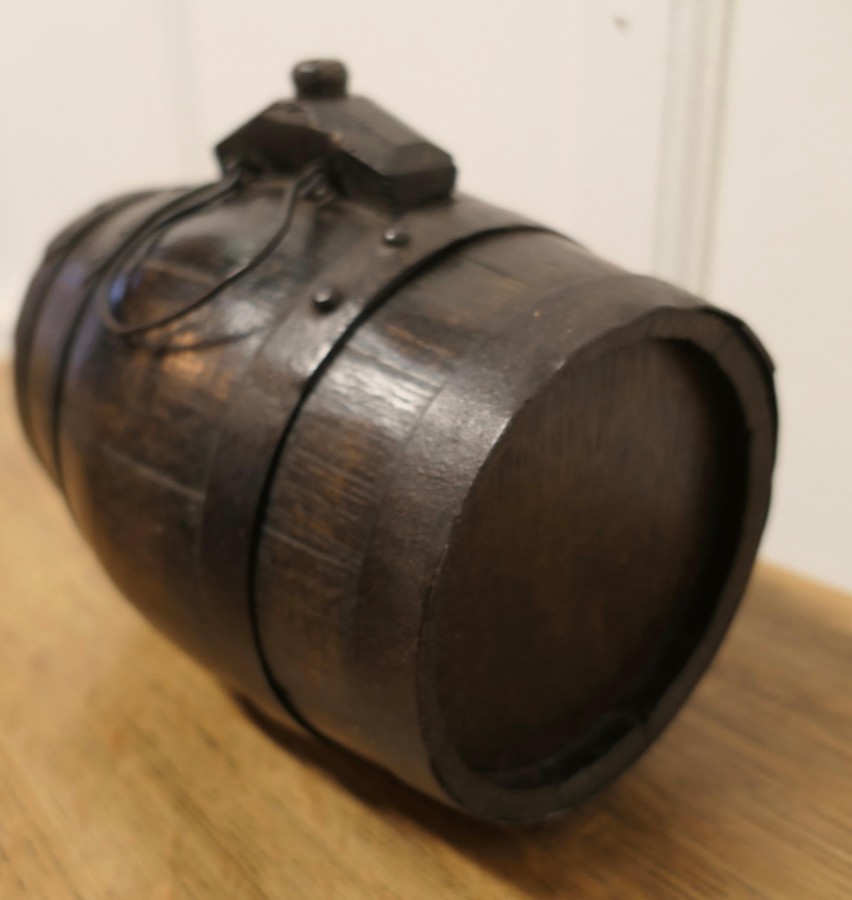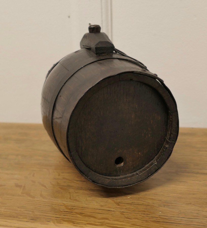 Welsh Oak Cider Flask, Welsh Oak Harvest Costrel Just the thing to carry your Lunch time Cider into the field during harvest A Beautiful looking piece in Oak with Handle ( used to hang the Costrel to the plough horse) This one is 10”x 8” in diameter VY23 Manufacture Date : 1850 Materials : Oak