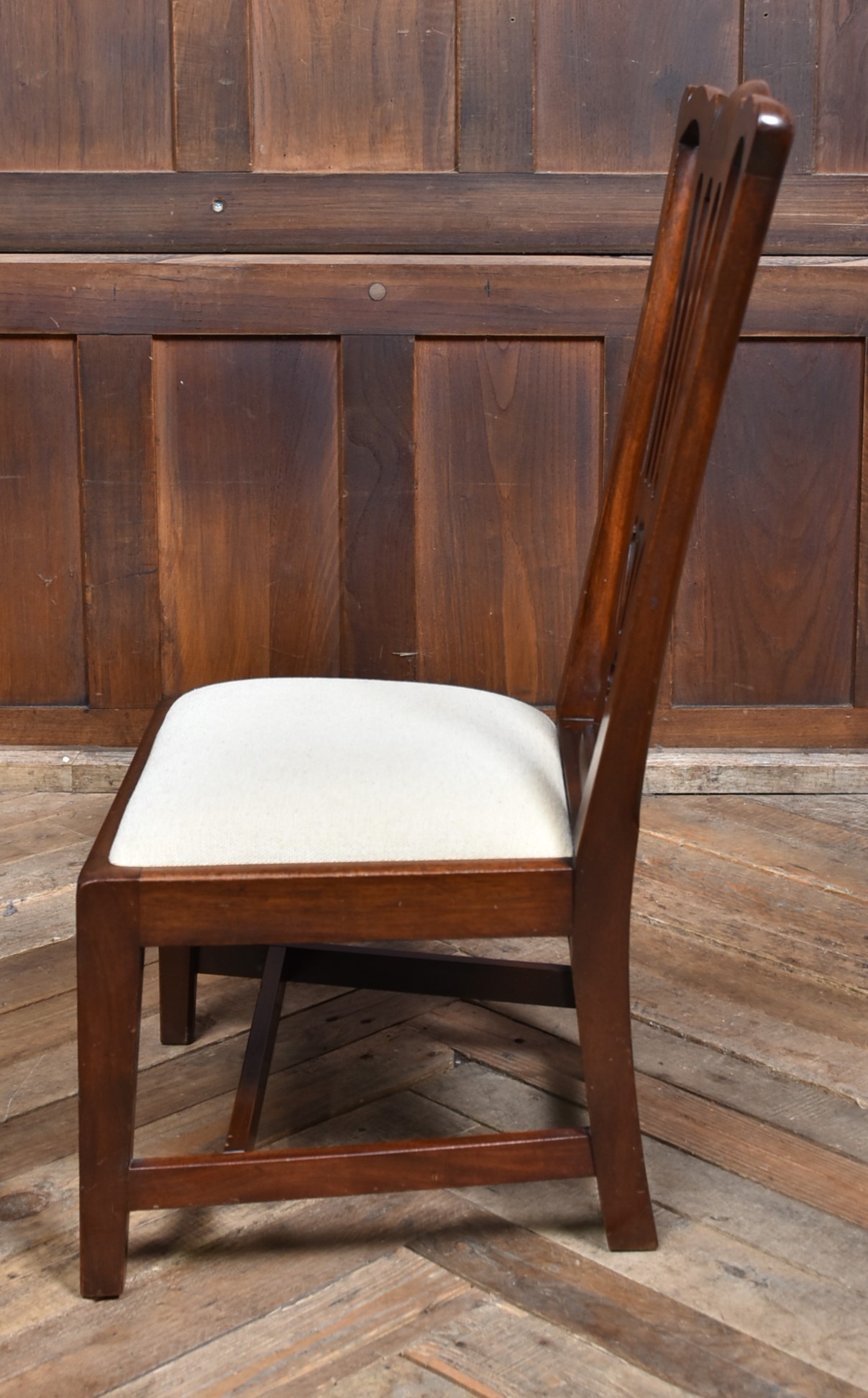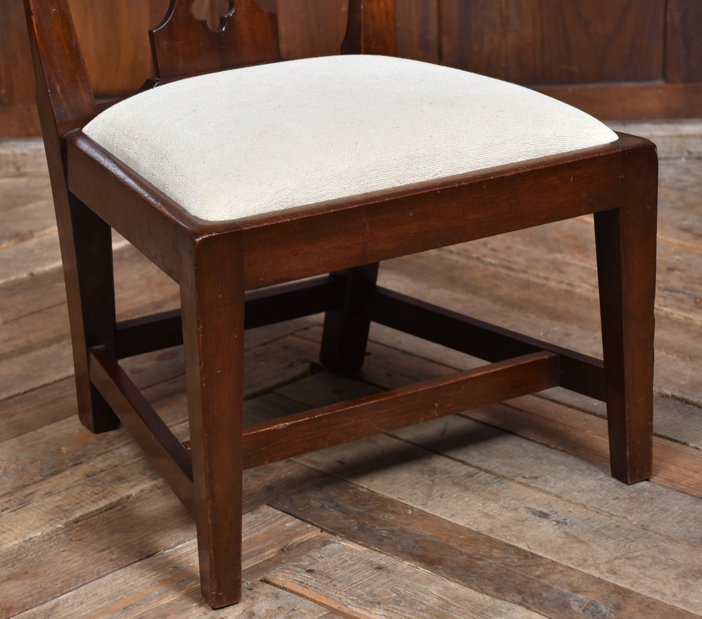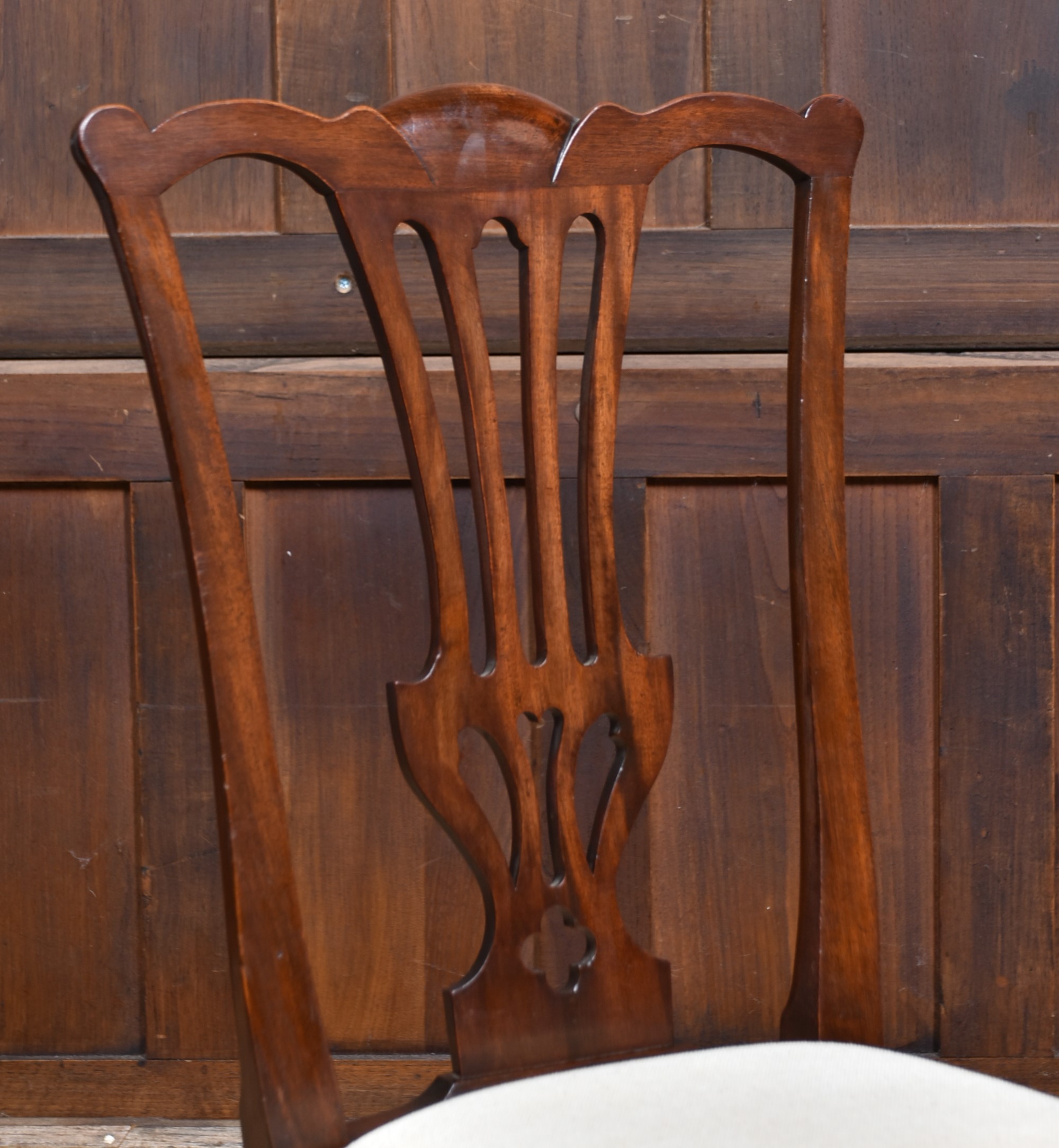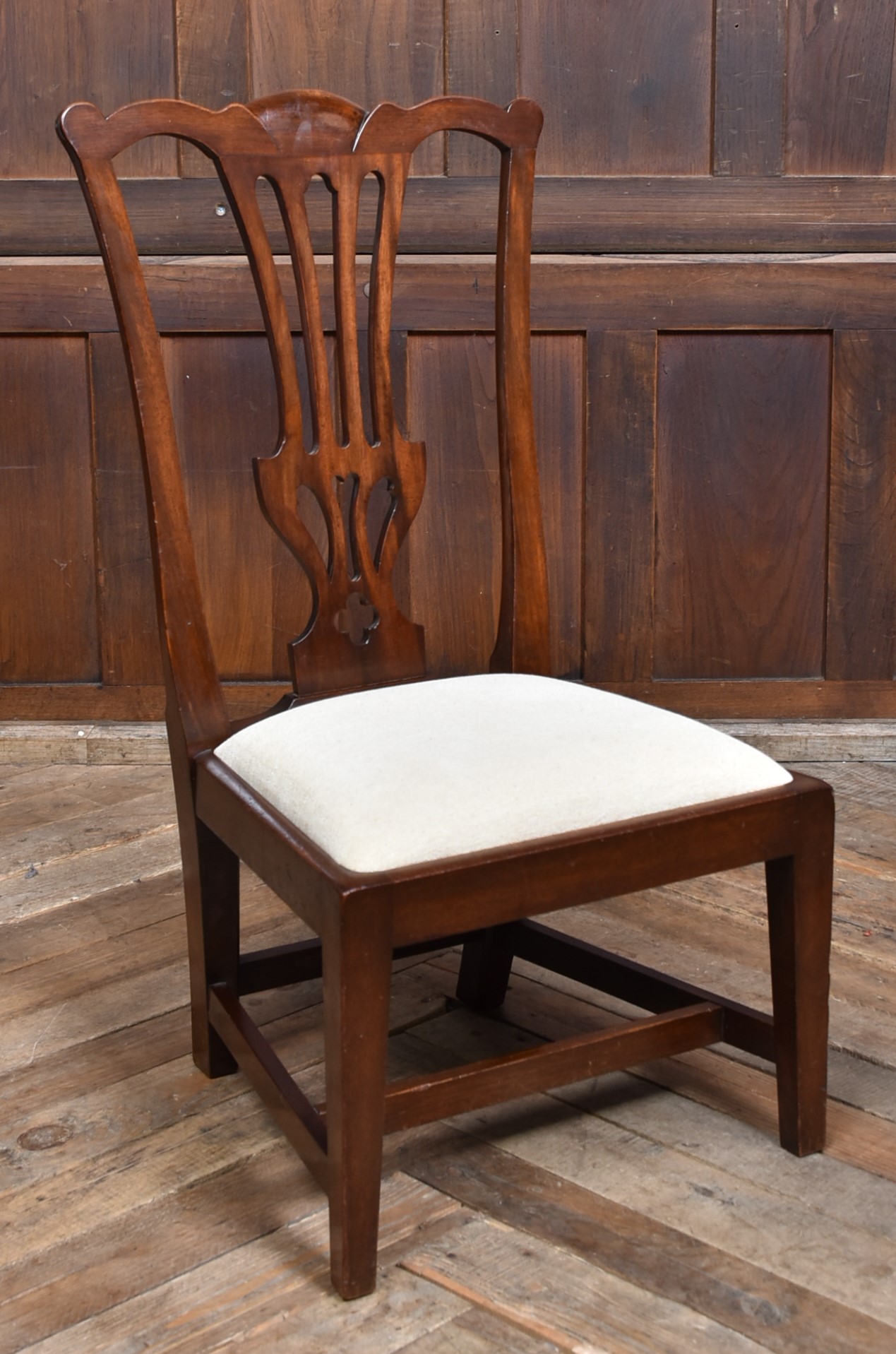Charming mahogany Wheeler of Arncroach chair in excellent condition. The chair features a beautifully shaped top rail and pierced central slat. Standing on square legs to the front and slightly swept back legs, united by an H stretcher and a cross stretcher at the back. The drop seat upholstery is free of any marks or rips, but it is easy to recover to suit your taste. This chair is a fine example of Edwardian craftsmanship, combining both style and comfort. With its superb colouring and patina this is a perfect addition to any room.