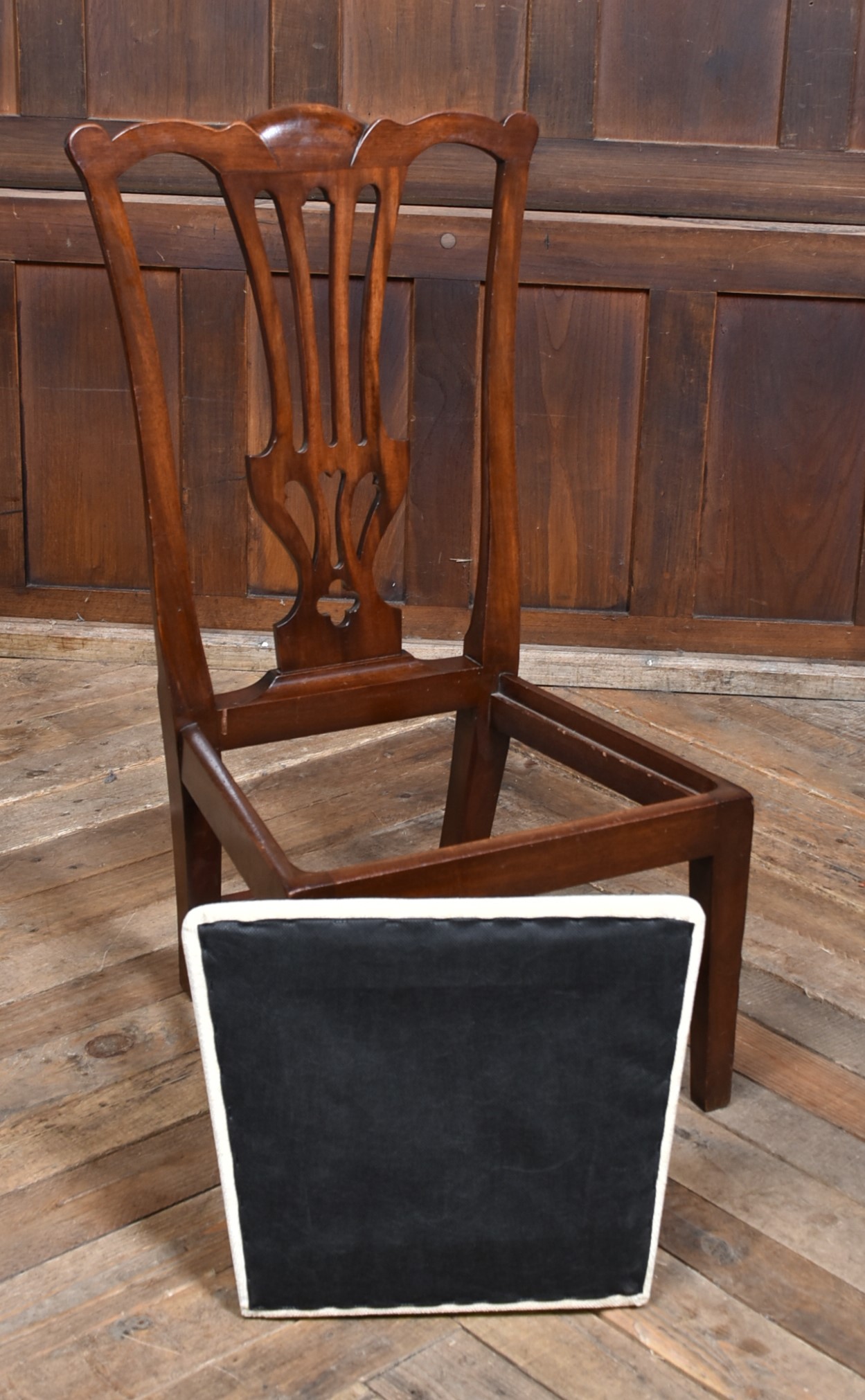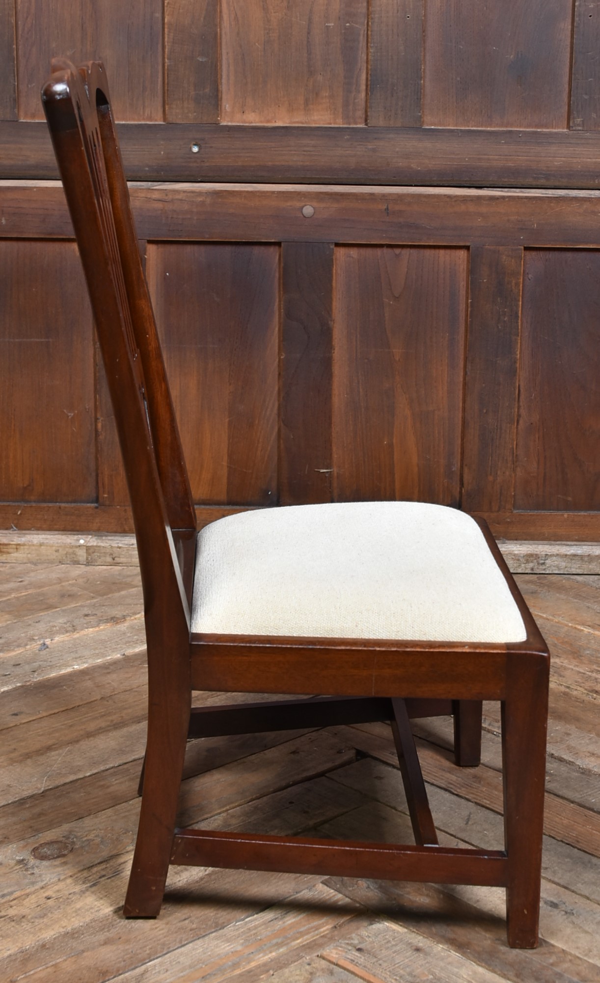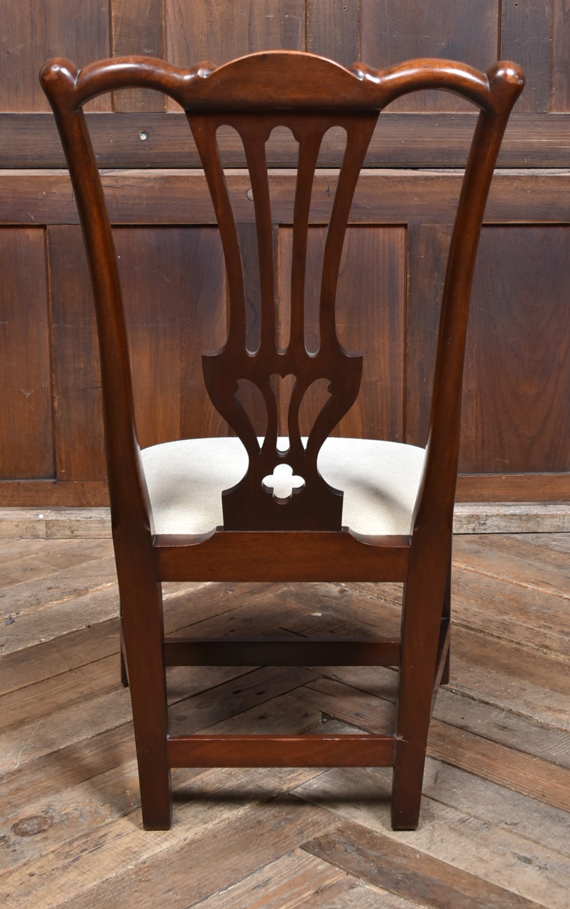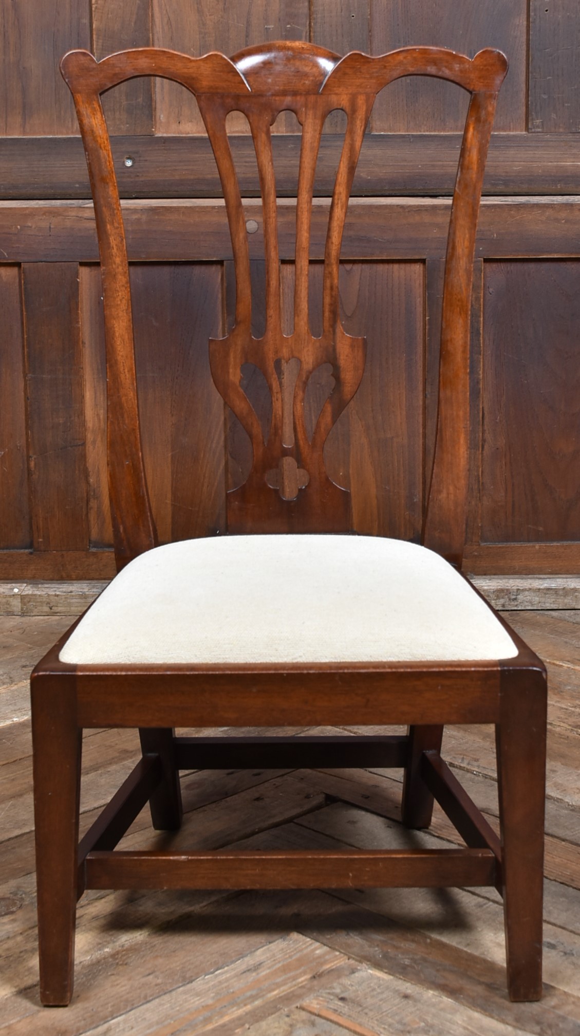 Charming mahogany Wheeler of Arncroach chair in excellent condition. The chair features a beautifully shaped top rail and pierced central slat. Standing on square legs to the front and slightly swept back legs, united by an H stretcher and a cross stretcher at the back. The drop seat upholstery is free of any marks or rips, but it is easy to recover to suit your taste. This chair is a fine example of Edwardian craftsmanship, combining both style and comfort. With its superb colouring and patina this is a perfect addition to any room.