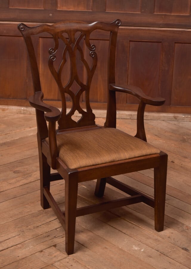 Superb mahogany arm chair by Wheelers of Arncroach in Fife. It has out scrolled arms and the classic Chippendale style back has an open splat and curved top ends. Standing on square tapering legs to the front and slightly out swept back legs, united by an H stretcher and a cross stretcher at the back. The drop seat upholstery is free of any marks or rips however is easy to recover to suite taste. A charming little chair with amazing colouring and patina, a perfect addition to any room.