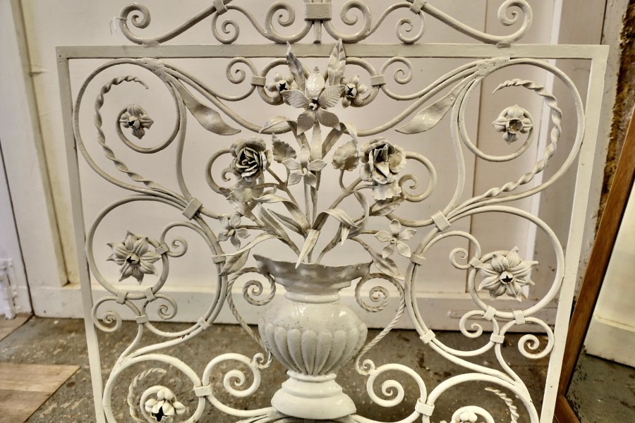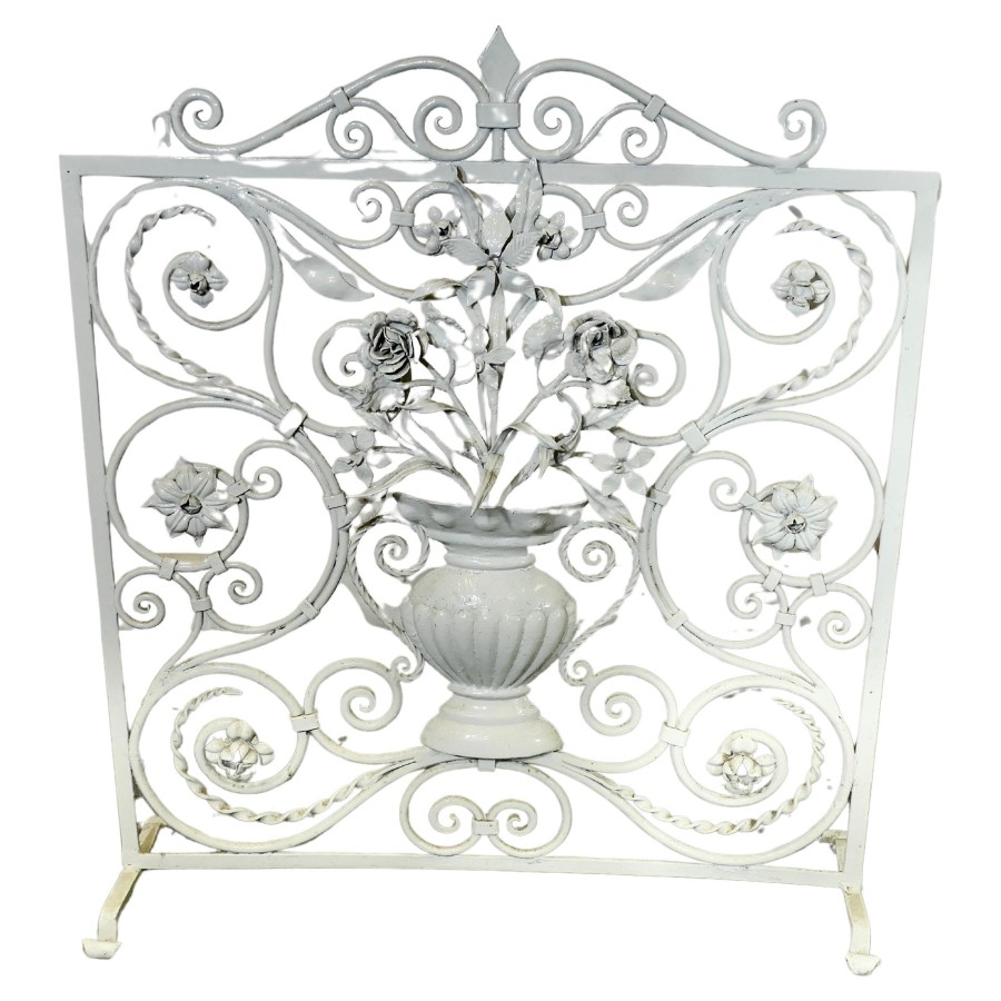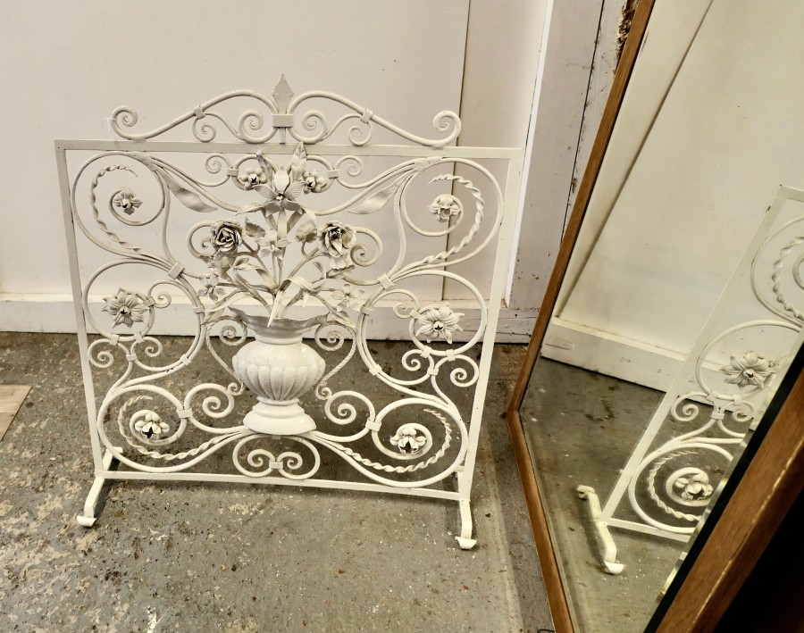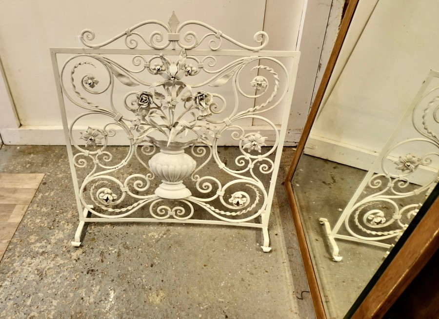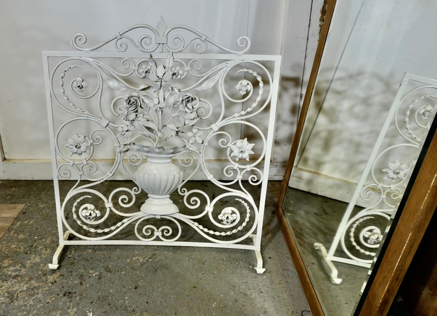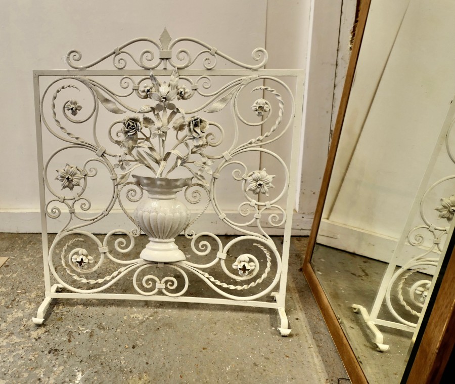 White Wrought Iron and Toleware Fire screen Decorated with Flowers This is a good sturdy Firescreen, it has a decorative wrought iron decoration set with a vase of Toleware flowers The guard is in good attractive condition it is 31” high, 28” wide and 8” deep at the floor TZX235 Manufacture Date : 19th century Materials : Iron