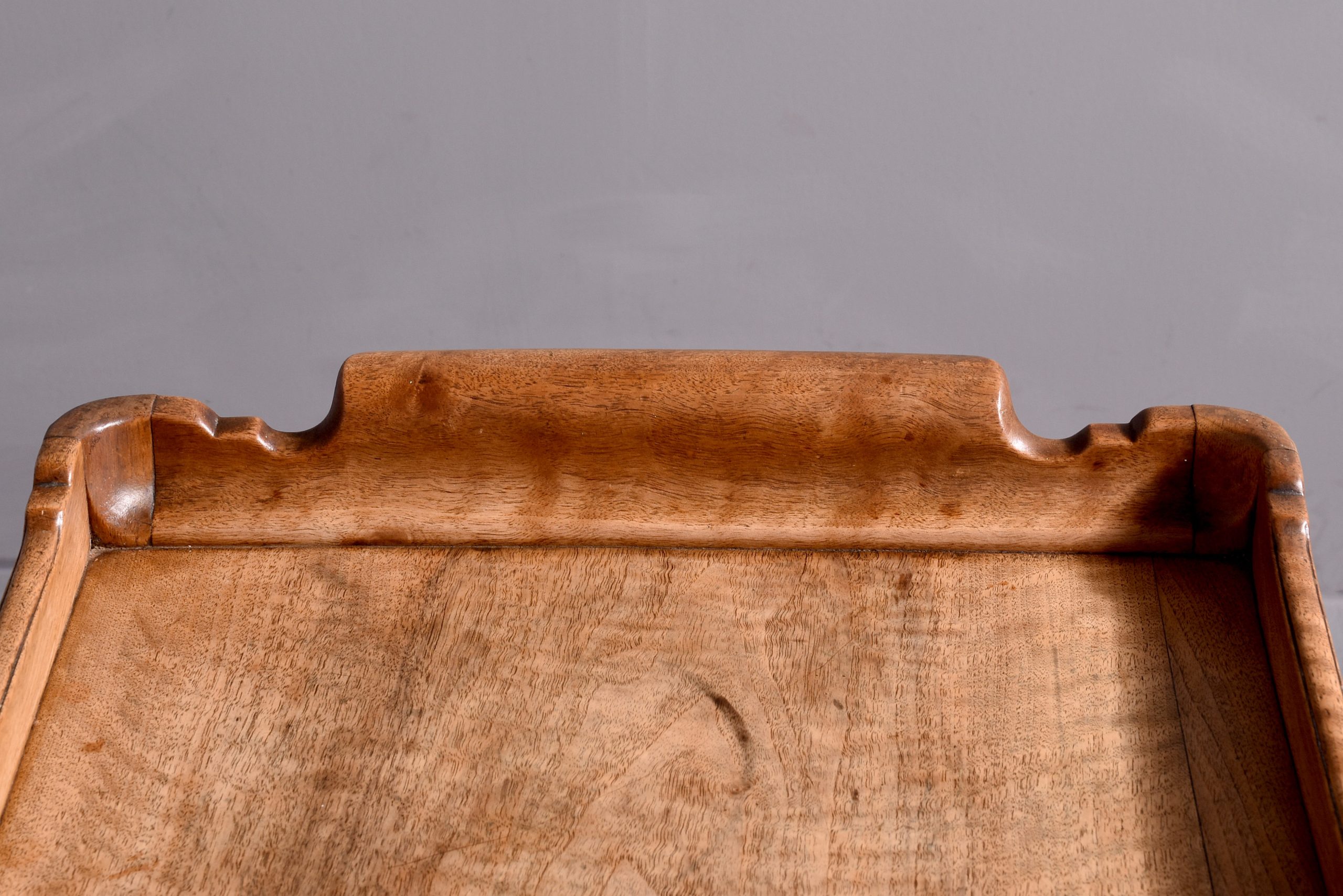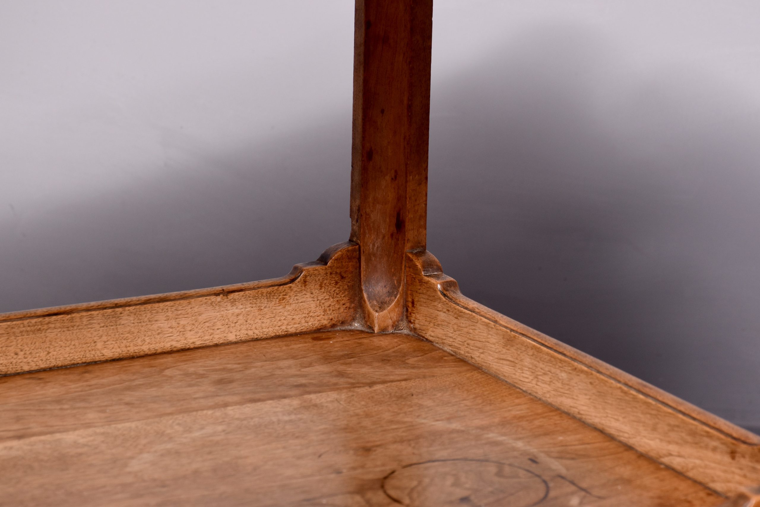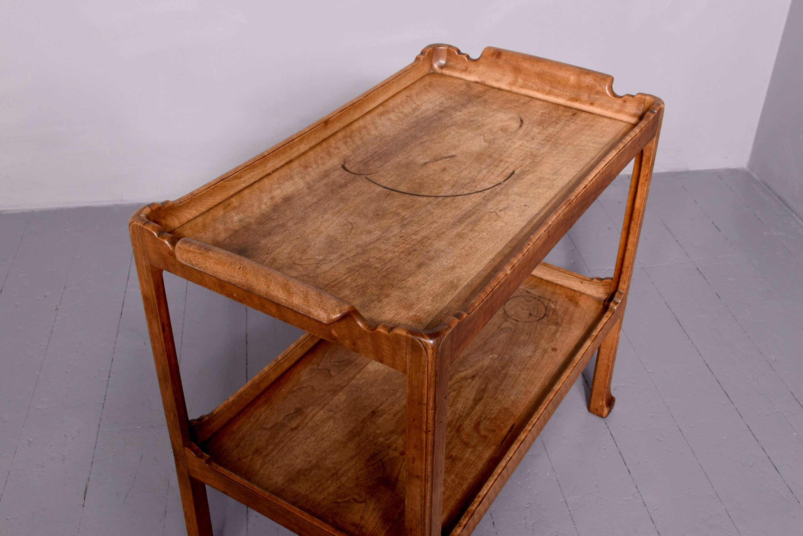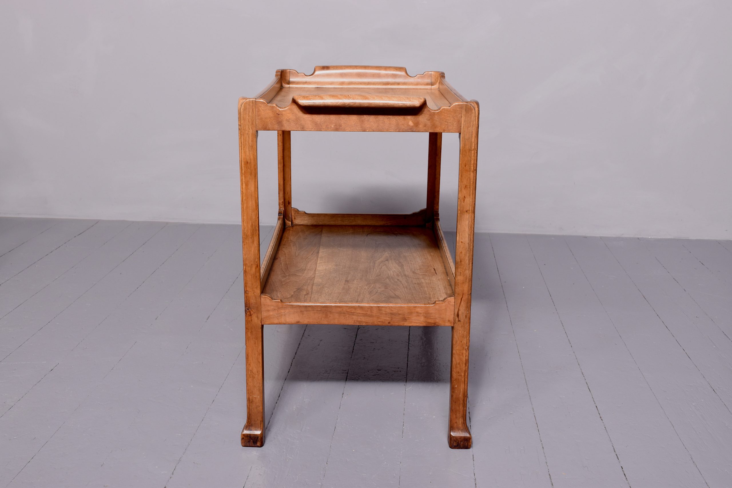 Circa 1910. A walnut 2 tier trolley by ‘Whytock & Reid of Edinburgh’, the solid walnut top with a wraparound gallery raised to the sides to form curvaceous lifting handles, the lower tier with wrap around gallery, resting on 4 classic ‘Whytock & Reid’ legs, square legs chamfered on the inside with beading on the fore-edge, finishing on a stylized ‘Whytock & Reid’ foot.