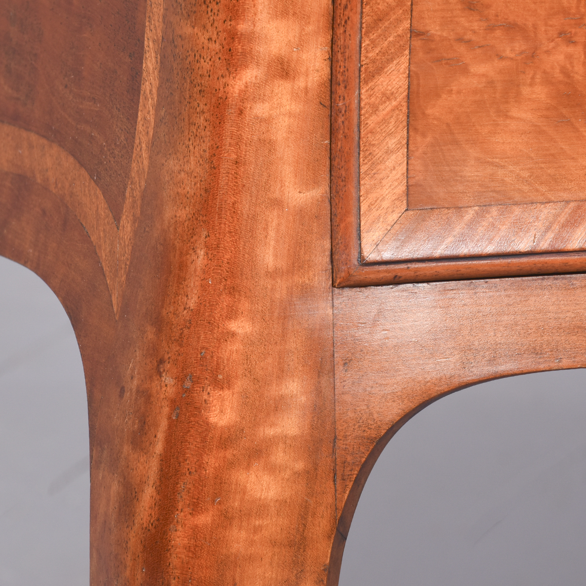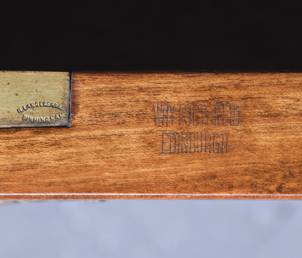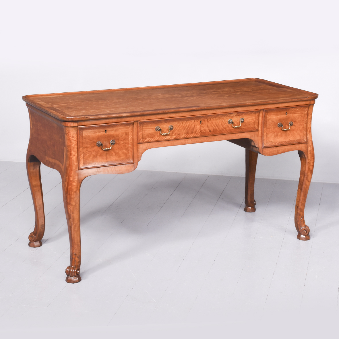 Circa 1900 A quality satinwood and walnut knee hole desk by Whytock & Reid of Edinburgh, the silky satinwood top with broad walnut cross-banding and a raised ledge to the backside which tapers away at the front with a half round fore-edge, the front with 1 long shaped drawer flanked by a pair of deeper drawers, with banding similar to the top, each stamped Whytock & Reid Edinburgh, on the top the drawer, with cast brass swan neck handles with elegant pierced back-plates, the freestanding curvaceous body rests on 4 elegant cabriole legs with carving on the face towards the base finishing on a curled toe resting on a hexagonal foot.