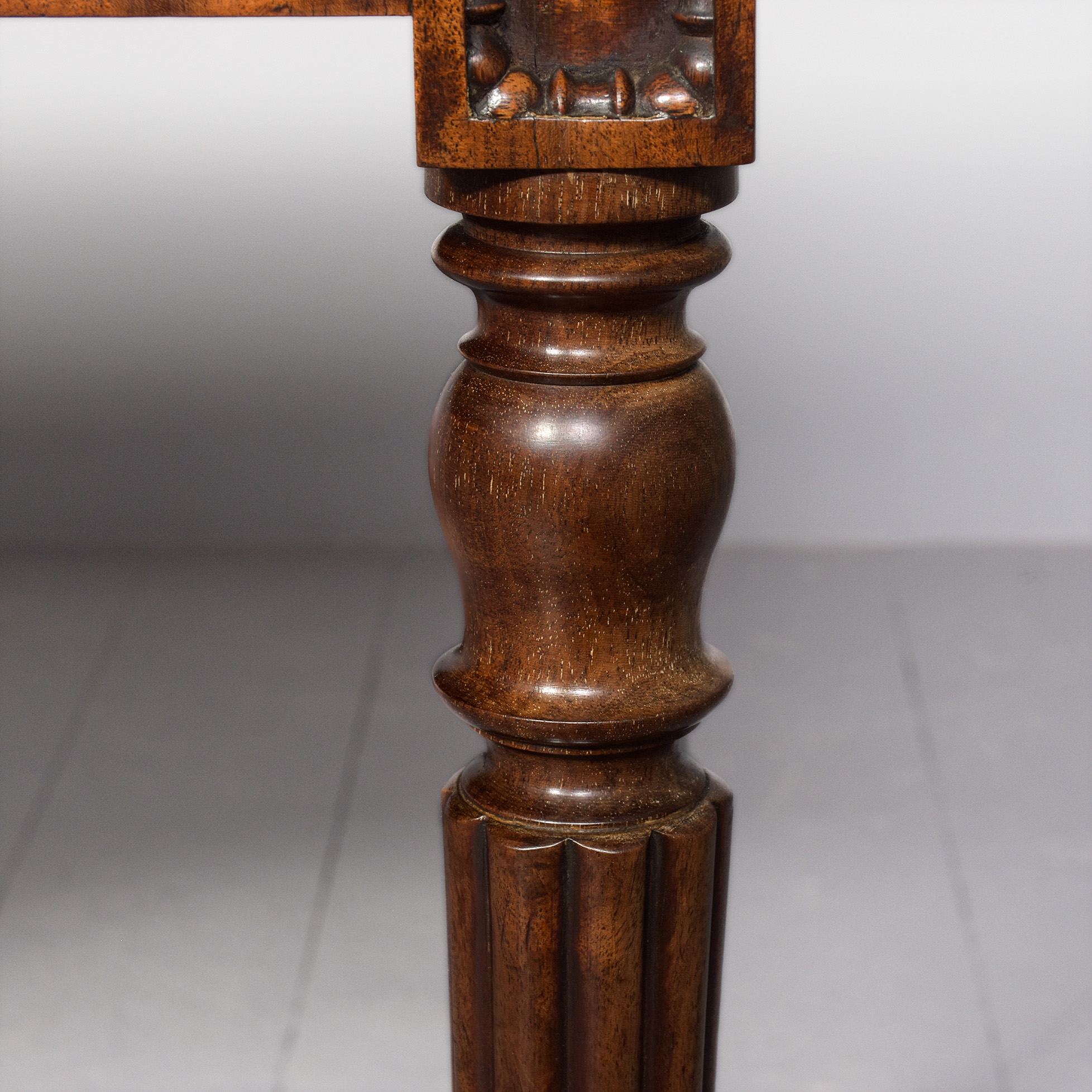 Circa 1840. William IV, Gillows-style, crossbanded and ebony inlaid side table or dressing table. The rectangular, figured mahogany crossbanded top with ebony inlay over five frieze drawers with brass loop handles and carved quarter brackets, supported on Gillows-style fluted turned legs.