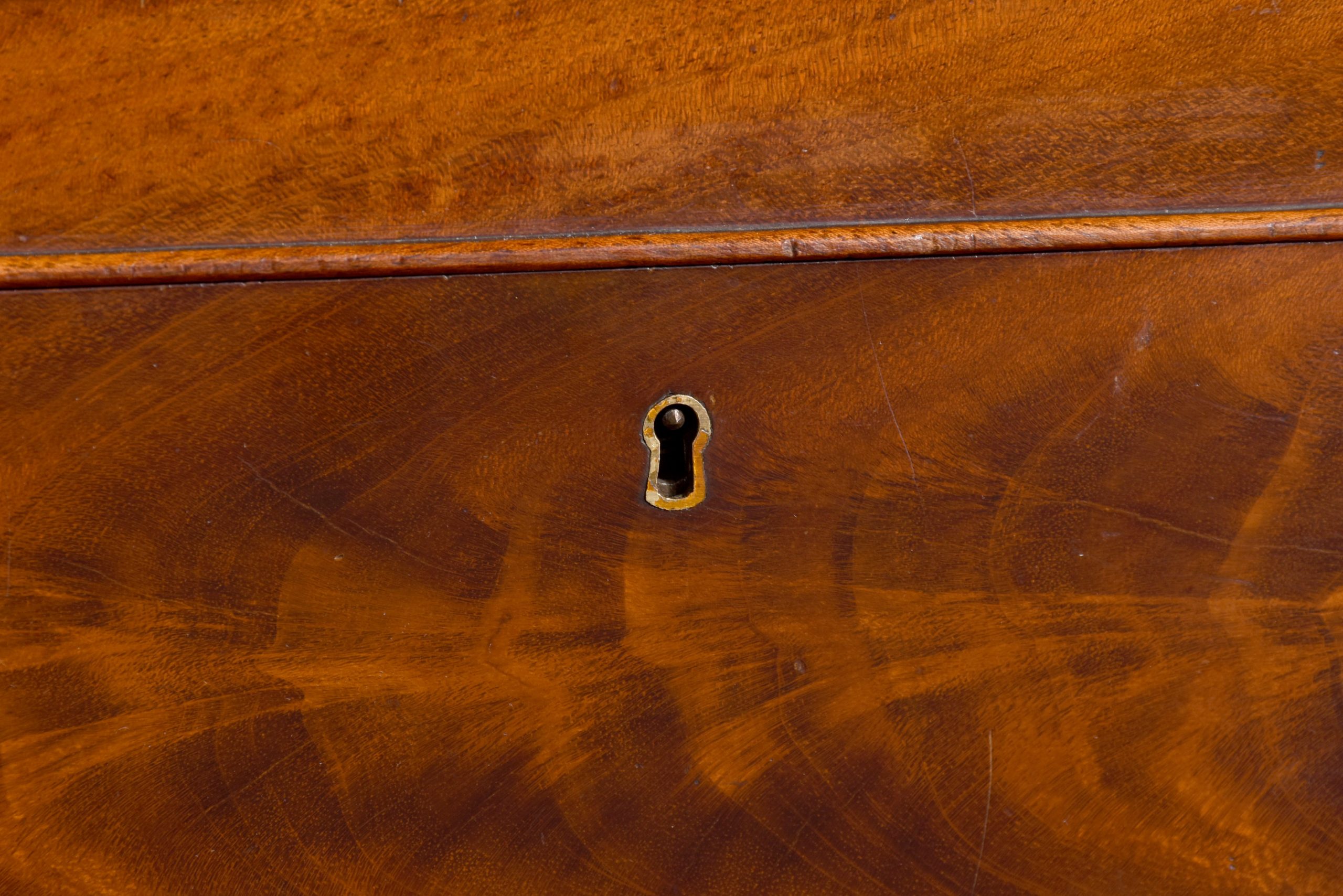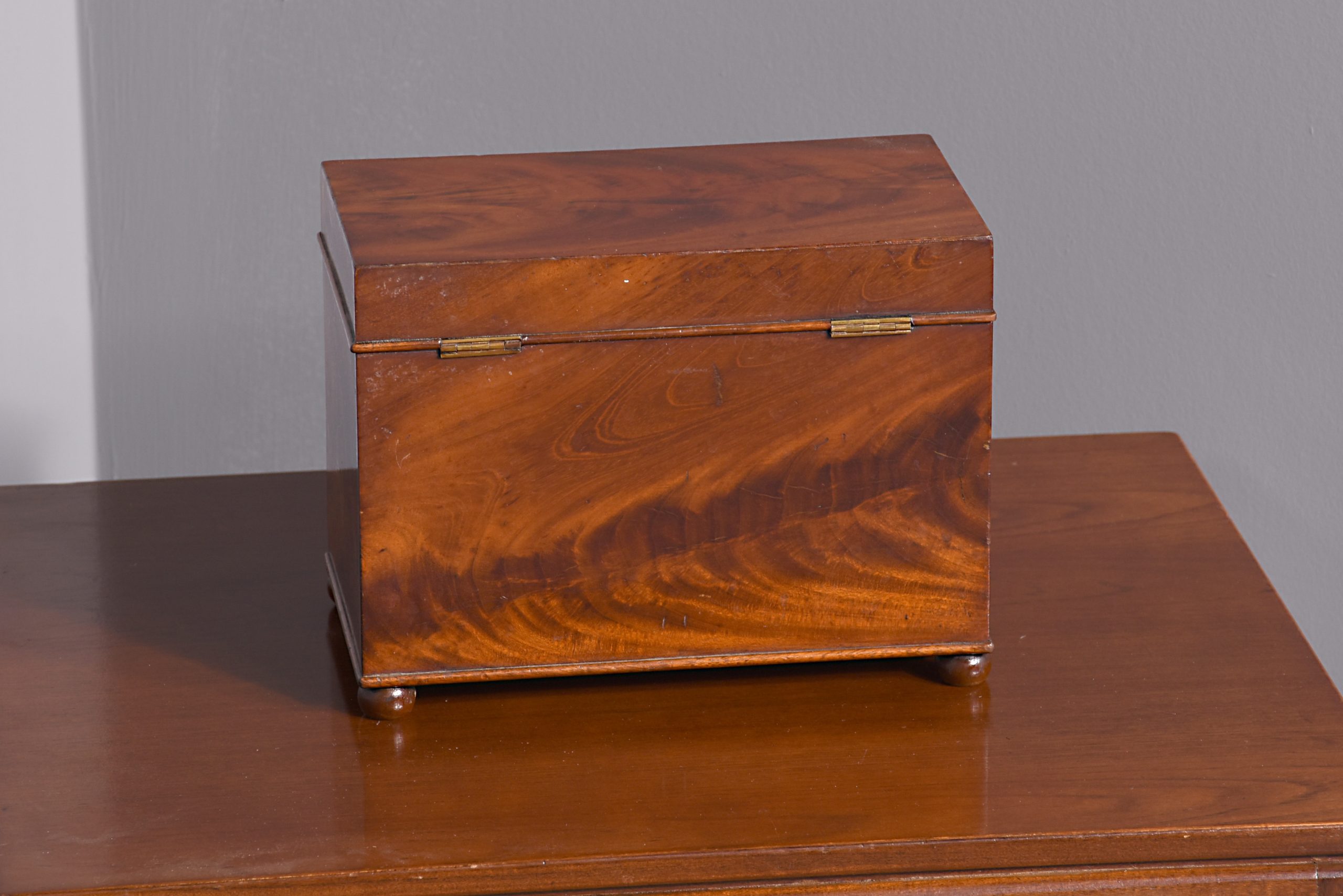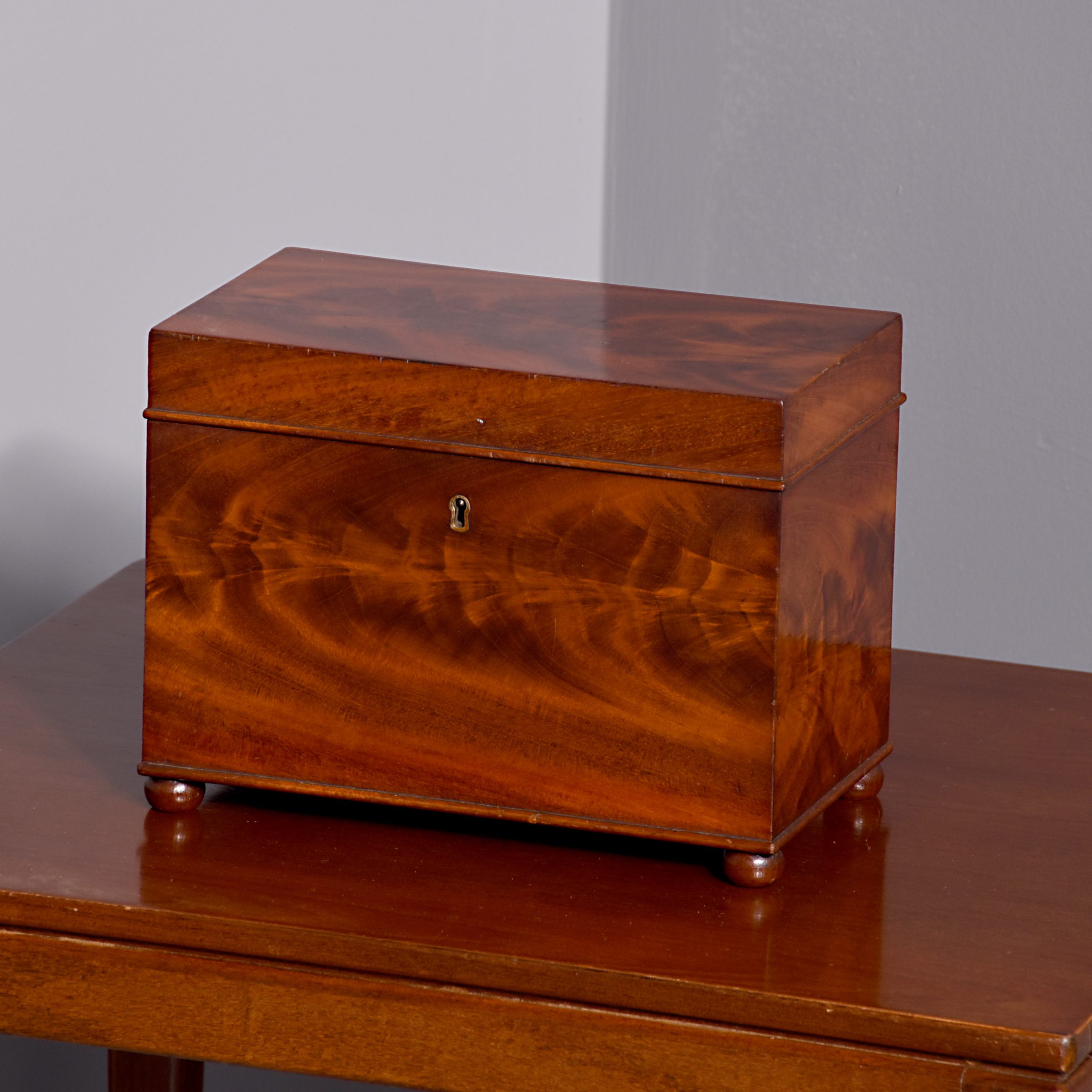 Circa 1830. A quality William IV mahogany box, the rectangular box with its fine flame mahogany top and facings, the deep hinged lid opens to reveal two removable compartments, the front with original brass escutcheon and simple beading to the base, all resting on four squat bun feet.