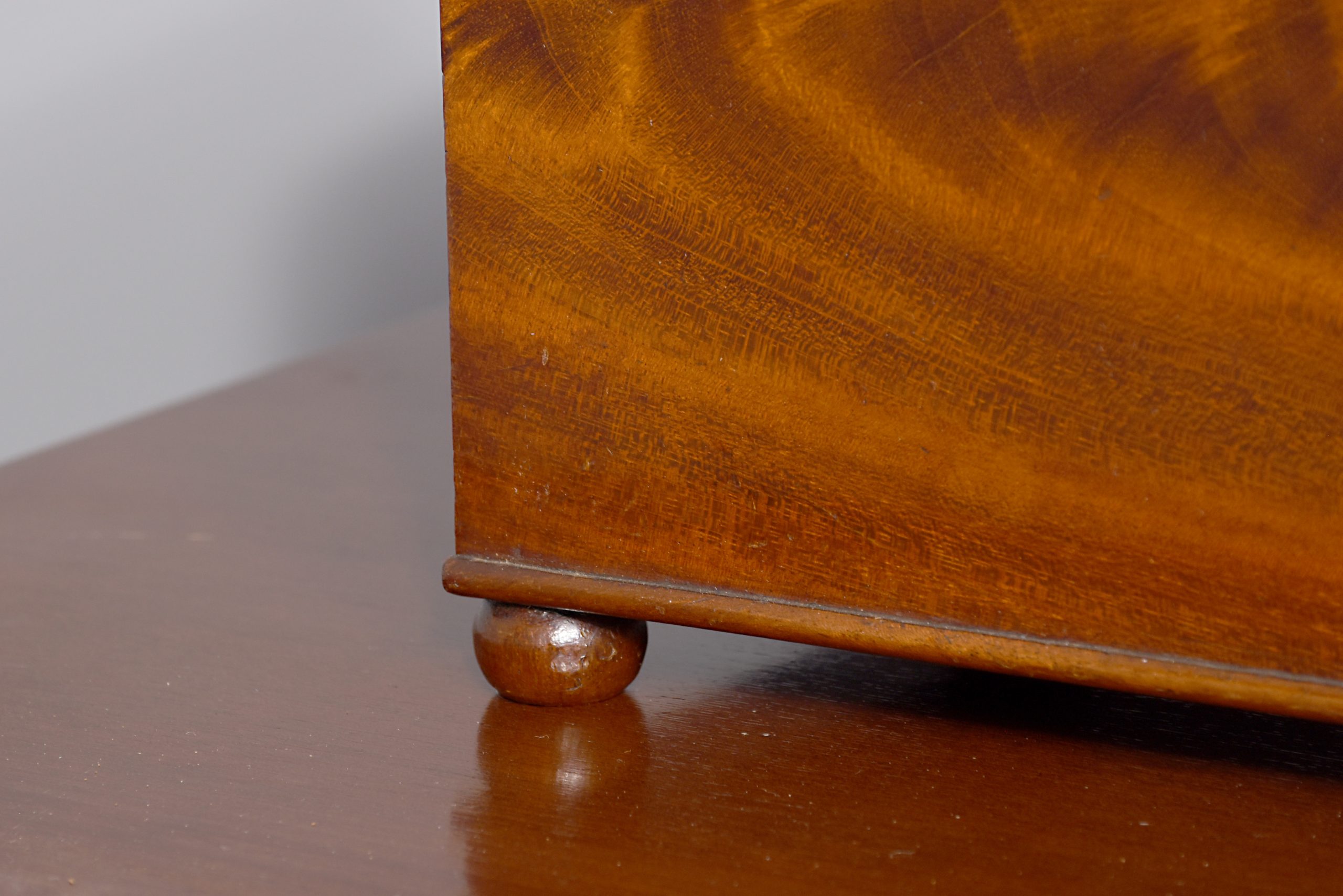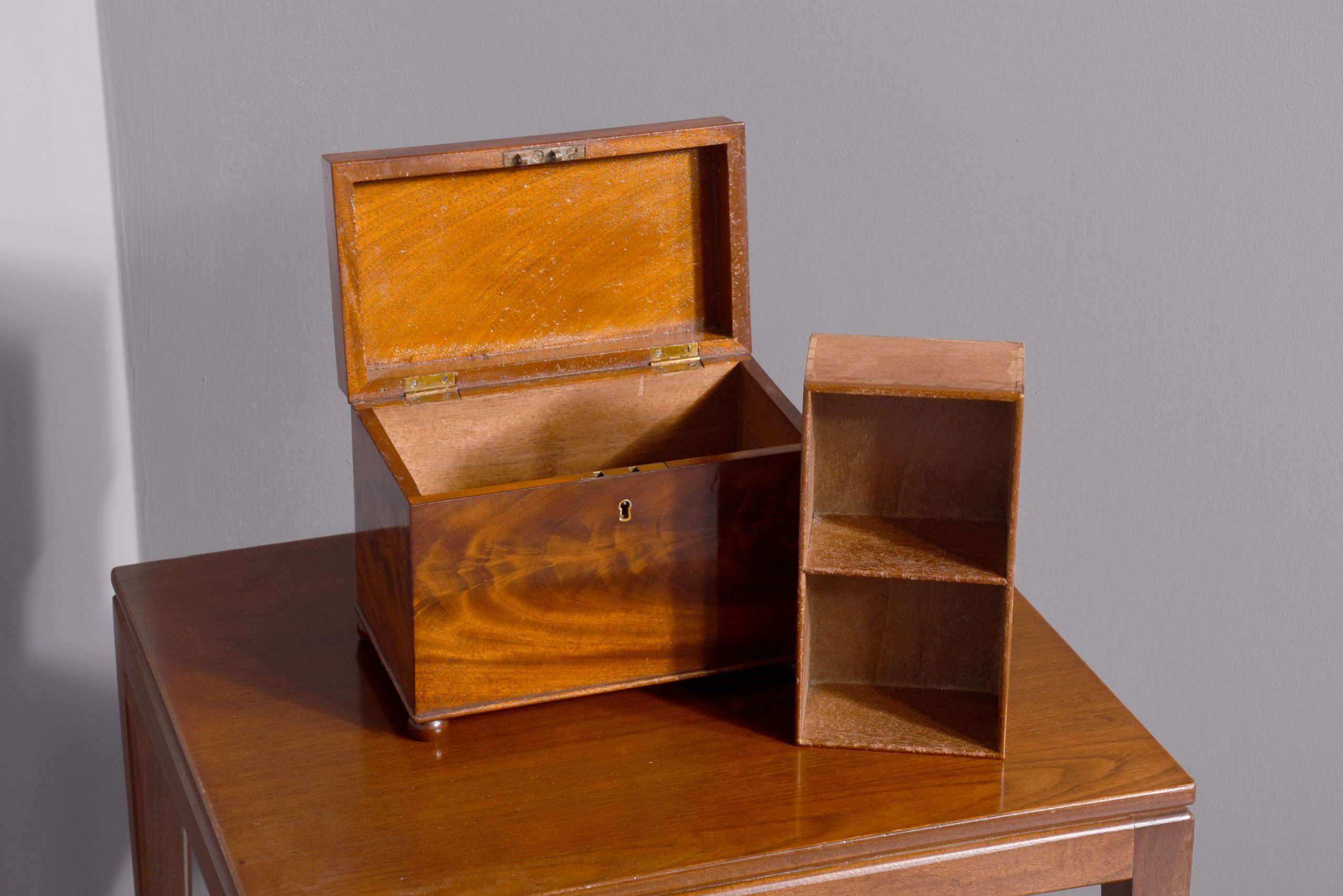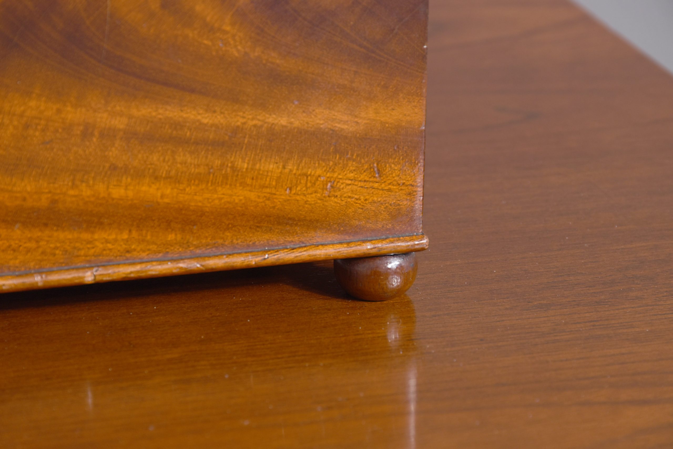 Circa 1830. A quality William IV mahogany box, the rectangular box with its fine flame mahogany top and facings, the deep hinged lid opens to reveal two removable compartments, the front with original brass escutcheon and simple beading to the base, all resting on four squat bun feet.