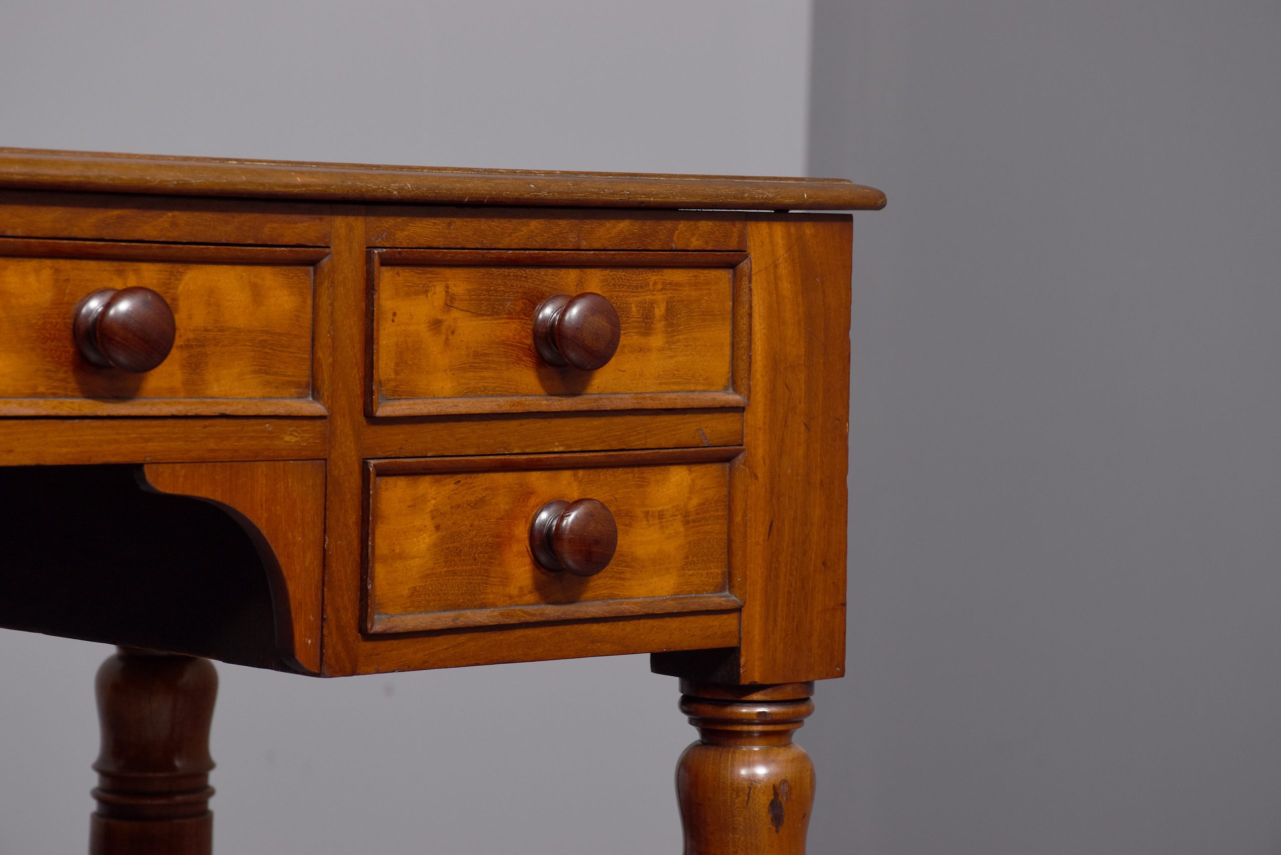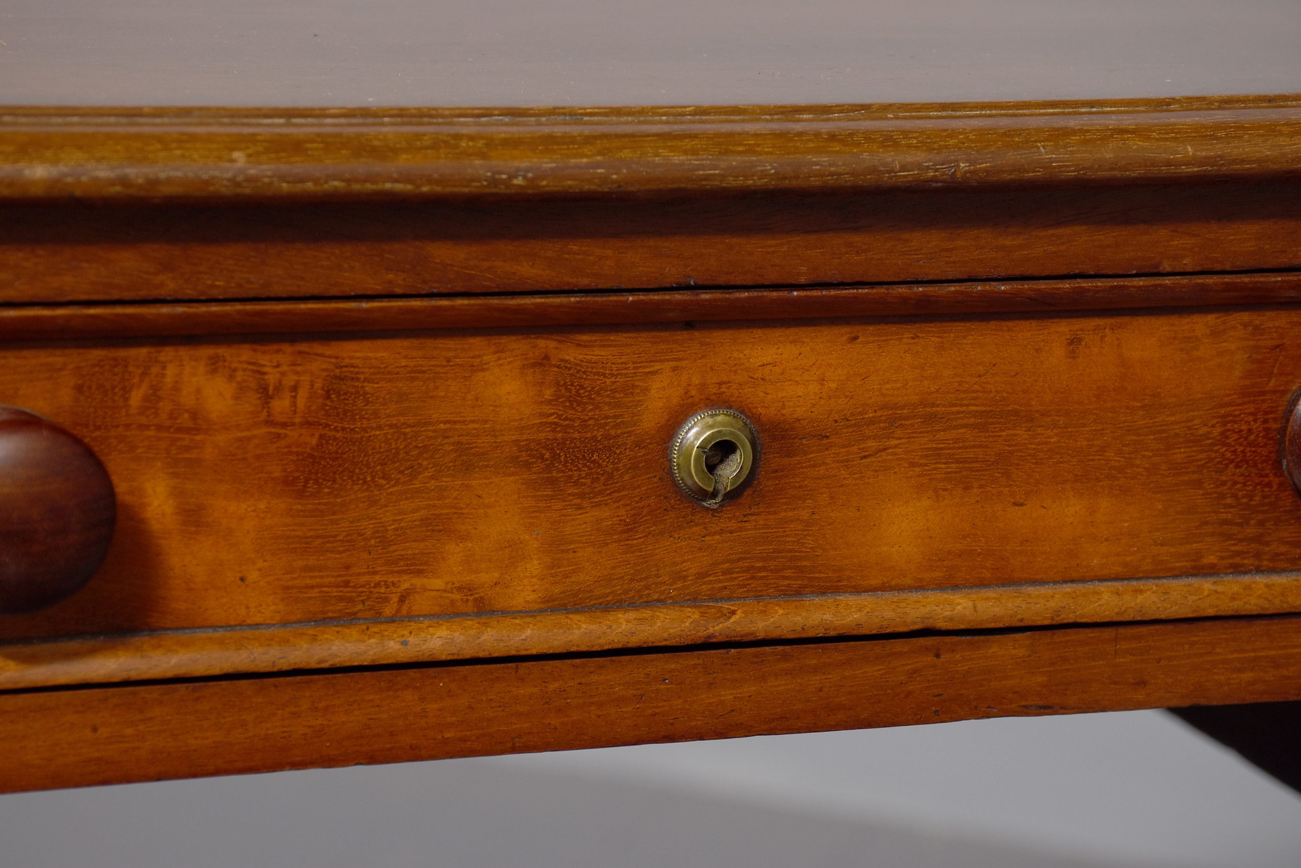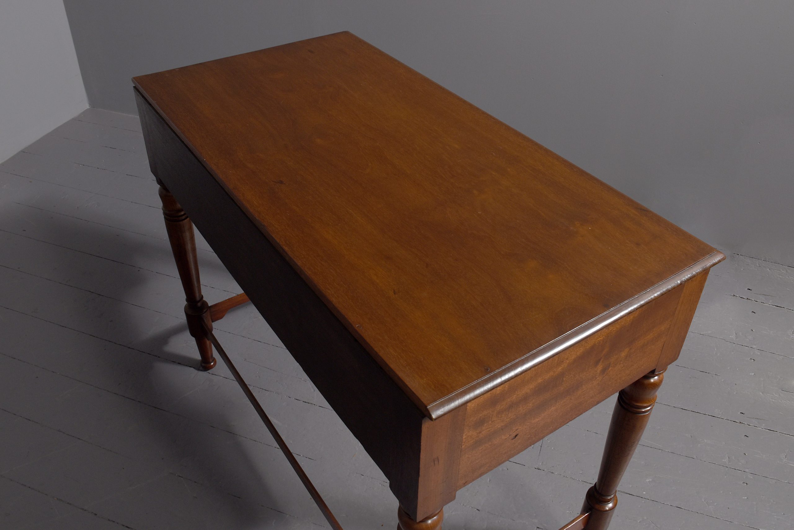 Circa 1840, William IV figured Spanish mahogany hall/side table. The figured rectangular shaped top with a moulded edge sits over 4 short and one long, mahogany lined frieze drawers, with moulded edges and a Bramah lock on centre drawer. Supported by very fine baluster and ring turned supports with three quarter stretchers.