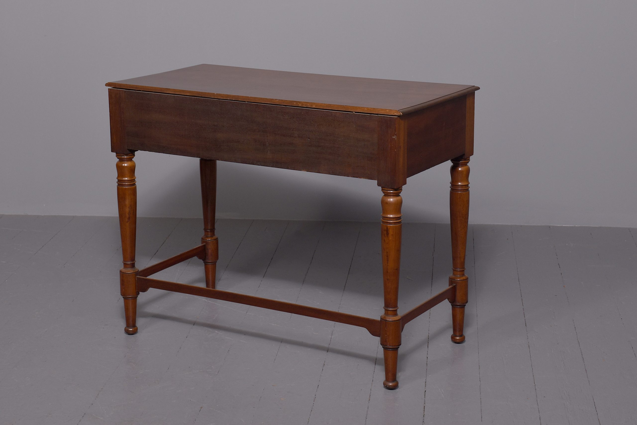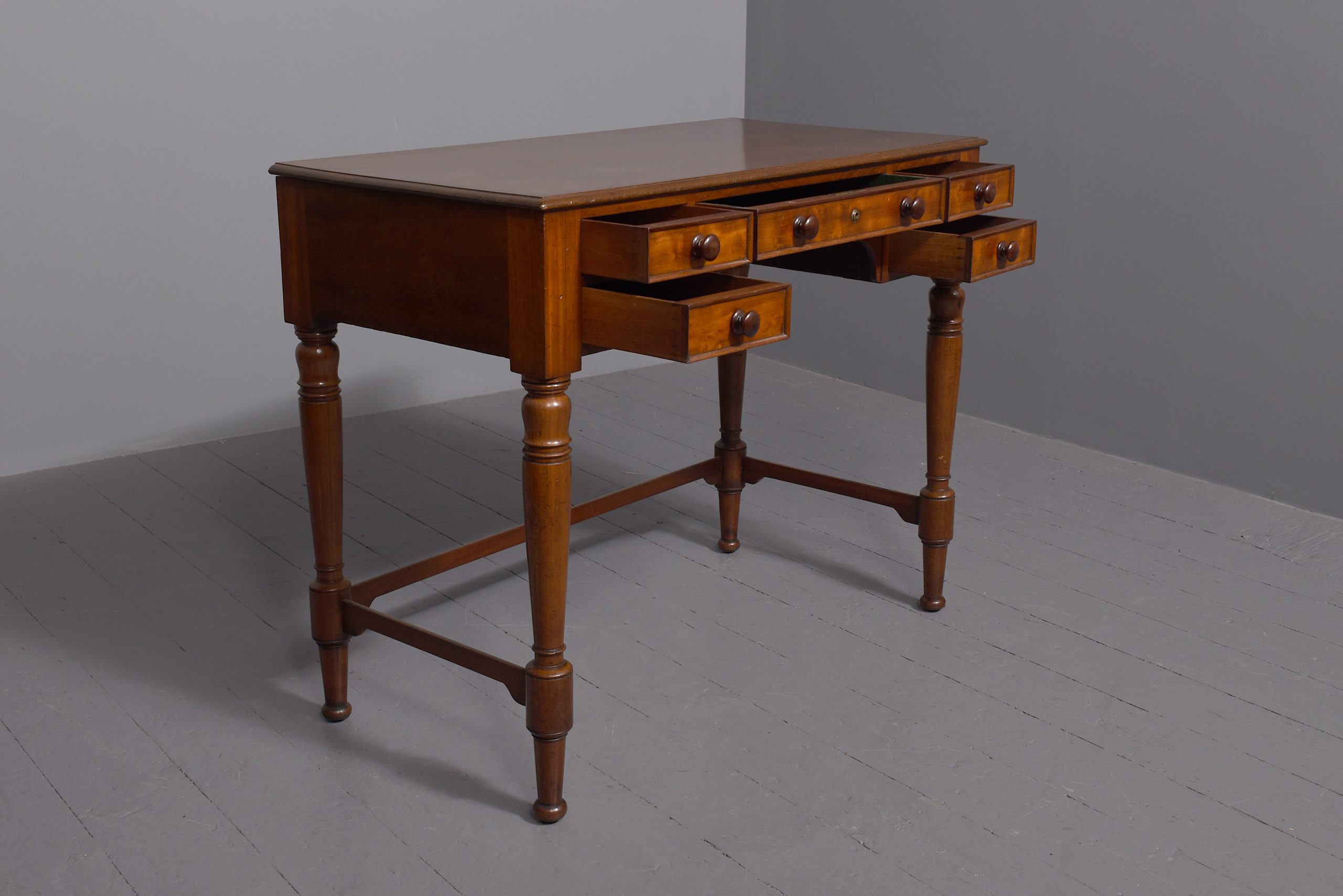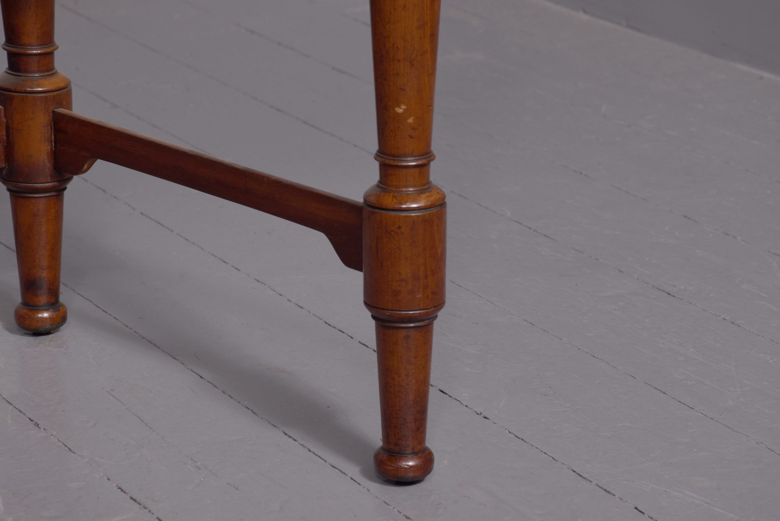 Circa 1840, William IV figured Spanish mahogany hall/side table. The figured rectangular shaped top with a moulded edge sits over 4 short and one long, mahogany lined frieze drawers, with moulded edges and a Bramah lock on centre drawer. Supported by very fine baluster and ring turned supports with three quarter stretchers.