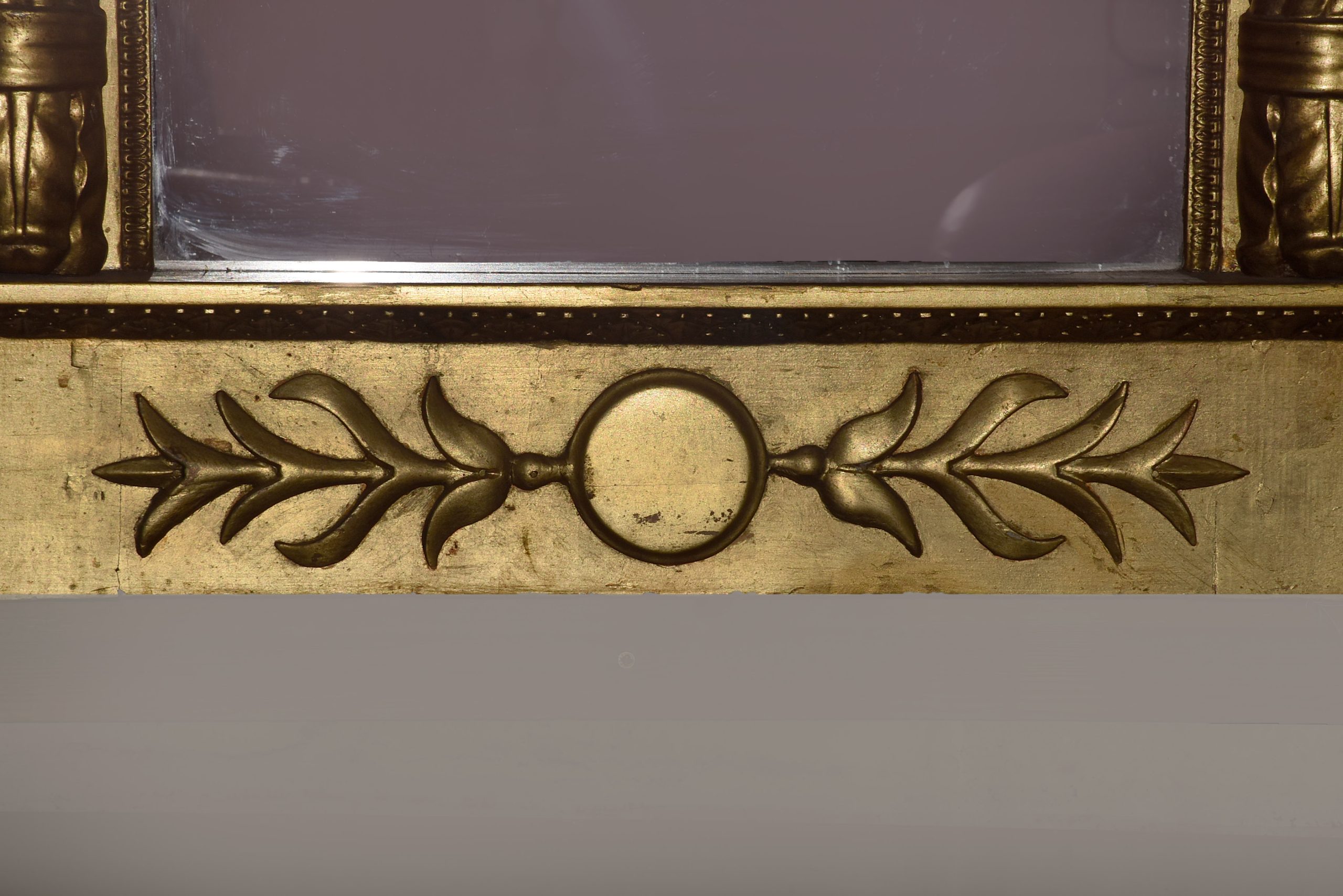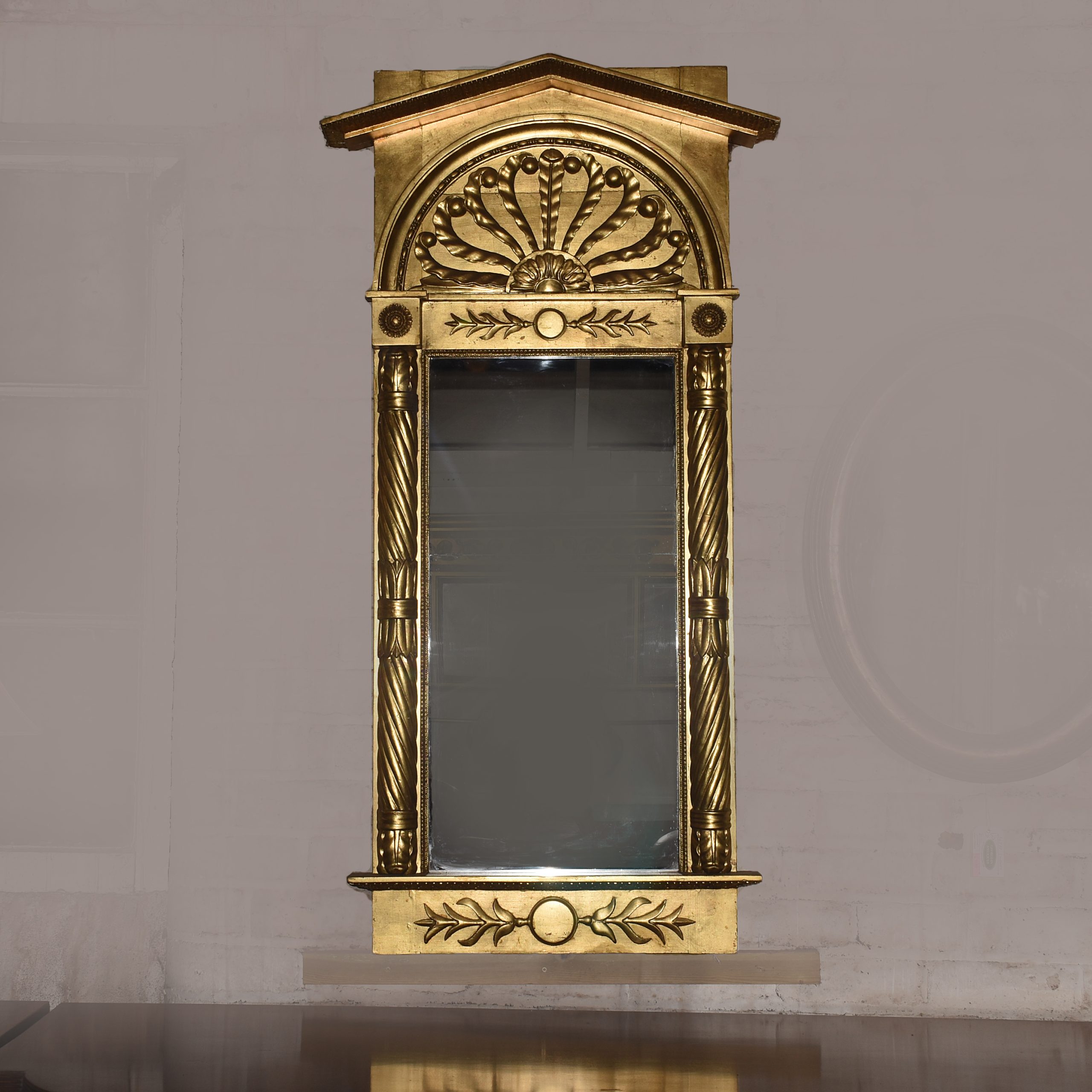 Circa 1830, unusual carved and gilded William IV mirror. With a carved and gilded architectural pediment above an arc section with a sunburst design. The 2 mirror plates are between William IV pilasters with acanthus leaves to the top, central foliate carving above a single shelf with a gilded apron.