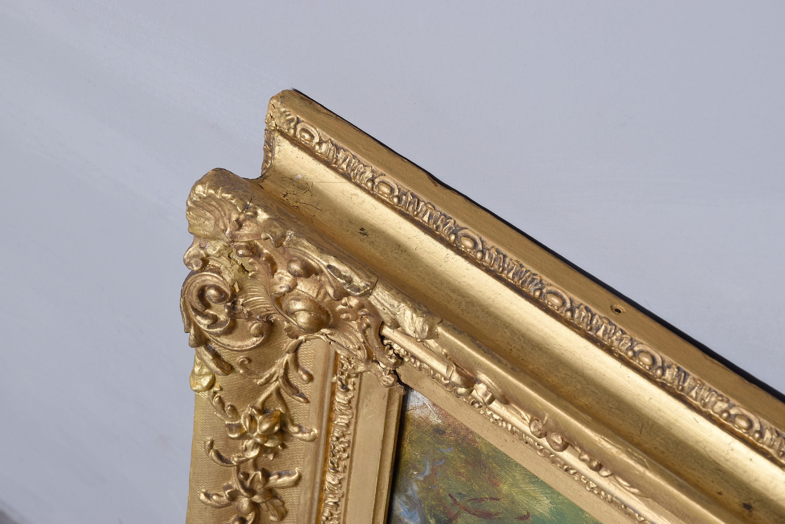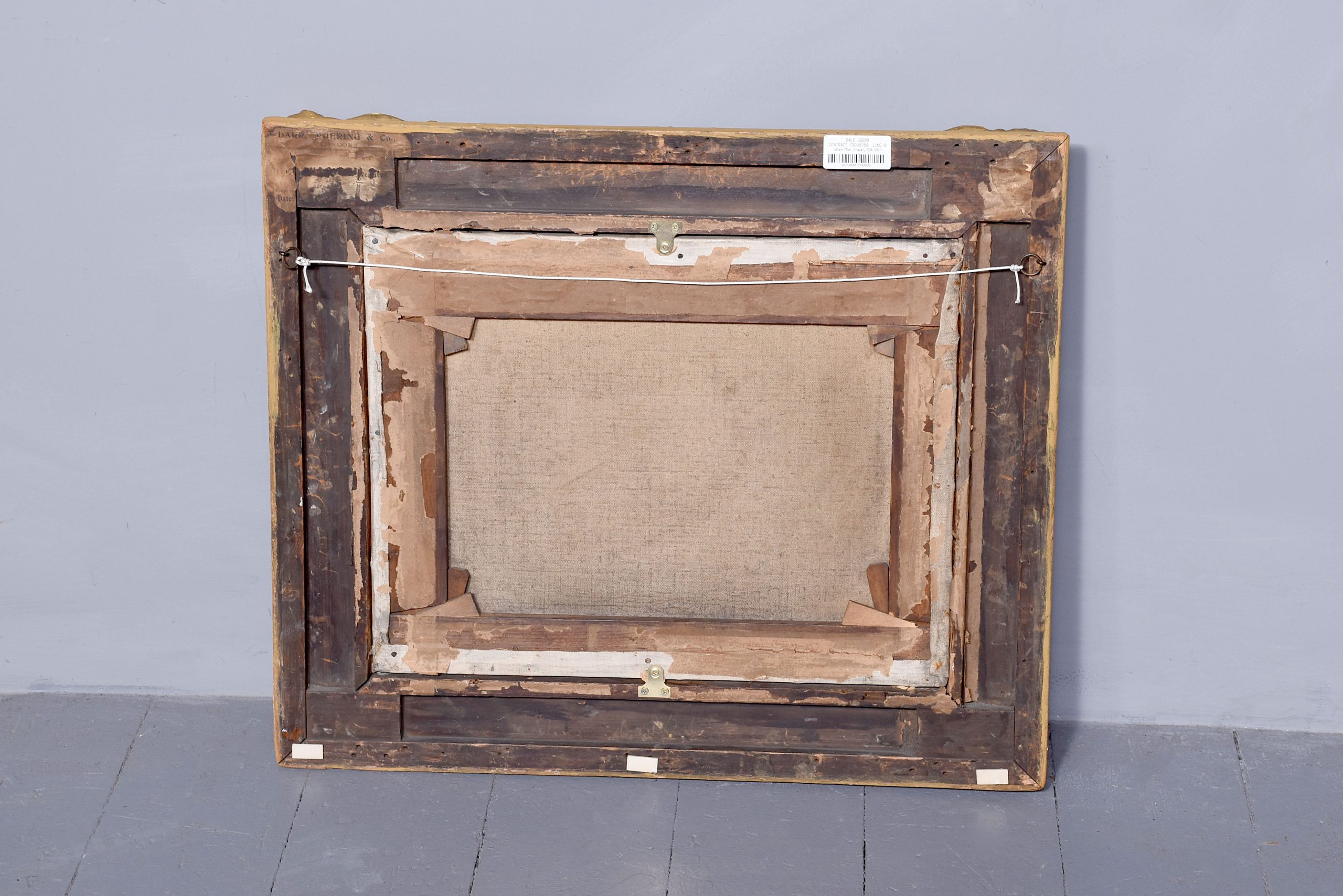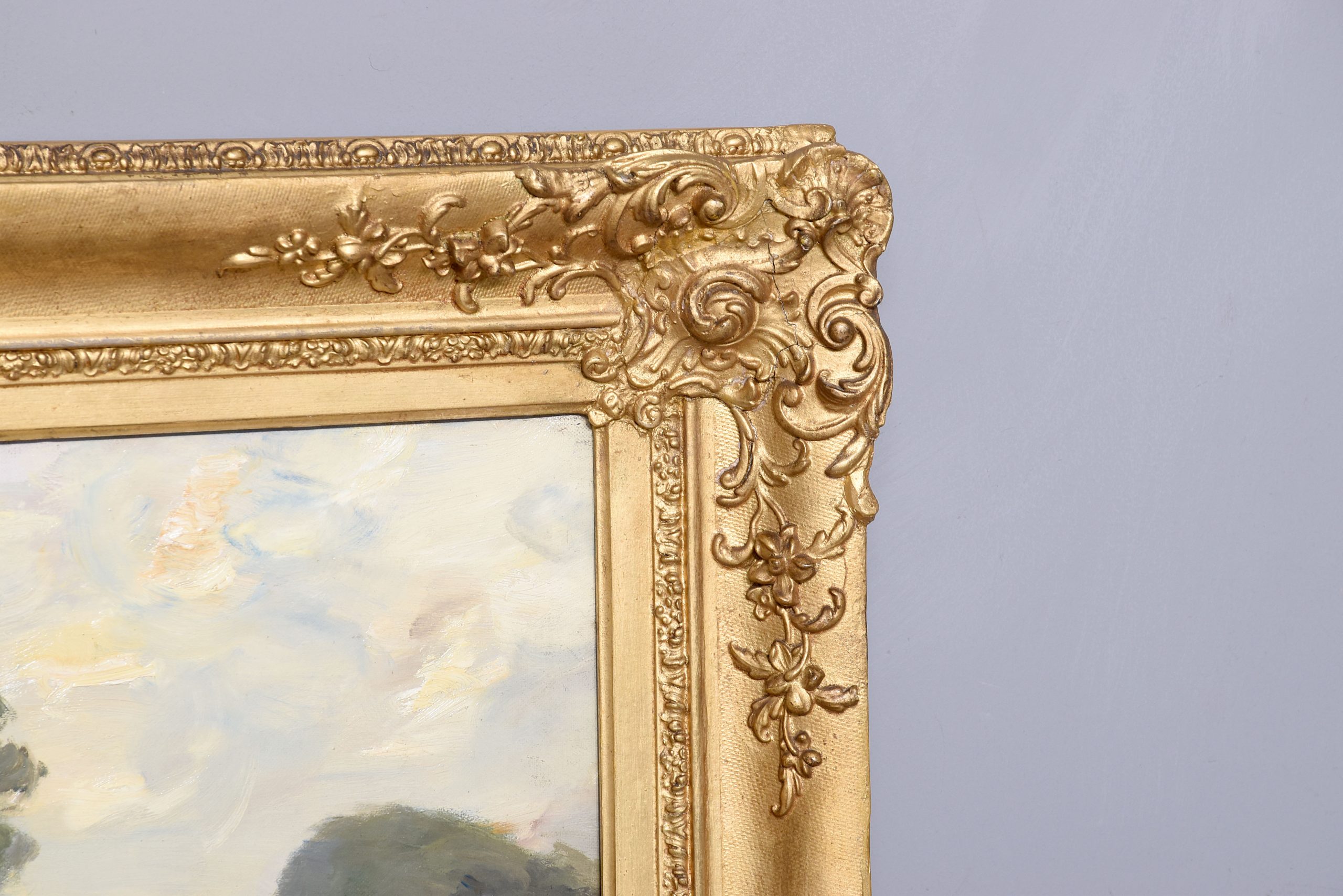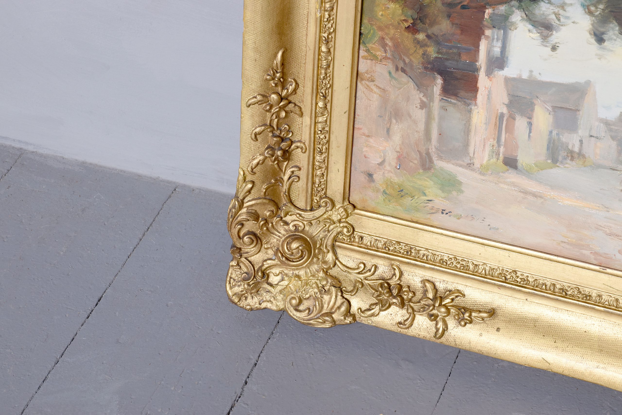 A dated oil painting by ‘William Millar Fraser’ dated 1913, oil painting depicts ‘Blakely in Norfolk’, with village scene beside the river with cottages, houses and person on a horse and people walking, in a classic carved and gilded frame, with the remnants of the original trade labels on the back.