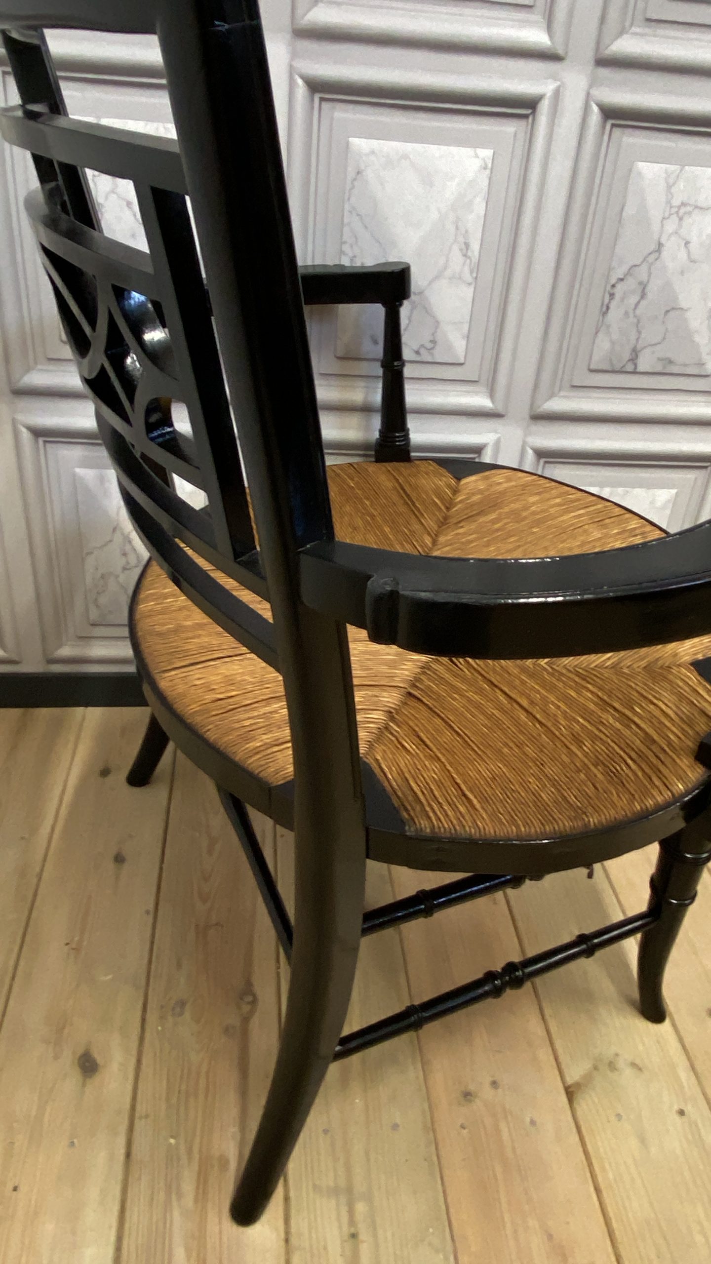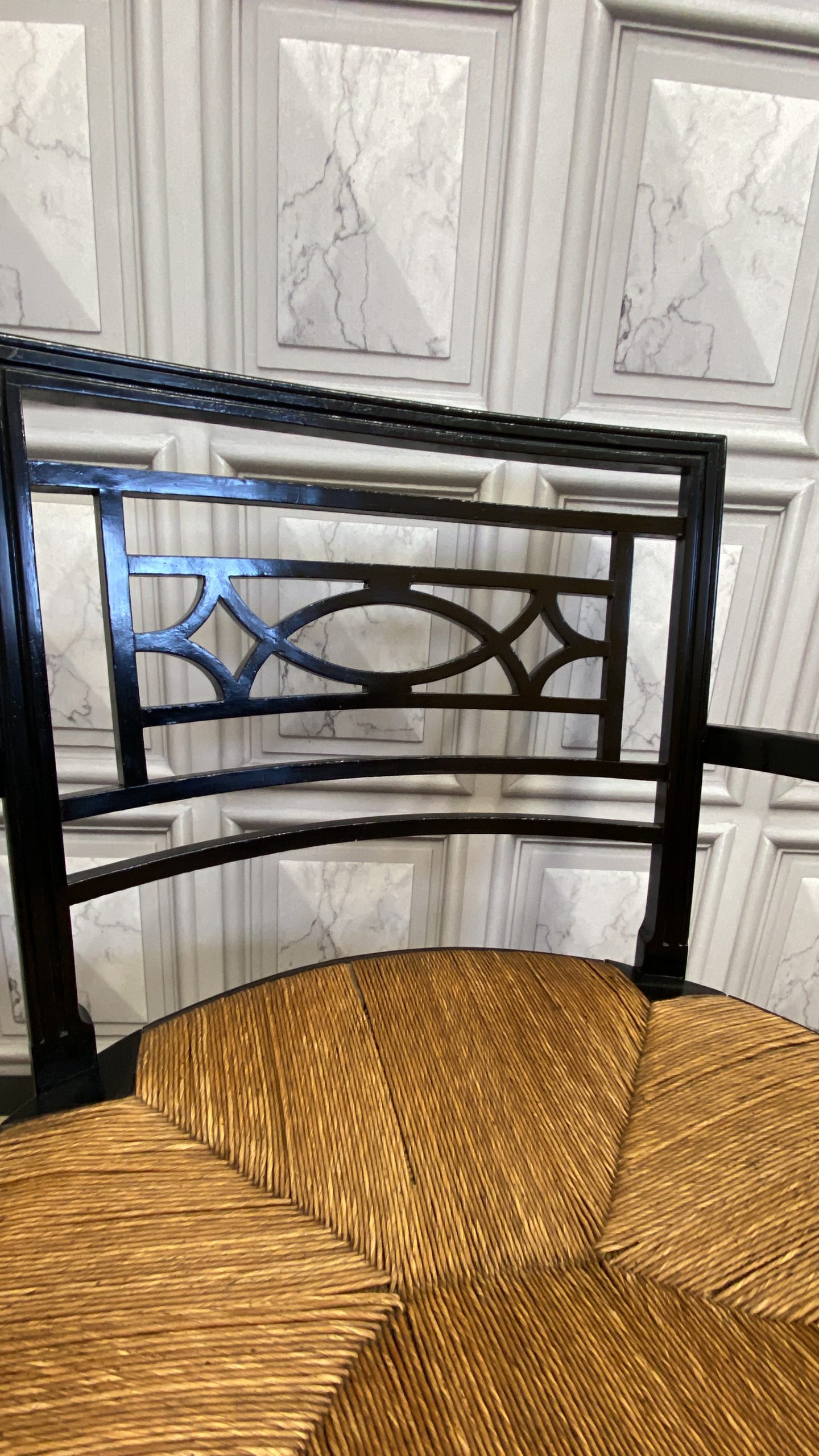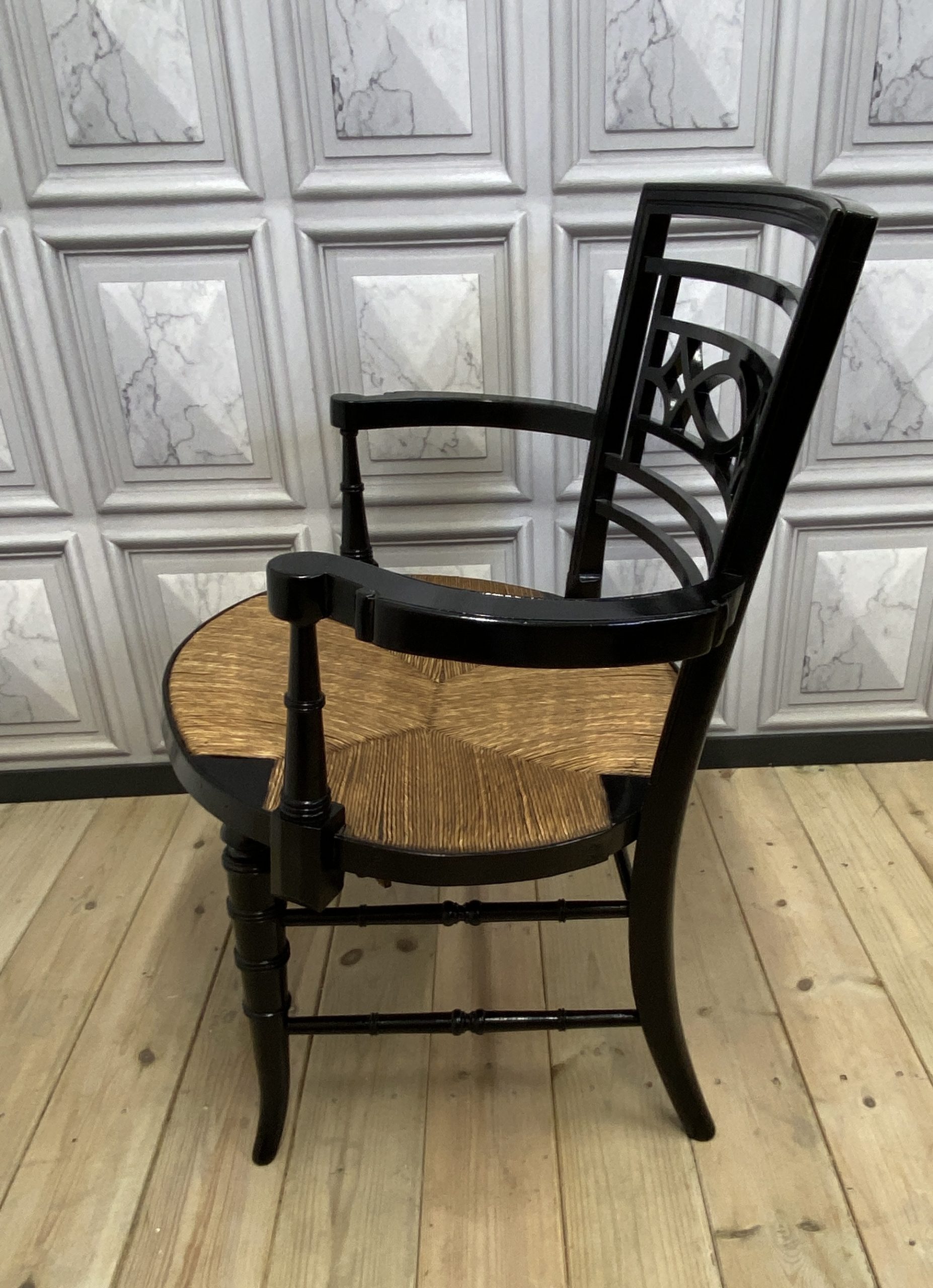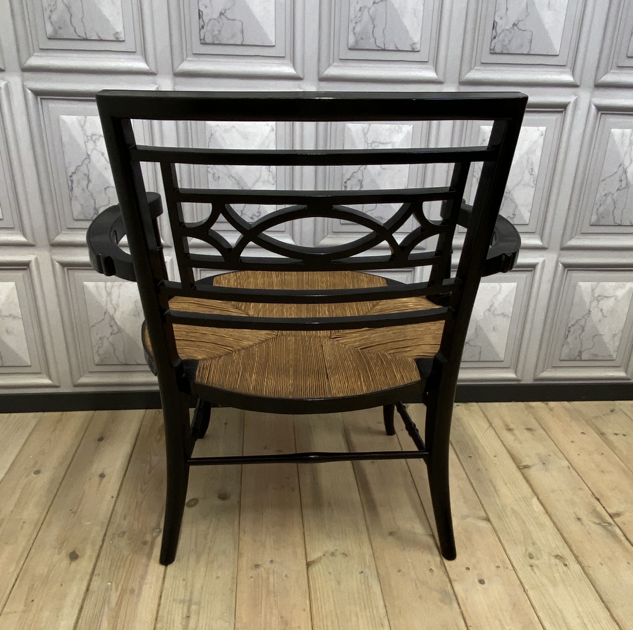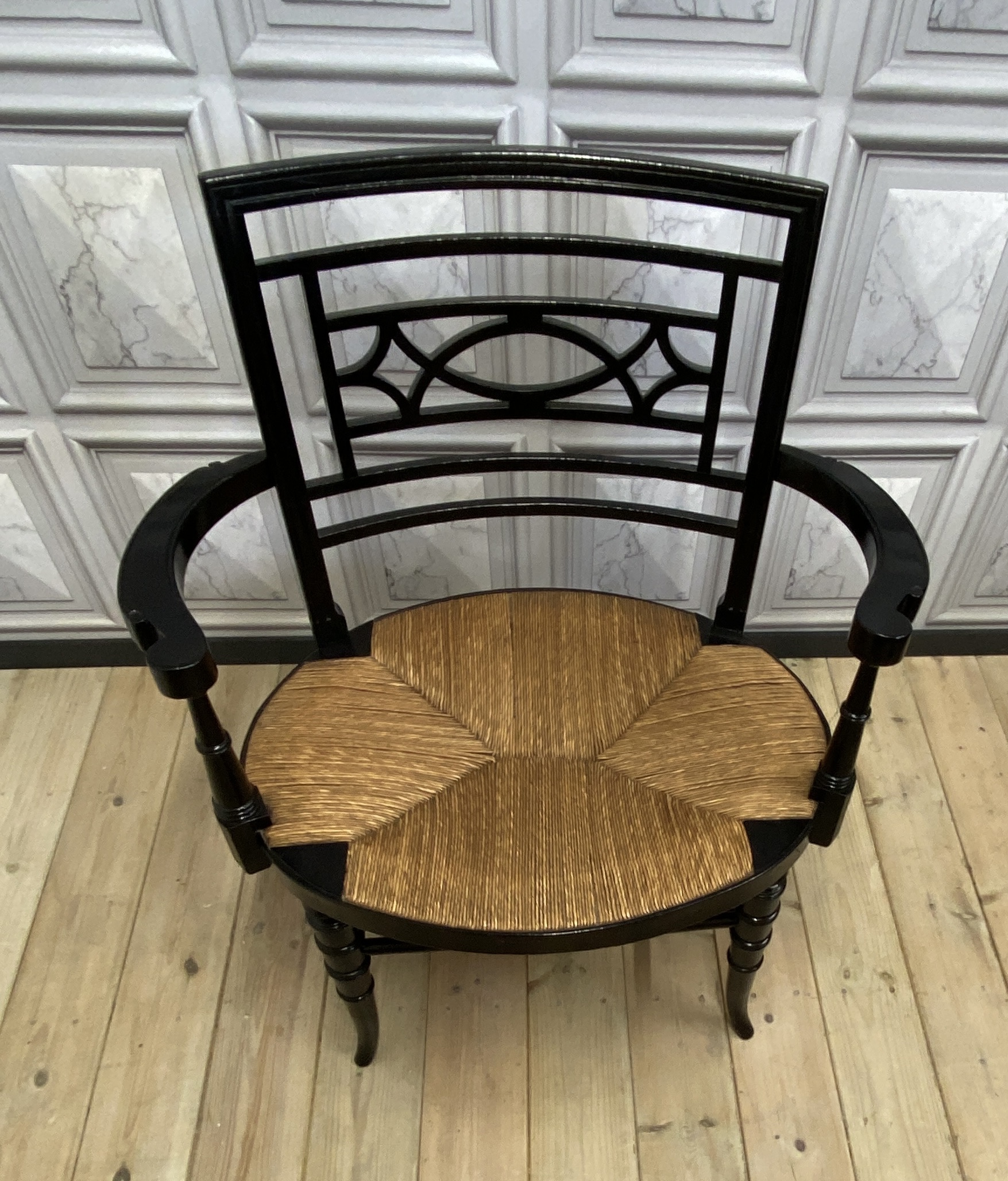 With nicely turned front legs and stretchers and a quarter pattern rush seat, and an impressive open design back panel.