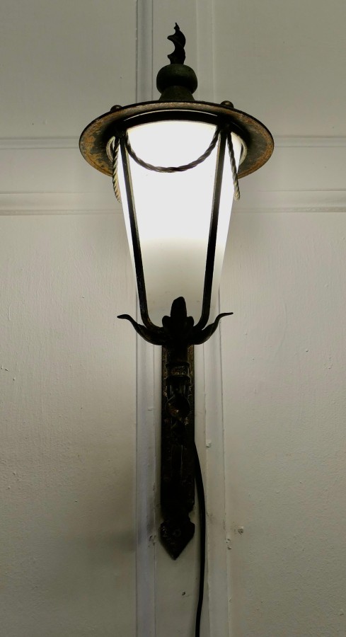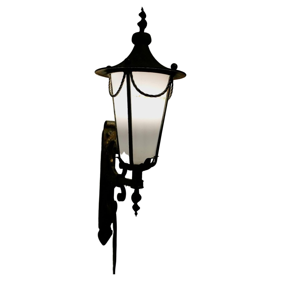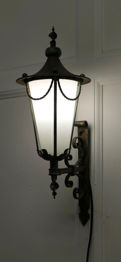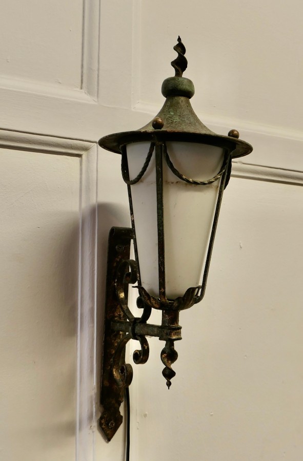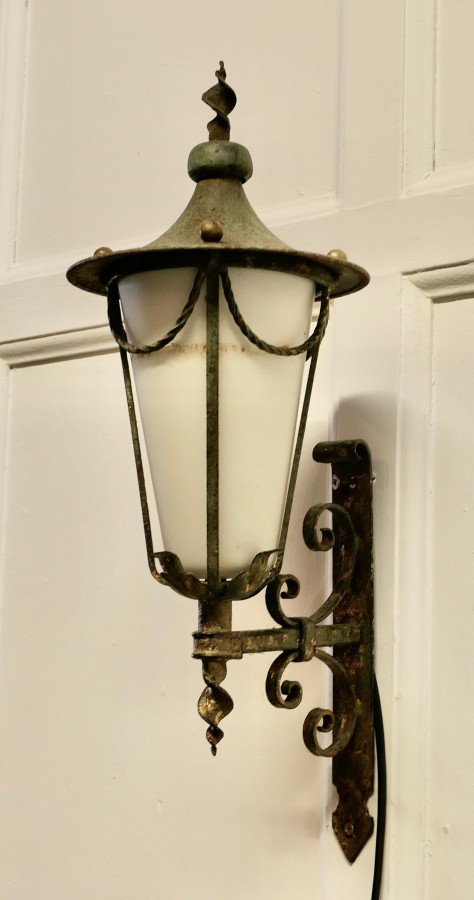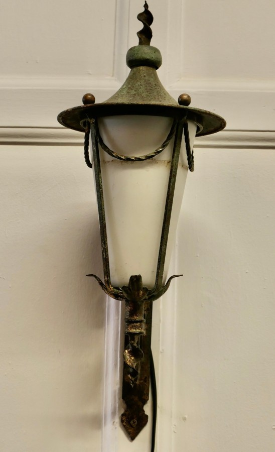 Wrought Iron and Opaque Wall Lantern This is a slim tall Wall Lantern it has a Verdigris colour, the Lamp has a conical opaque glass shade, it is hung out from the wall on a wrought iron bracket, The lamp is in working condition and will need to be connected to the electricity supply This is a superb piece of 19th century metal work there are no cracks in the glass The Lantern is 8” across at the wide part and 20” high and is sits 10” out from the wall TSC49 Manufacture Date : 1930 Materials : Iron