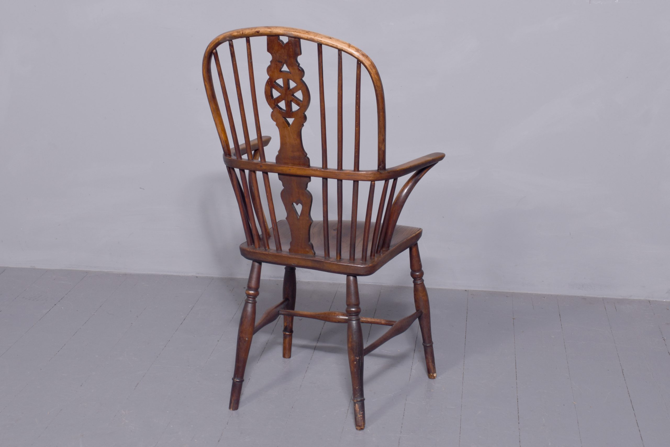 Circa 1860. A mid Victorian elm and yew wood combed back Windsor chair of classical form, the arched top with the pierced splat with wheel in center with a proud rondel supported on six spindles, the central section which forms the arms, supported on curved uprights and balustrades, the solid elm scooped seat with scribed fore-edge, all resting on four turned ring turned tapering legs which are slightly splayed, l braced by conforming stretchers.
